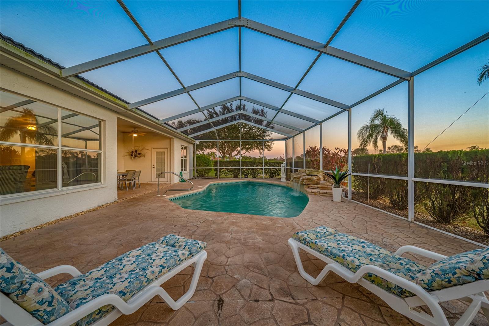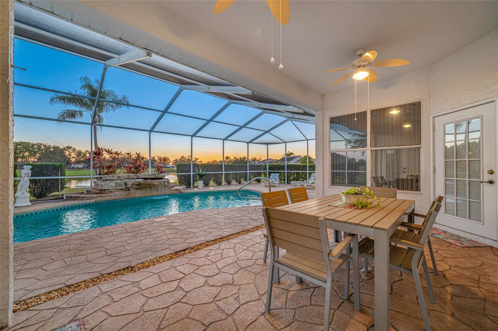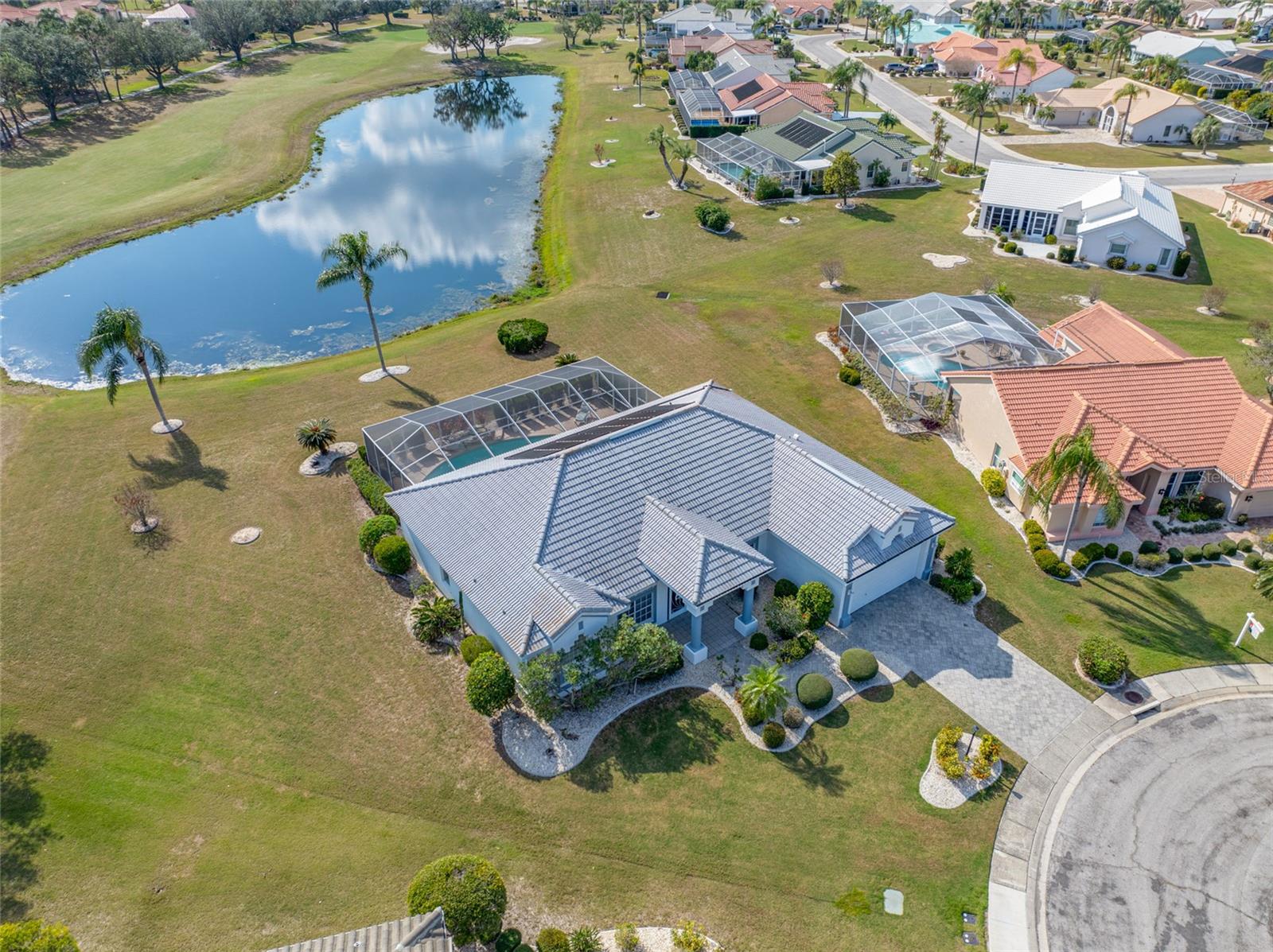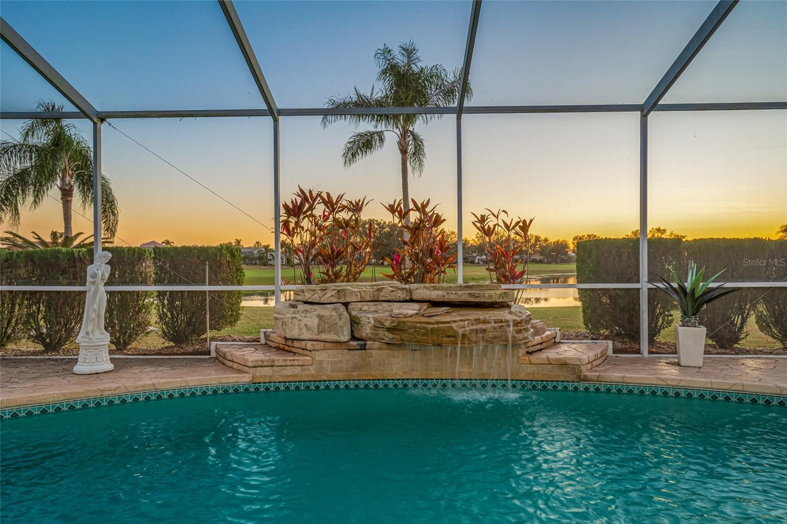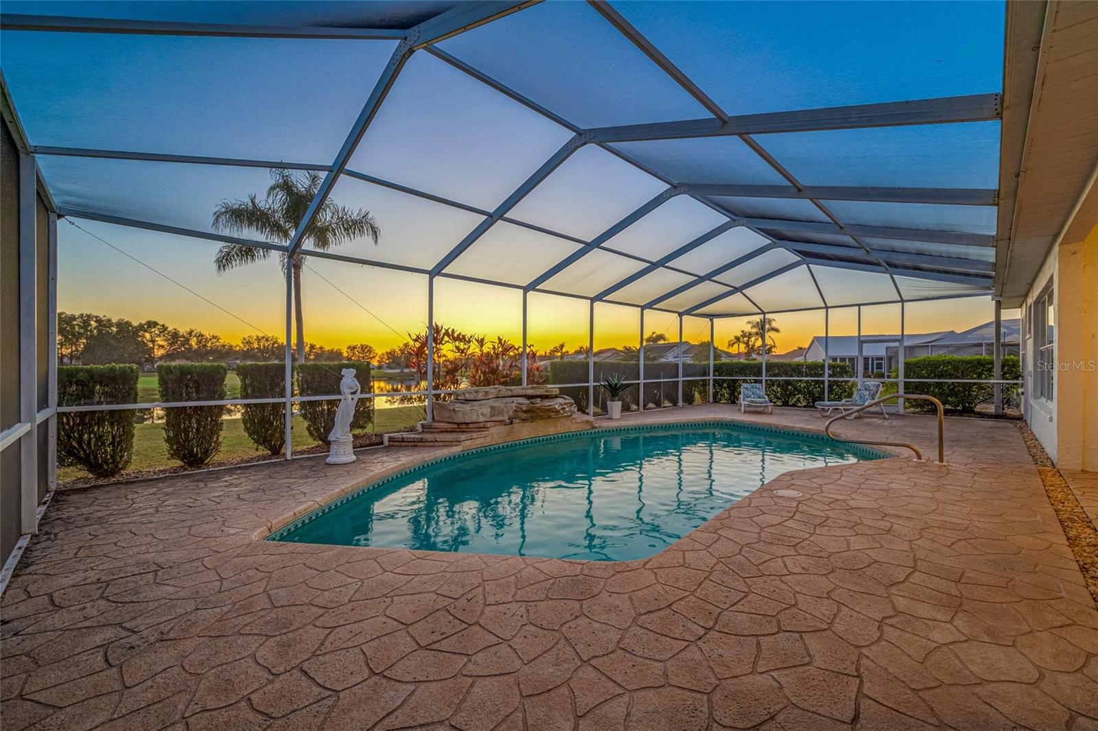Serene Waterfall Pool Home at the End of Cul-de-Sac.... Do you enjoy tranquility, relaxing to the sounds of a waterfall, enjoying your favorite beverage while gazing at amazing sunset views and a wide variety of activities at your doorstep? Welcome to your dream tropical oasis nestled at the end of a tranquil cul-de-sac!..... You will fall in love with this waterfall pool home because: it boasts: 3 beds, 2 baths, plus an office...Oversized cul-de-sac lot.. Breathtaking views of a serene pond and lush golf course...Swimming year round with your solar-paneled pool...Perfect for relaxation and entertainment complete with amazing views...Paver driveway with elegant entrance and spacious open floor plan...Generous living with 2 dining spaces and gourmet kitchen... Large windows bathing the space in natural light...Brand new carpeting and dishwasher...Refrigerator, washer, A/C , less than 3 years old... Newer tile roof...Luxurious primary suite, featuring an ensuite bath with direct access to the pool area, perfect for morning dips or evening stargazing...Expansive patio surrounding the shimmering pool, with an idyllic setting for barbeques, pool parties, or simply enjoying your surroundings...Best of both worlds—privacy and picturesque views with lots of Florida wildlife to watch... Vibrant Del Webb 55+ community offering golf, pickleball, lawn-bowling, tennis, 3 pools, huge recreational room, dog park,state-of-the art fitness center and 120+ clubs with year round activities.... Join the Travel Club and leave your car at home. TURN KEY Move in ready all furnishings included. What are you waiting for........ your DREAM HOME is waiting for YOU!!! Call TODAY to schedule your private showing!
