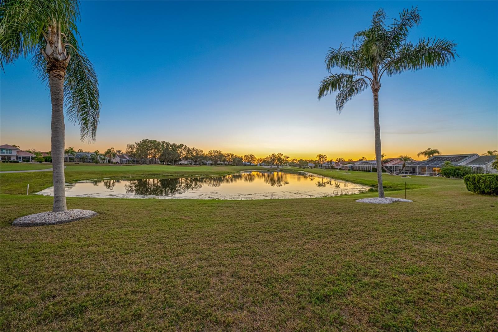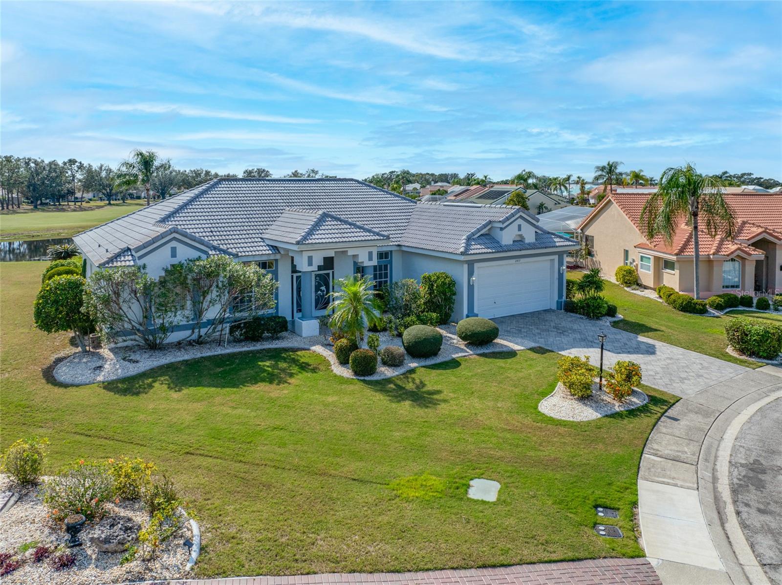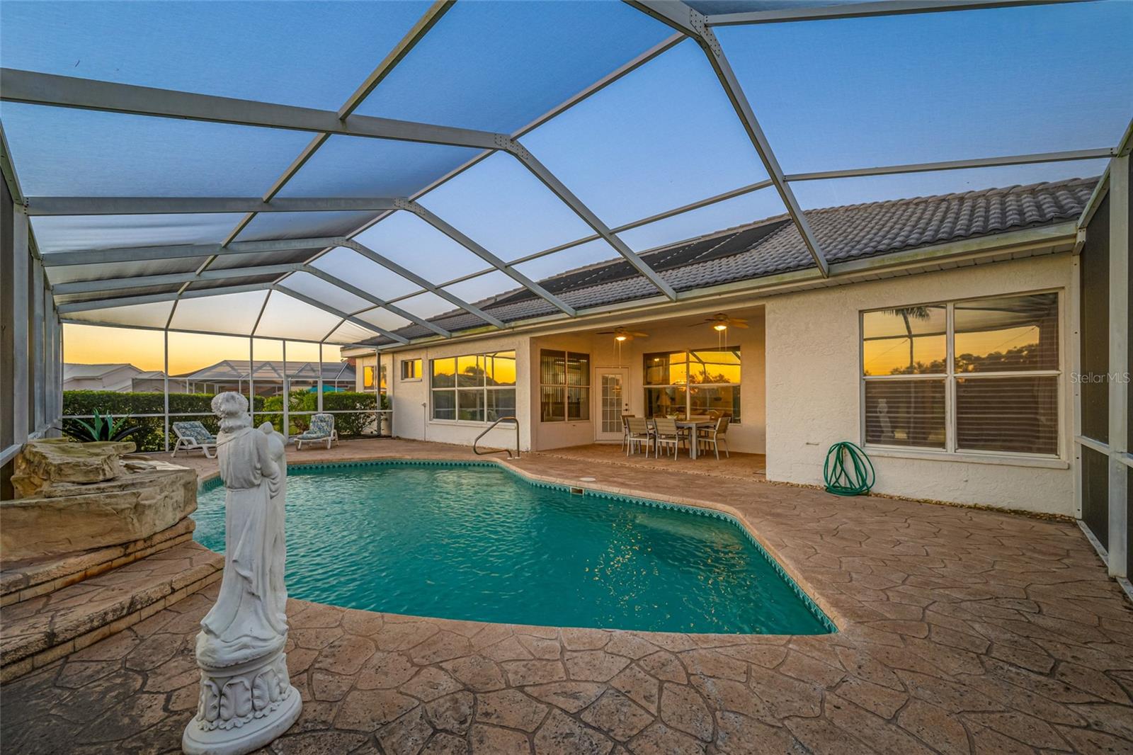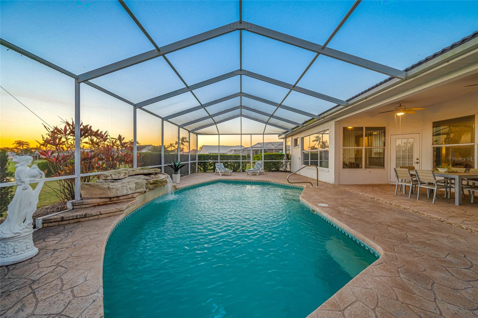 Serene Waterfall Pool Home at the End of Cul-de-Sac.... Do you enjoy tranquility, relaxing to the sounds of a waterfall, enjoying your favorite beverage while gazing at amazing sunset views and a wide variety of activities at your doorstep? Welcome to your dream tropical oasis nestled at the end of a tranquil cul-de-sac!..... You will fall in love with this waterfall pool home because: it boasts: 3 beds, 2 baths, plus an office...Oversized cul-de-sac lot.. Breathtaking views of a serene pond and lush golf course...Swimming year round with your solar-paneled pool...Perfect for relaxation and entertainment complete with amazing views...Paver driveway with elegant entrance and spacious open floor plan...Generous living with 2 dining spaces and gourmet kitchen... Large windows bathing the space in natural light...Brand new carpeting and dishwasher...Refrigerator, washer, A/C , less than 3 years old... Newer tile roof...Luxurious primary suite, featuring an ensuite bath with direct access to the pool area, perfect for morning dips or evening stargazing...Expansive patio surrounding the shimmering pool, with an idyllic setting for barbeques, pool parties, or simply enjoying your surroundings...Best of both worlds—privacy and picturesque views with lots of Florida wildlife to watch... Vibrant Del Webb 55+ community offering golf, pickleball, lawn-bowling, tennis, 3 pools, huge recreational room, dog park,state-of-the art fitness center and 120+ clubs with year round activities.... Join the Travel Club and leave your car at home. TURN KEY Move in ready all furnishings included. What are you waiting for........ your DREAM HOME is waiting for YOU!!! Call TODAY to schedule your private showing!
