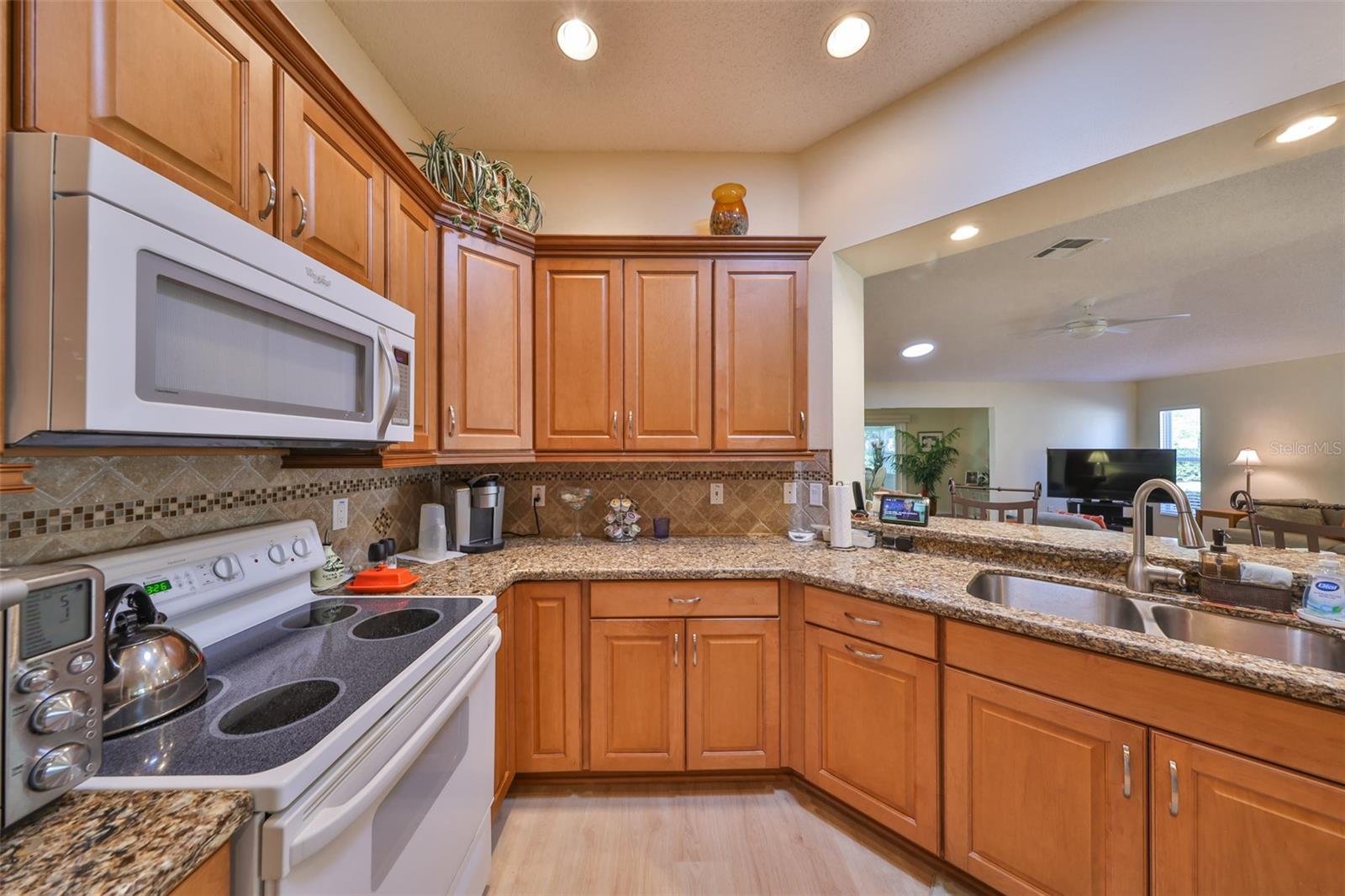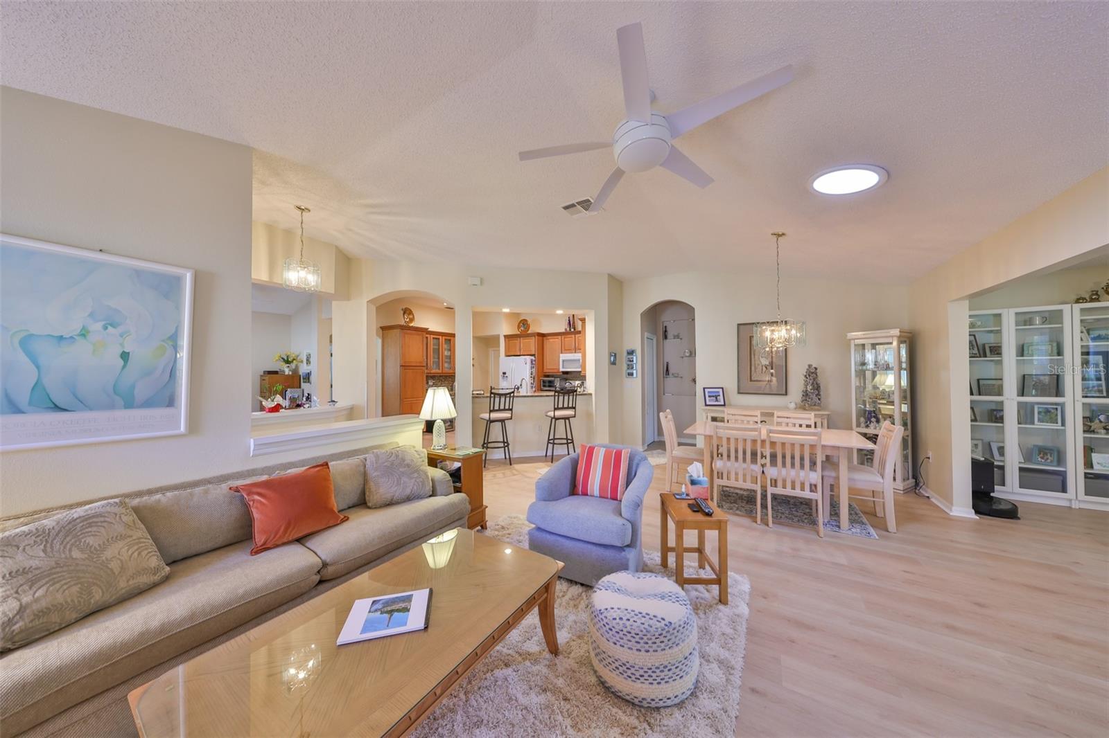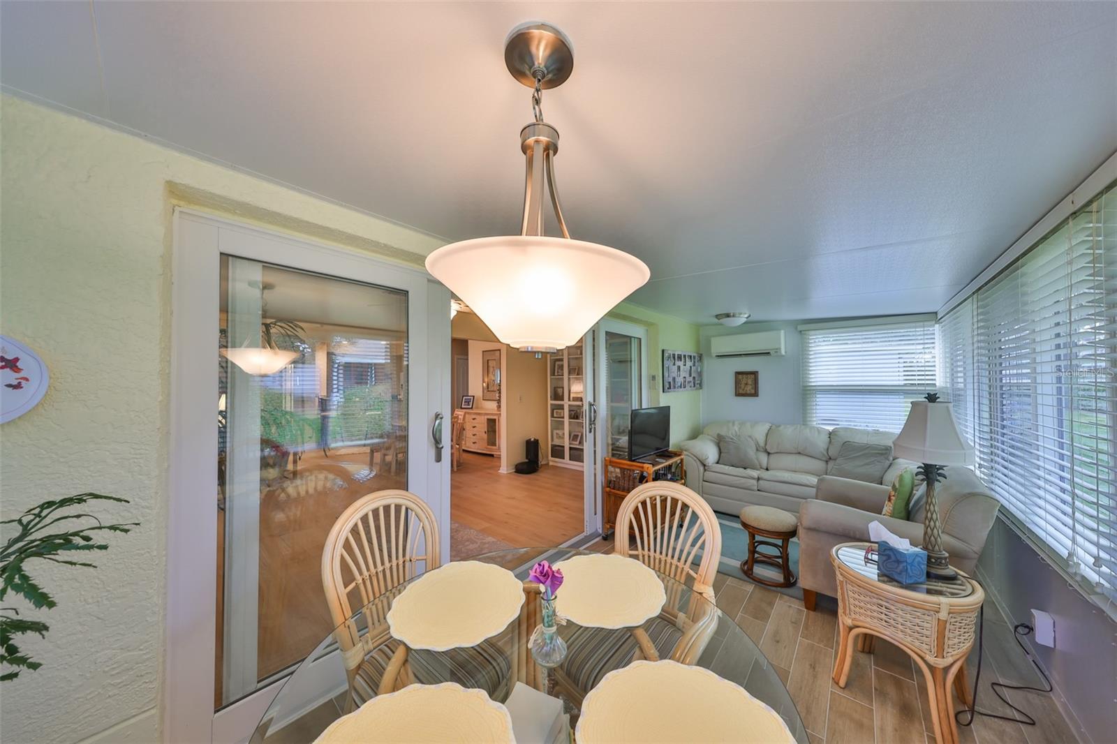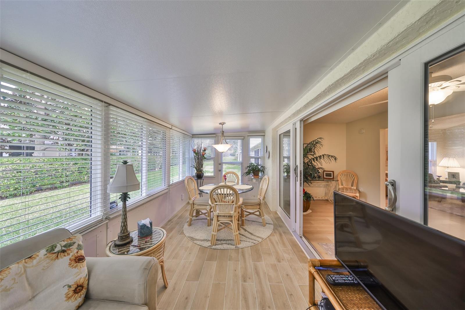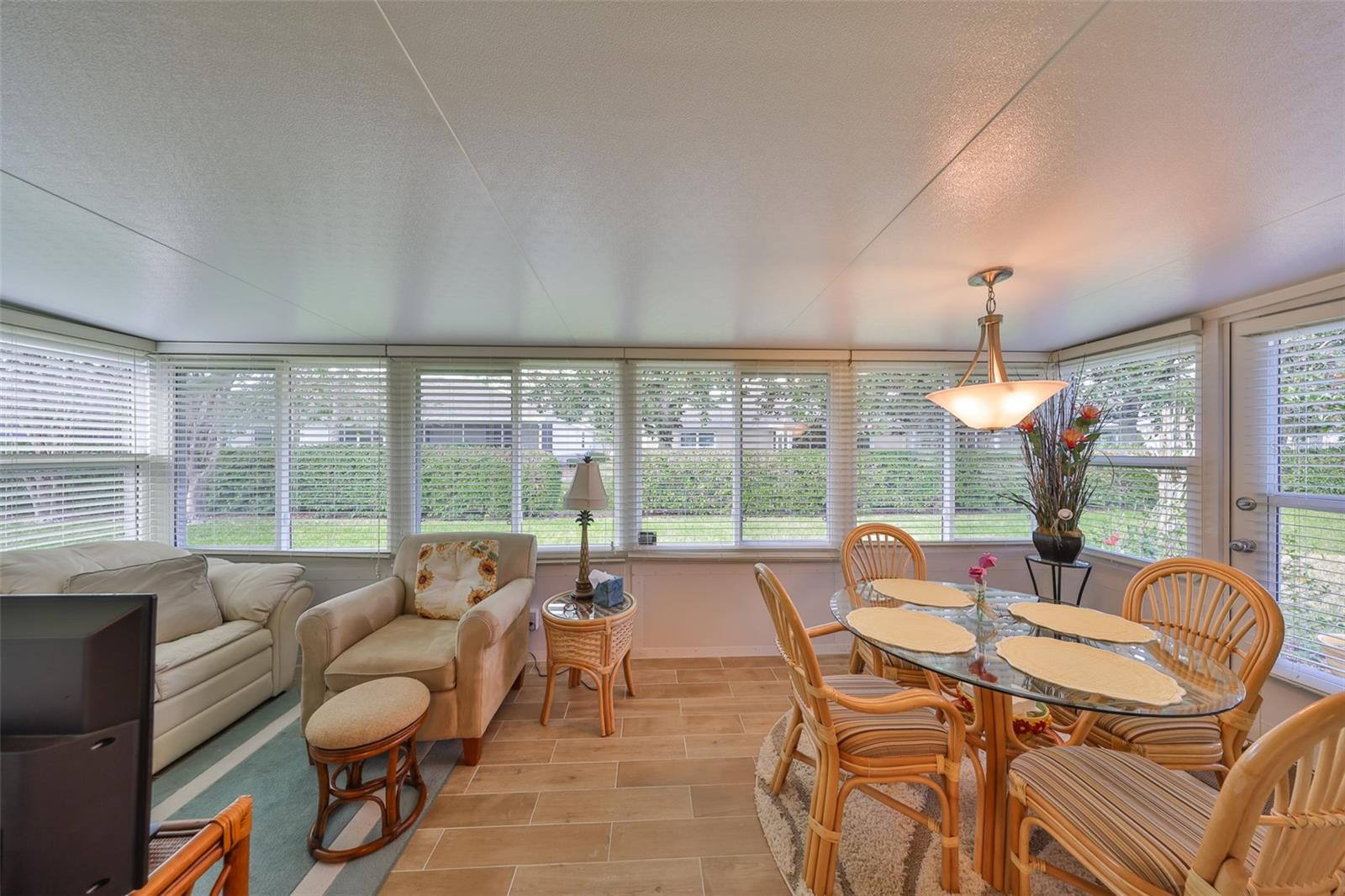 TERRIFIC PRICE IMPROVEMENT FOR THIS BEAUTIFULLY UPDATED CONDO FEATURING AN 8 X 20 NEWER FLORIDA ROOM, PLUS GOLF CART! Enjoy the fun Florida lifestyle in the GATED & MAINTENANCE FREE 55+ community of Kings Point in Sun City Center, FL, where you'll feel like you're on vacation every day. Nestled in a lovely, "pet friendly" neighborhood, this immaculate & well maintained, 2 bed/2 bath & den, FULLY FURNISHED condo has a modern, open floorplan, high ceilings, 3 SOLAR TUBES for extra natural light, LUXURY VINYL FLOORING (2024) and IMPACT WINDOWS (2024). The UPDATED KITCHEN is a cook's dream with plenty of 42-inch wood cabinetry finished w/crown molding, pretty tile backsplash, quartz "Cambria" counters, and a breakfast bar for extra casual seating, all open to the huge living room/dining room combo. The private owner's suite has large dual closets, NEWER VANITY, FIXTURES, AND GORGEOUS TILED WALK-IN SHOWER. The spacious 2nd bedroom & UPDATED BATHROOM are at the opposite end of the condo, offering privacy for guests. The office/den is a great versatile space that can easily accommodate extra guests if needed. For added living space, this condo has a terrific 8 x 20 GLASSED ENCLOSED FLORIDA ROOM (2024) that has a SPLIT AC/HEAT UNIT, DOUBLE PANE WINDOWS, REINFORCED CEILING PANELS, CERAMIC TILE FLOORING and IMPACT SLIDERS. For extra storage, all cabinets in the 2-car garage will remain. Furniture may be available for sale on separate bill of sale. Kings Point is a wonderful community with numerous amenities, such as 2 clubhouses w/cafes, indoor/outdoor resort-style pools, tennis/pickleball courts, lawn bowling, tons of social clubs, live theater, golf, and so much more, all accessible by golf cart. Kings Point is conveniently located on major highways, airports, award-winning beaches, Sarasota, Tampa, and Disney. So come and view this beauty today and see why you'll want to call it home!