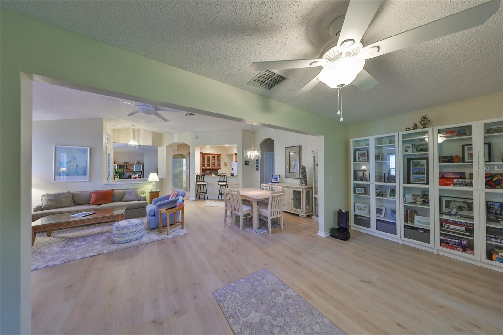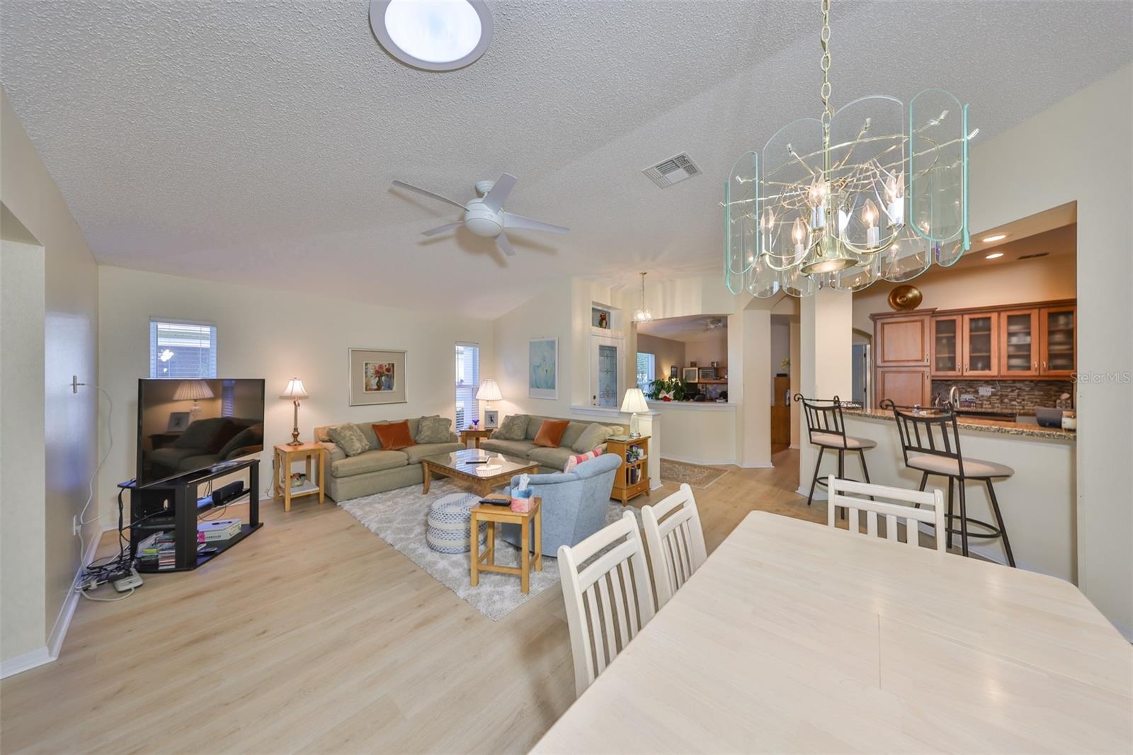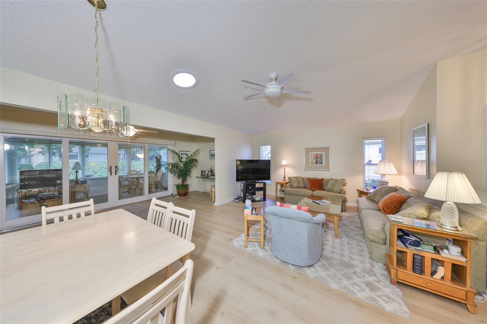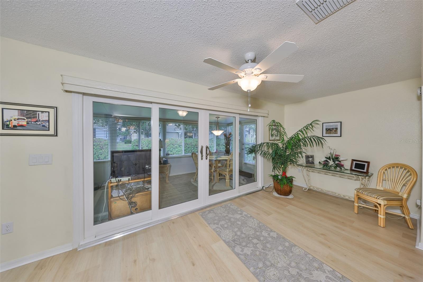 TERRIFIC PRICE IMPROVEMENT FOR THIS BEAUTIFULLY UPDATED CONDO FEATURING AN 8 X 20 NEWER FLORIDA ROOM, PLUS GOLF CART! Enjoy the fun Florida lifestyle in the GATED & MAINTENANCE FREE 55+ community of Kings Point in Sun City Center, FL, where you'll feel like you're on vacation every day. Nestled in a lovely, "pet friendly" neighborhood, this immaculate & well maintained, 2 bed/2 bath & den, FULLY FURNISHED condo has a modern, open floorplan, high ceilings, 3 SOLAR TUBES for extra natural light, LUXURY VINYL FLOORING (2024) and IMPACT WINDOWS (2024). The UPDATED KITCHEN is a cook's dream with plenty of 42-inch wood cabinetry finished w/crown molding, pretty tile backsplash, quartz "Cambria" counters, and a breakfast bar for extra casual seating, all open to the huge living room/dining room combo. The private owner's suite has large dual closets, NEWER VANITY, FIXTURES, AND GORGEOUS TILED WALK-IN SHOWER. The spacious 2nd bedroom & UPDATED BATHROOM are at the opposite end of the condo, offering privacy for guests. The office/den is a great versatile space that can easily accommodate extra guests if needed. For added living space, this condo has a terrific 8 x 20 GLASSED ENCLOSED FLORIDA ROOM (2024) that has a SPLIT AC/HEAT UNIT, DOUBLE PANE WINDOWS, REINFORCED CEILING PANELS, CERAMIC TILE FLOORING and IMPACT SLIDERS. For extra storage, all cabinets in the 2-car garage will remain. Furniture may be available for sale on separate bill of sale. Kings Point is a wonderful community with numerous amenities, such as 2 clubhouses w/cafes, indoor/outdoor resort-style pools, tennis/pickleball courts, lawn bowling, tons of social clubs, live theater, golf, and so much more, all accessible by golf cart. Kings Point is conveniently located on major highways, airports, award-winning beaches, Sarasota, Tampa, and Disney. So come and view this beauty today and see why you'll want to call it home!
