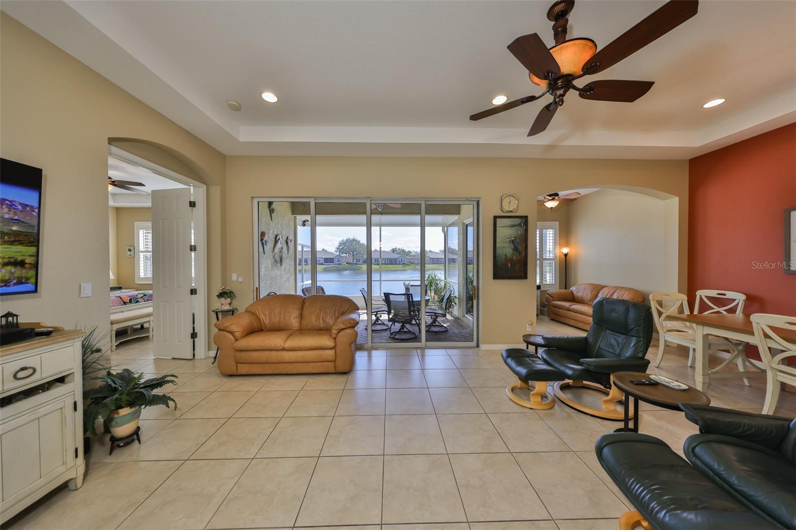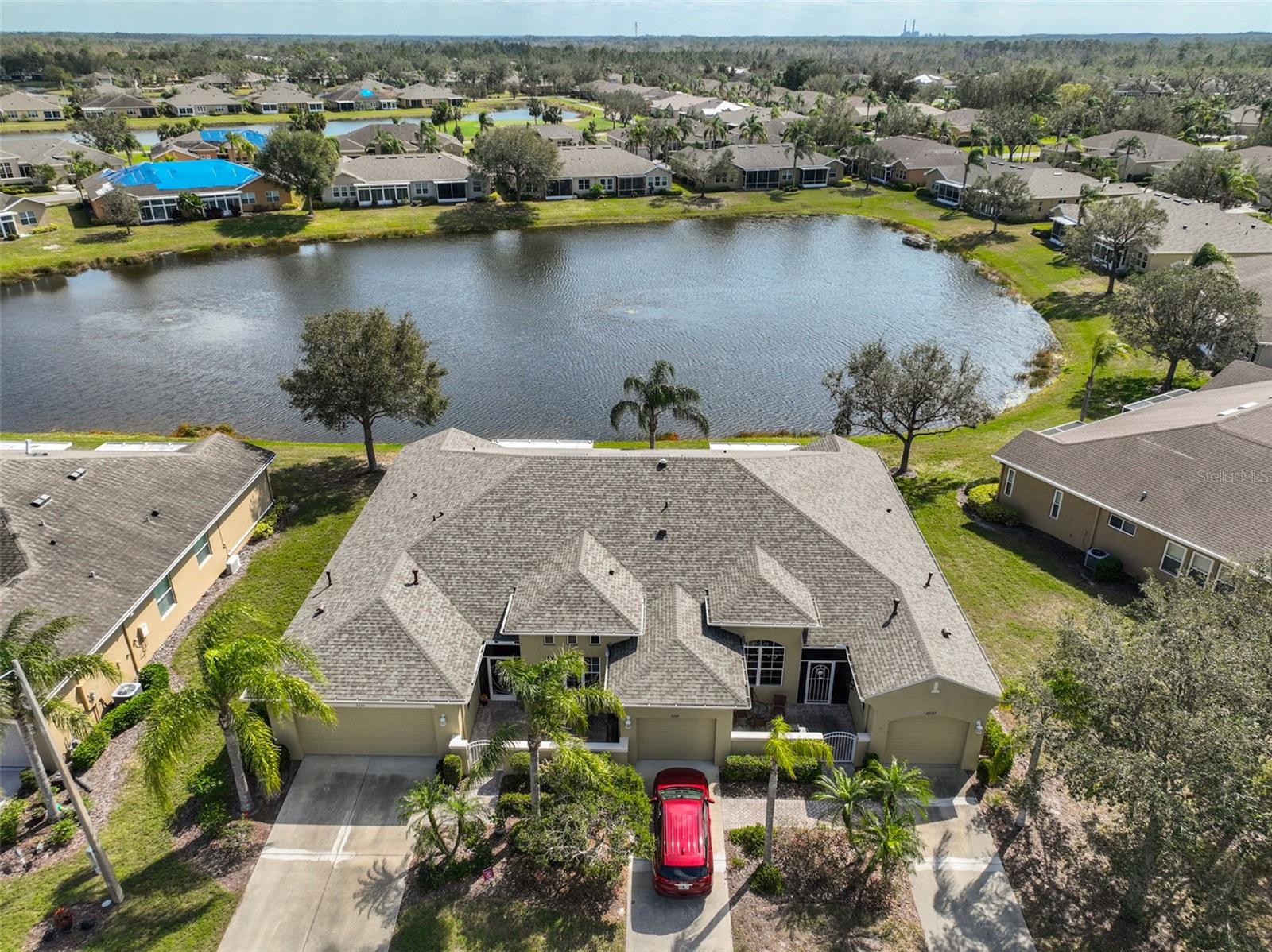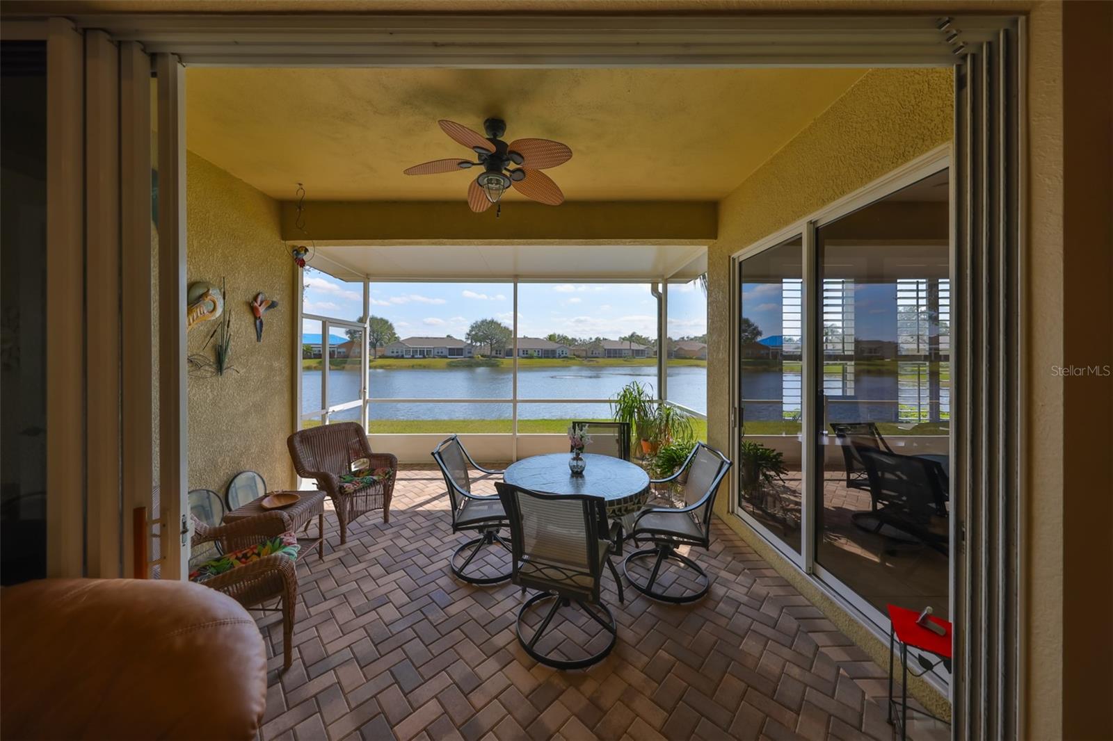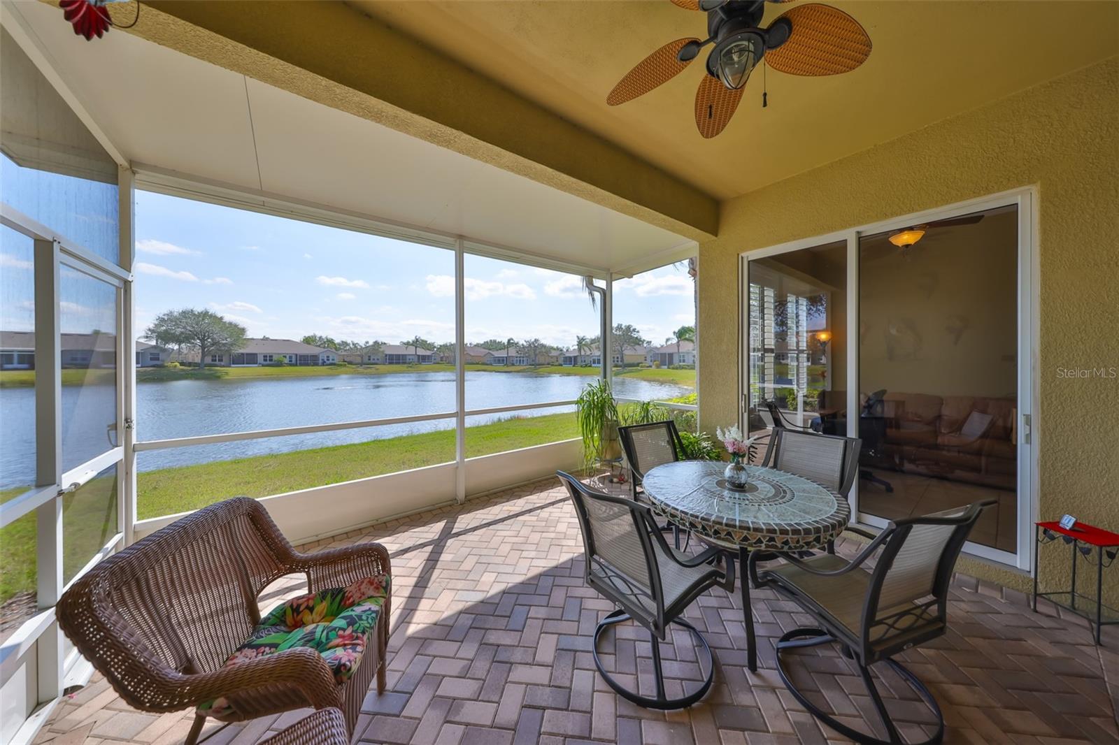 Breathtaking Waterviews from the Moment You Step Inside! Welcome to your dream home, featuring the highly sought-after Mayfair floor plan, the most popular 3-bedroom, 2-bathroom layout in this community. From the moment you walk through the front door, you'll be captivated by stunning water views that create a tranquil and picturesque setting. Enhanced Outdoor Living The expanded screened lanai is perfect for enjoying the serene backdrop, designed with a heavy-duty insulated roof that offers the option to upgrade to a fully glassed-in space. Thanks to the strategic orientation of the home, you can relax on the lanai without the inconvenience of the afternoon sun. Elegant Interior Features Step inside to find ceramic tile flooring throughout the main living areas, ensuring durability and easy maintenance, while the two guest bedrooms offer the comfort of plush carpeting. Plantation shutters and wood blind treatments adorn every window, adding a touch of sophistication to each room. The home is accented with decorative remote-controlled ceiling fans, enhancing comfort and style. Recent Updates and Thoughtful Details Freshly painted interiors provide a bright and welcoming ambiance. New water softener installed in February 2025, ensuring high-quality water throughout the home. Beautiful brick pavers enhance the appeal of the lanai and front courtyard, offering a polished and cohesive look. Resort-Style Living in Award-Winning Community Nestled in Sun City Center, voted the #1 Retirement Community for 2024 by Realtor.com and Travel + Leisure Magazine, this home offers an unparalleled lifestyle. In the vibrant Kings Point community, you'll find endless opportunities for recreation and social engagement, including: Two Clubhouses (South and North) State-of-the-art 20/20 Fitness/Spa facility Multiple pools and spas for relaxation Veteran's Theater Entertainment, bingo, arts and crafts, cards, and woodshop Fine dining, pickleball, golf, tennis, and lawn bowling 24-hour golf cart accessibility throughout the community Live the Good Life! With its ideal layout, beautiful finishes, and an unbeatable location in a top-rated retirement community, this home truly offers the best of Florida living. Welcome to your new home, where every day feels like a vacation!