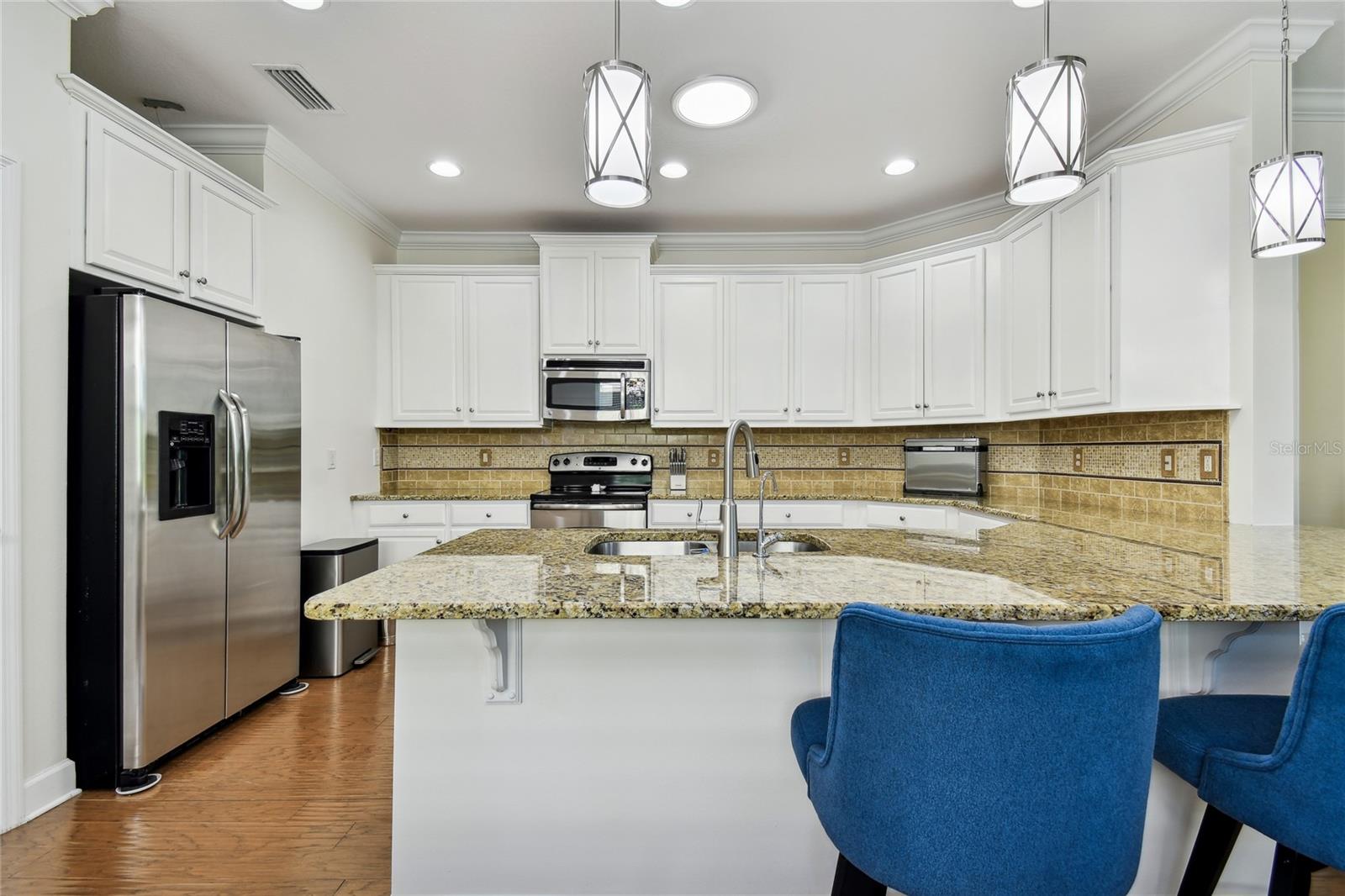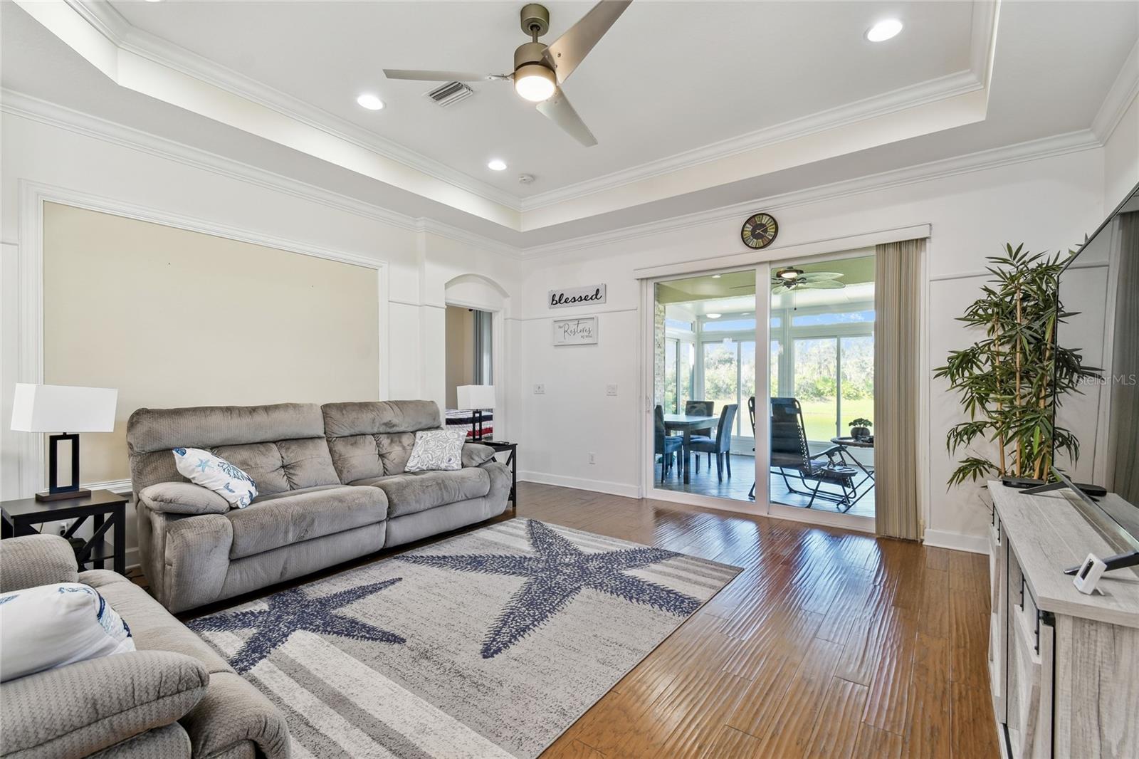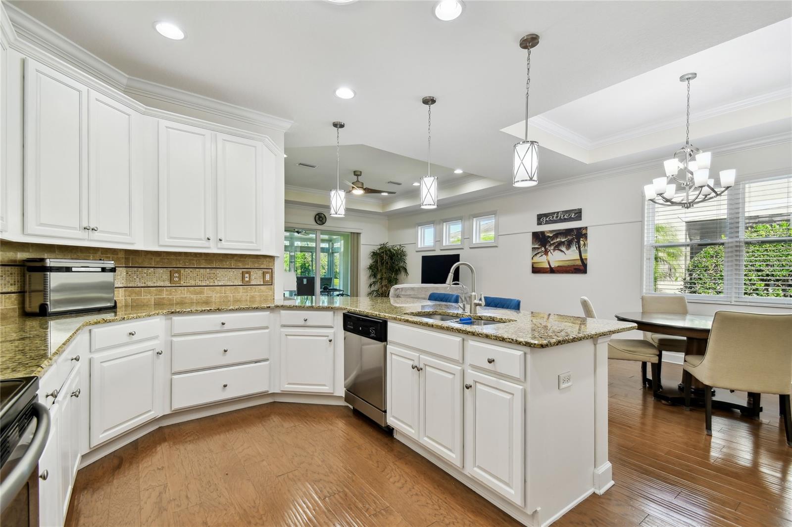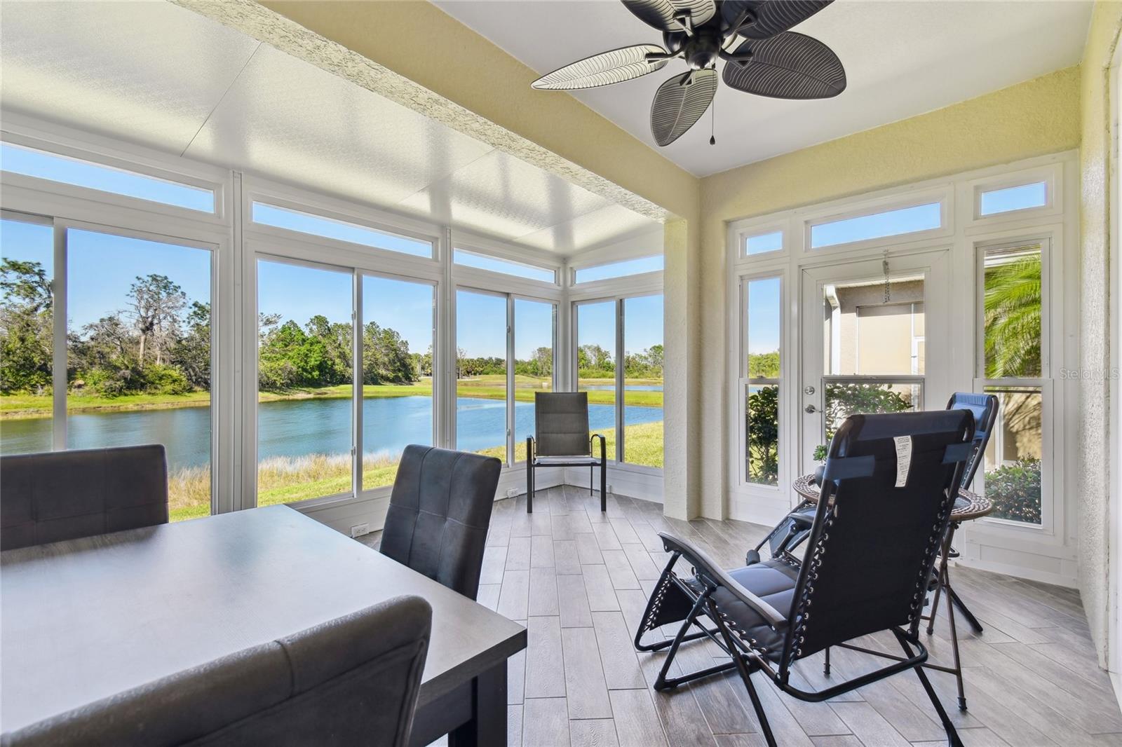 Price reduced! You'll see the beauty of this home as you enter through the screened entry and beautiful leaded glass door into this bright and cheery home. The open floor plan allows wonderful space for you and your guests. The kitchen has granite counters, 42 inch cabinets, a solar light and pretty Pendant lights. Stainless steel appliances and cabinets with sliding shelfs that compliment the kitchen Next to the kitchen is the dining area. The living room is spacious and from it you walk directly into the Florida room. There are Engineered Hardwood Floors through the living area and Crown Molding throughout! The Master Bedroom has a nice view of the pond and has en-suite bathroom The bathroom has a double vanity, private water closet, a large walk-in tiled shower and a walk-in closet! The second bedroom is on the front of the condo which allows privacy for guests and the owner. The Den is just right to spend quiet time relaxing and also can serve as extra bedroom for guests. The laundry room has a utility sink, many cabinets and a washer dryer. The Florida Room has a majestic view overlooking a pond and a ceramic tile floor. Kings Point community has many actives including arts and crafts, various clubs to consider as well as Pickle Ball , Golf, Lawn Bowling, Shuffle Board and SO much more! Don't wait to see this beautiful condo it won't last long!!