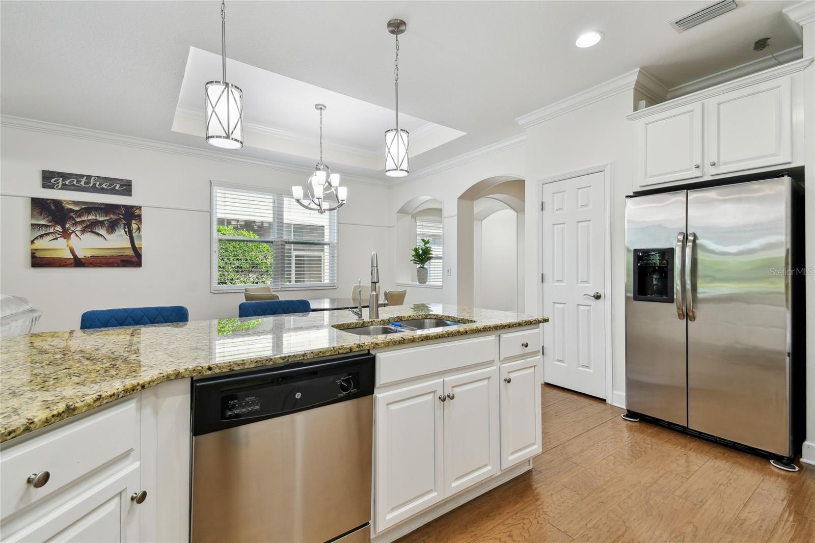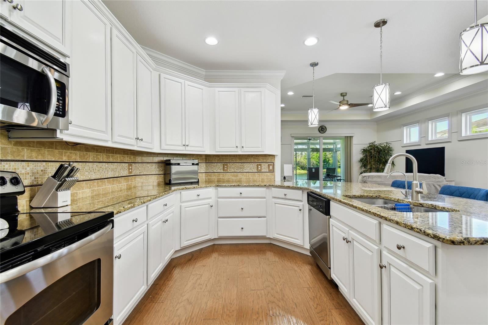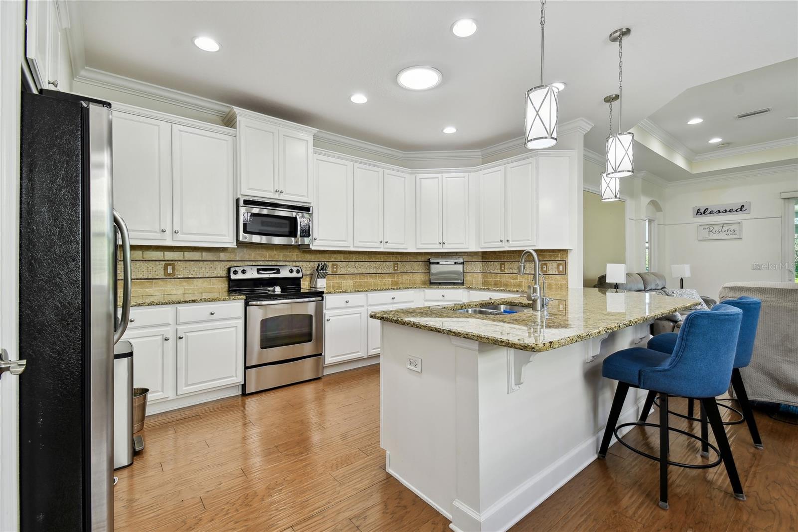Price reduced! You'll see the beauty of this home as you enter through the screened entry and beautiful leaded glass door into this bright and cheery home. The open floor plan allows wonderful space for you and your guests. The kitchen has granite counters, 42 inch cabinets, a solar light and pretty Pendant lights. Stainless steel appliances and cabinets with sliding shelfs that compliment the kitchen Next to the kitchen is the dining area. The living room is spacious and from it you walk directly into the Florida room. There are Engineered Hardwood Floors through the living area and Crown Molding throughout! The Master Bedroom has a nice view of the pond and has en-suite bathroom The bathroom has a double vanity, private water closet, a large walk-in tiled shower and a walk-in closet! The second bedroom is on the front of the condo which allows privacy for guests and the owner. The Den is just right to spend quiet time relaxing and also can serve as extra bedroom for guests. The laundry room has a utility sink, many cabinets and a washer dryer. The Florida Room has a majestic view overlooking a pond and a ceramic tile floor. Kings Point community has many actives including arts and crafts, various clubs to consider as well as Pickle Ball , Golf, Lawn Bowling, Shuffle Board and SO much more! Don't wait to see this beautiful condo it won't last long!!