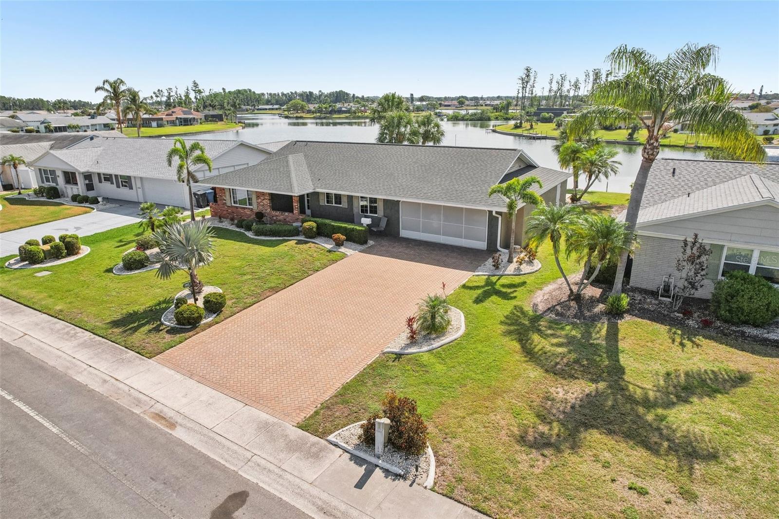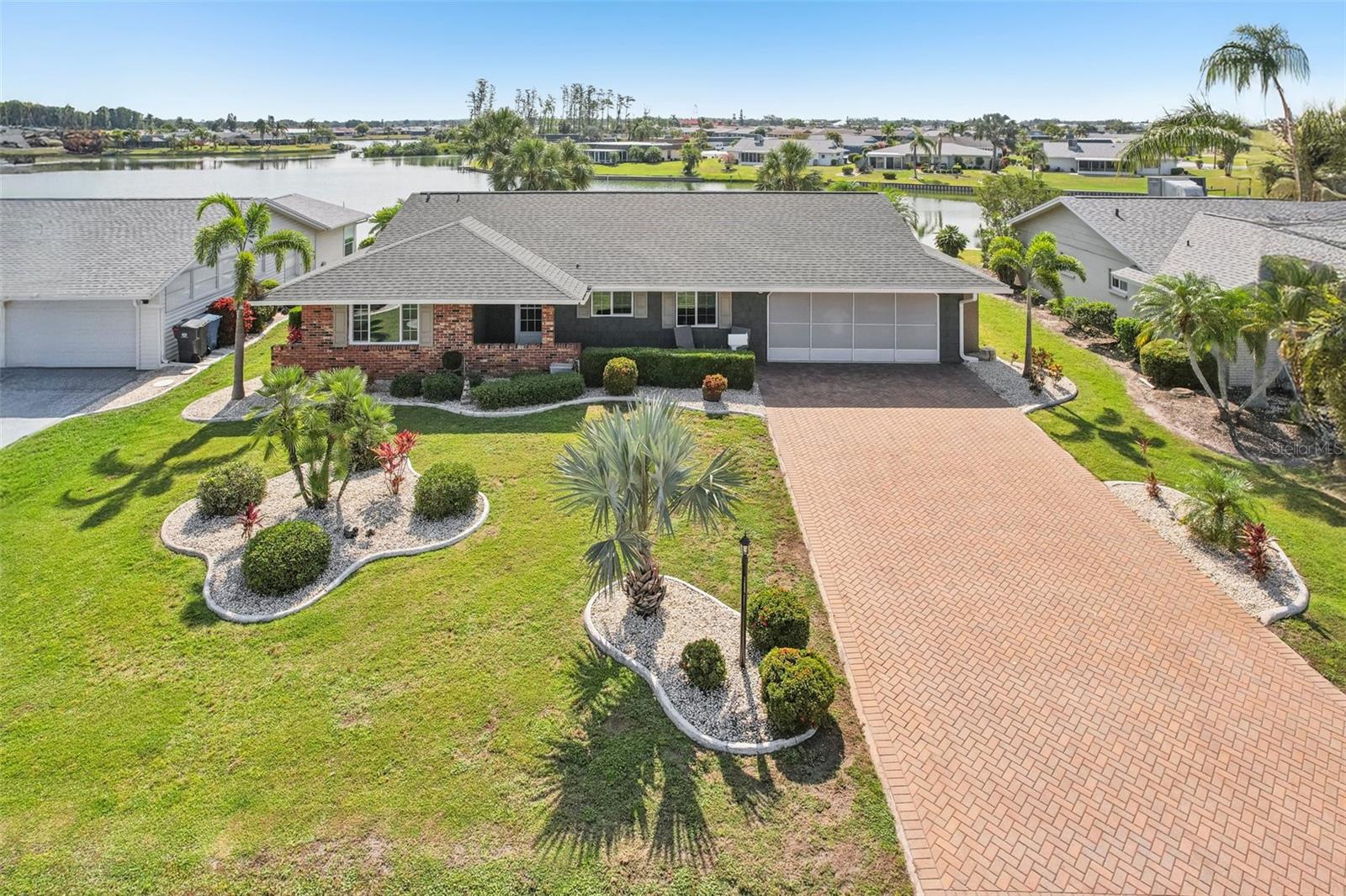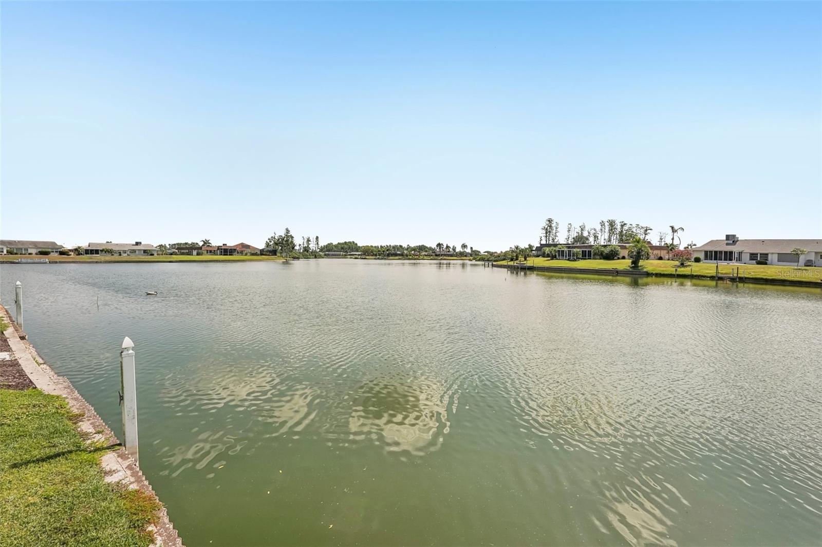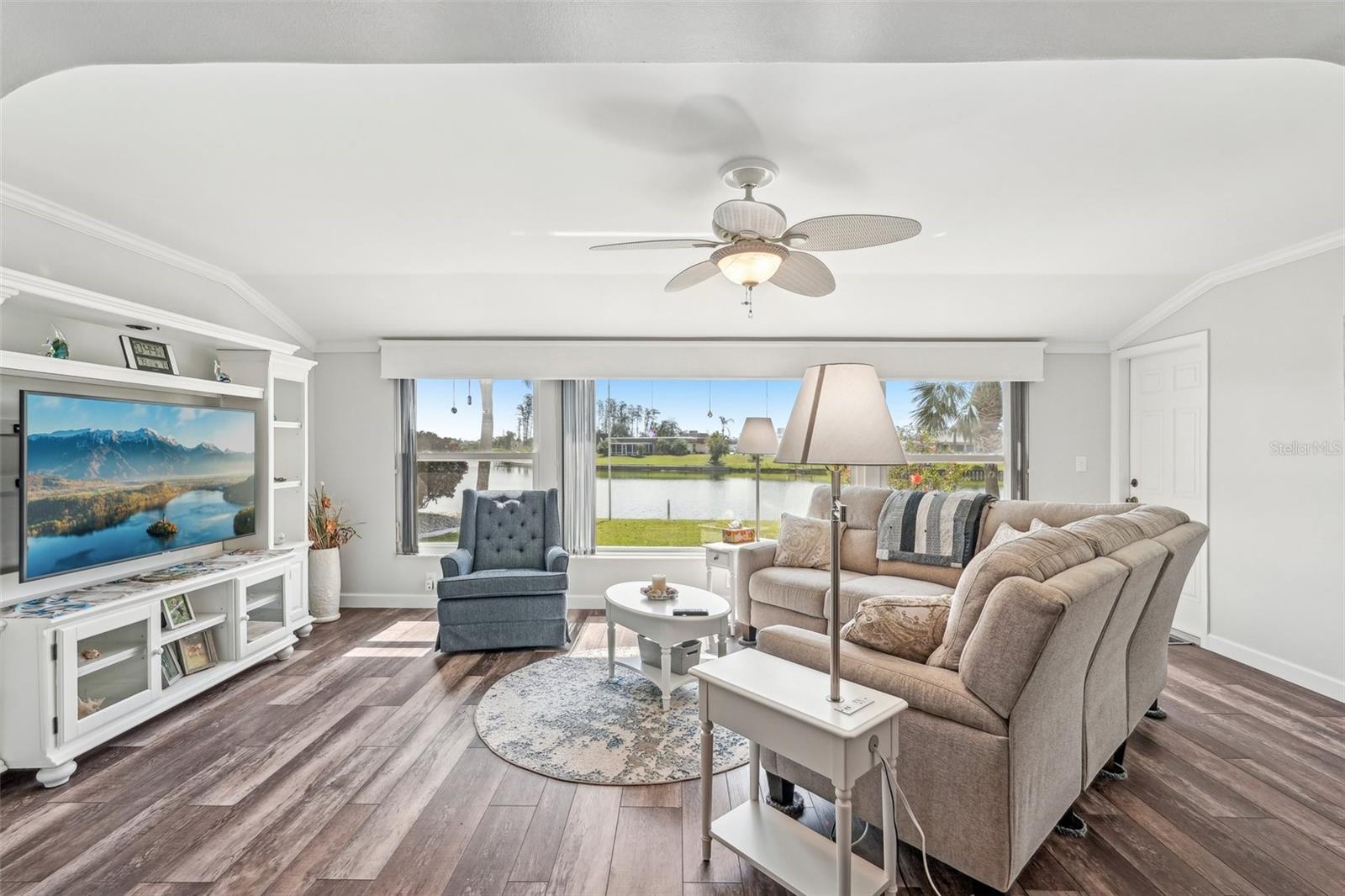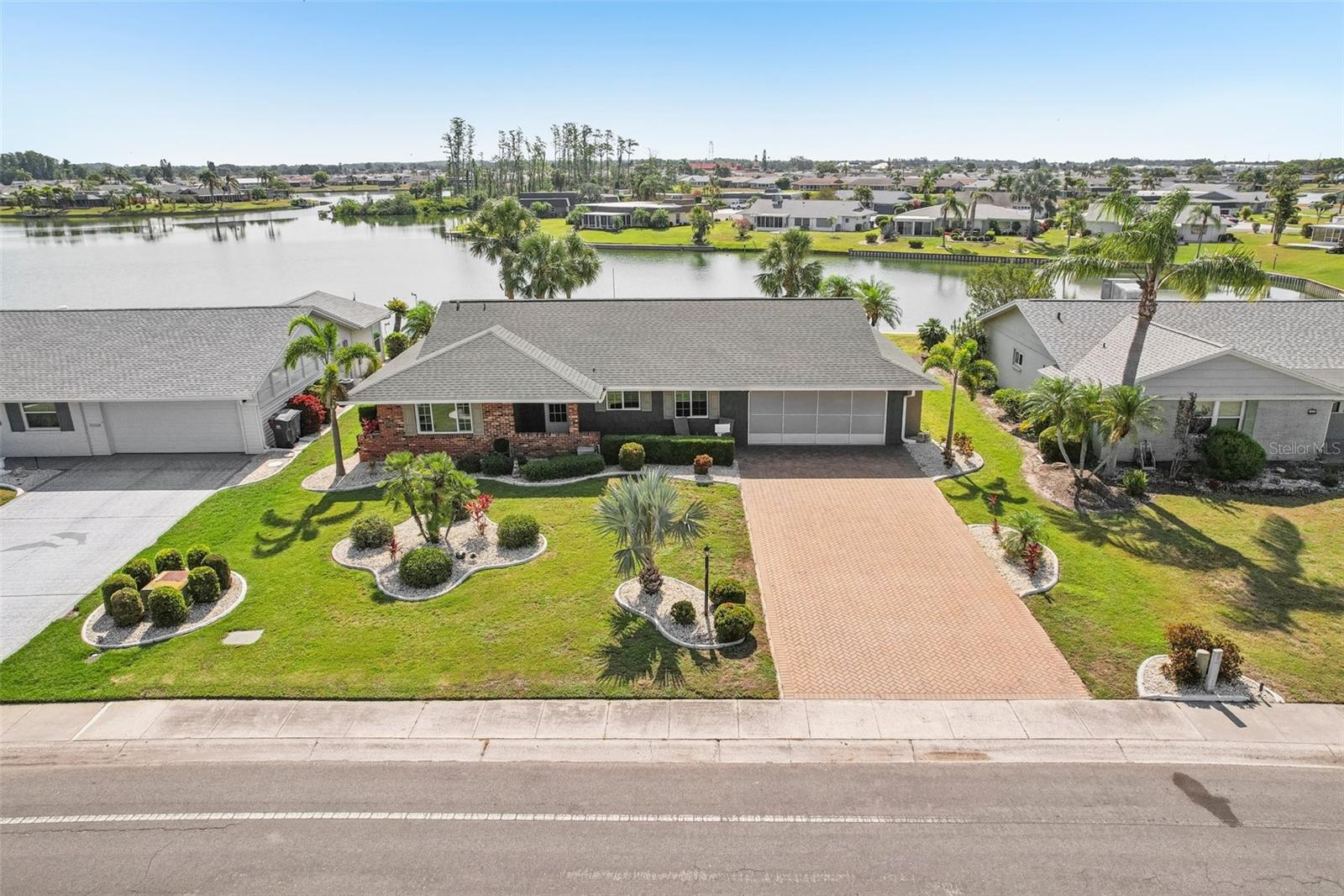 Welcome to this beautifully updated 2-bedroom, 2-bathroom waterfront home in the desirable 55+ community of Del Webb, Sun City Center. Step inside to stunning panoramic water views and gorgeous laminate wood-look flooring that flows throughout the home. The bright, open layout features a spacious kitchen with solid countertops, rich dark wood cabinets, and stainless steel appliances. The primary suite includes charming bay windows, dual closets, and an en suite bath. Enjoy peaceful mornings on the front porch and relaxing evenings on the back patio which will soon be a screened in lanai, being installed June 2025. Additional highlights include a large utility/storage room conveniently located off the kitchen and garage. Plus, build your own dock and bring your boat for peaceful rides around the lake! You’ll love Sun City Center with its amazing facilities, pools, and clubs just waiting for you to enjoy. Nestled between Sarasota and Tampa, this location offers a convenient ride to airports, great shopping, dining, and professional entertainment. With easy access to award-winning, sandy beaches, this home provides the best of all worlds without the stress of big city life. Leave it all behind and enjoy your new life here in one of Florida’s most affordable 55-and-better communities! This home combines style, comfort, and the relaxed Florida lifestyle you’ve been looking for!