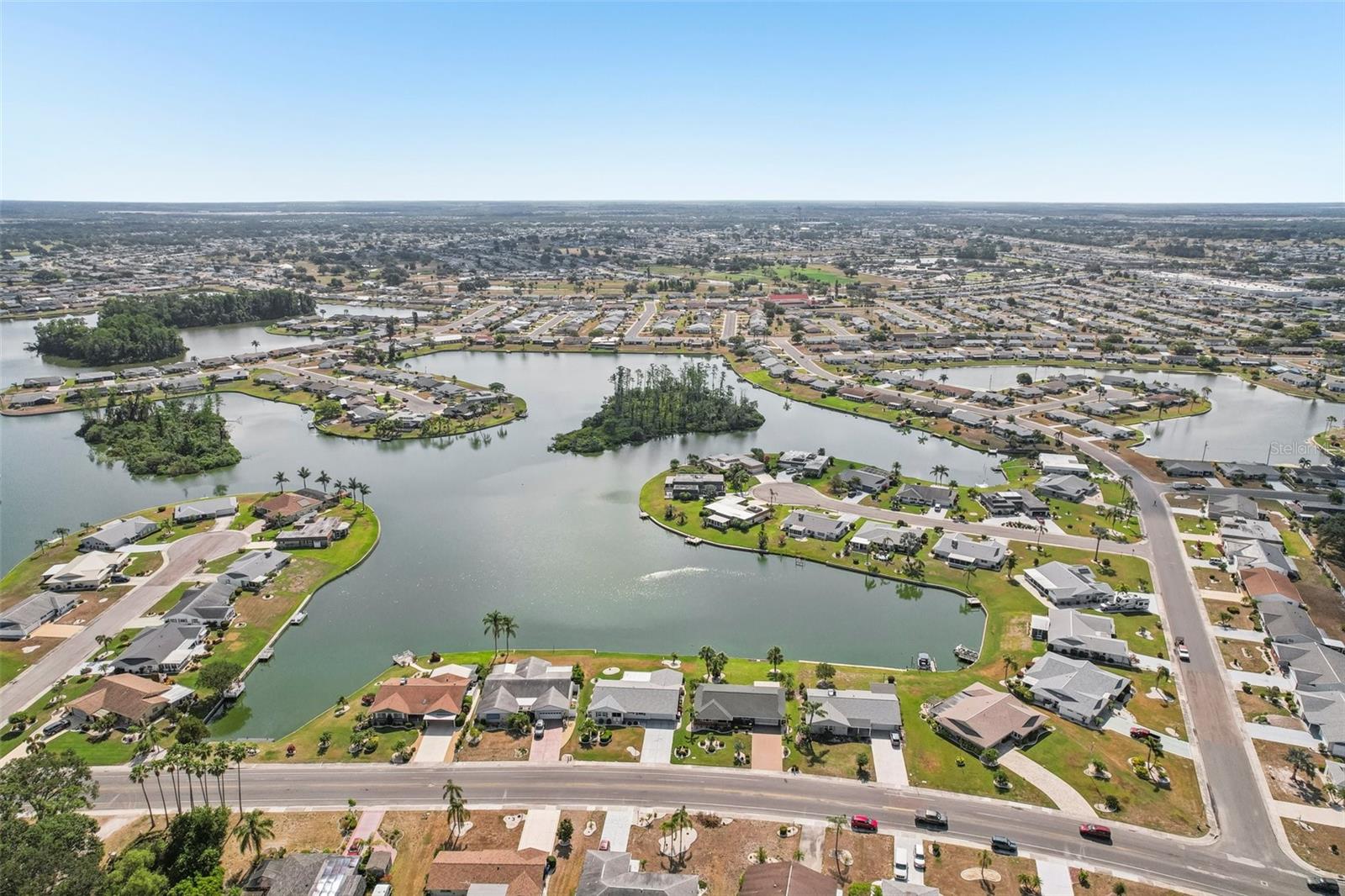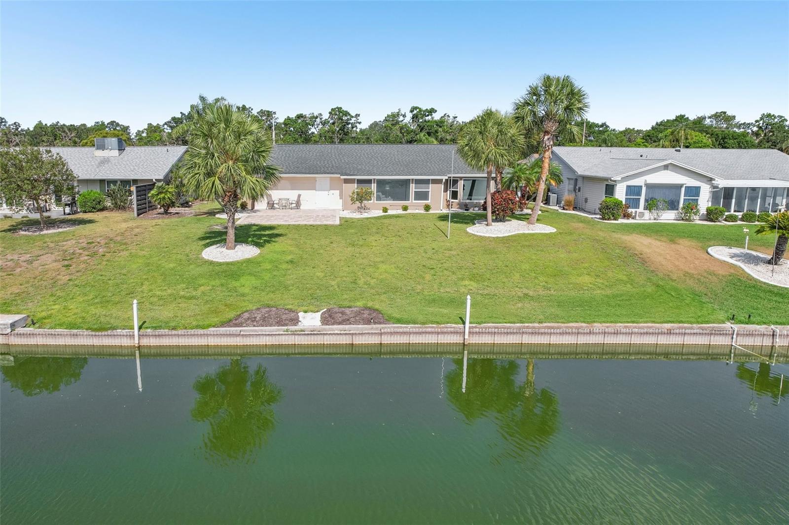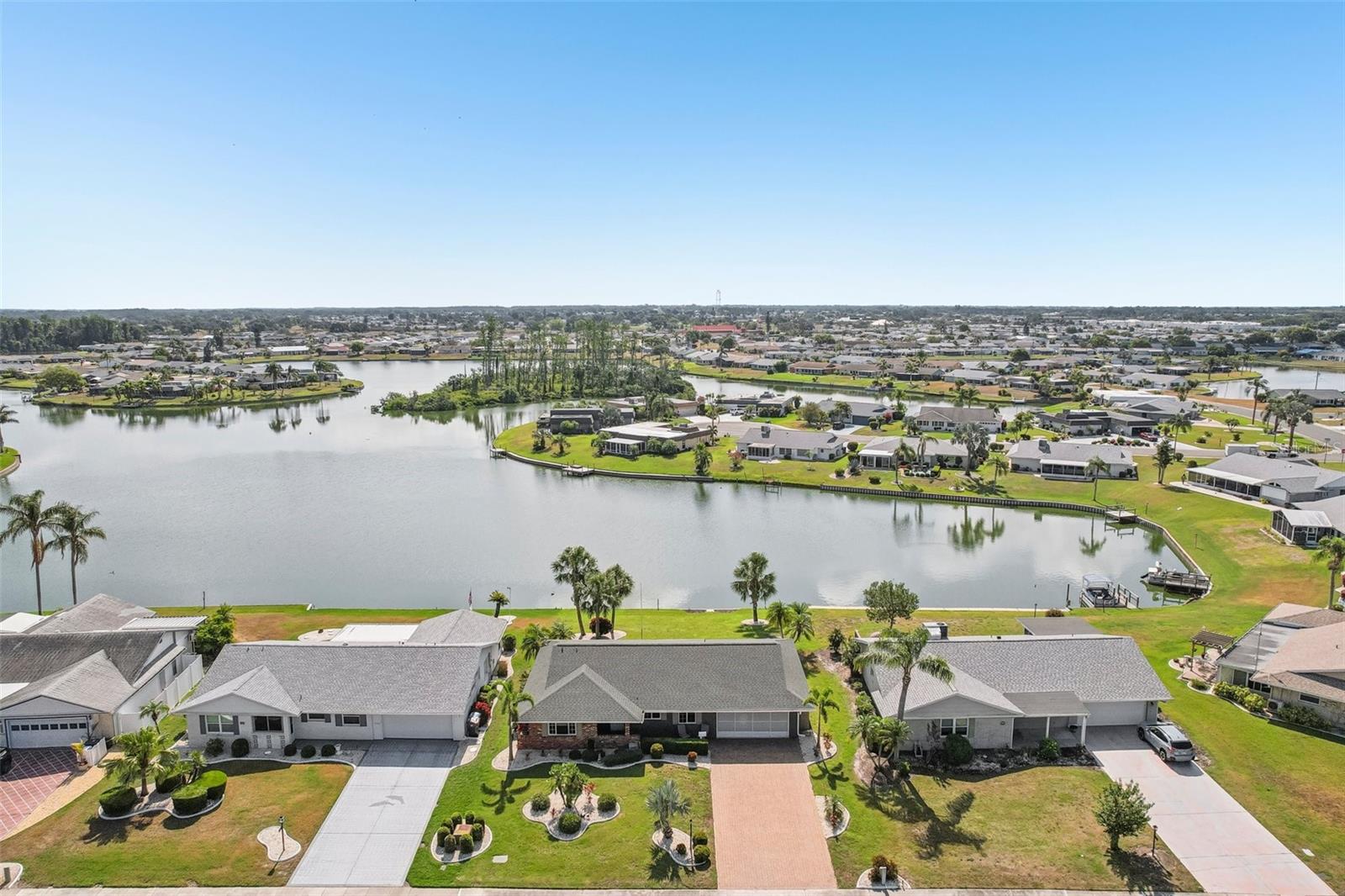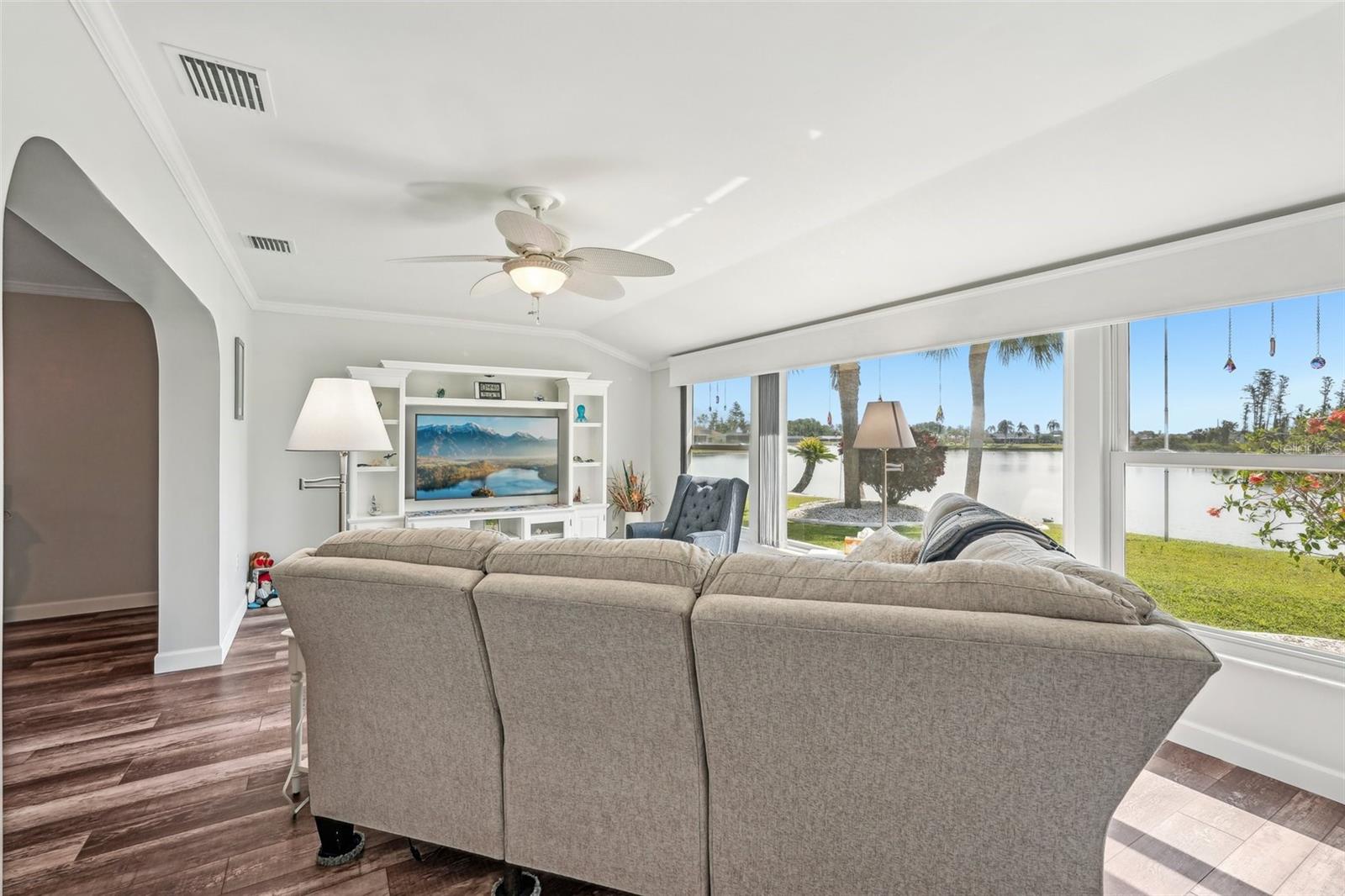 Welcome to this beautifully updated 2-bedroom, 2-bathroom waterfront home in the desirable 55+ community of Del Webb, Sun City Center. Step inside to stunning panoramic water views and gorgeous laminate wood-look flooring that flows throughout the home. The bright, open layout features a spacious kitchen with solid countertops, rich dark wood cabinets, and stainless steel appliances. The primary suite includes charming bay windows, dual closets, and an en suite bath. Enjoy peaceful mornings on the front porch and relaxing evenings on the back patio which will soon be a screened in lanai, being installed June 2025. Additional highlights include a large utility/storage room conveniently located off the kitchen and garage. Plus, build your own dock and bring your boat for peaceful rides around the lake! You’ll love Sun City Center with its amazing facilities, pools, and clubs just waiting for you to enjoy. Nestled between Sarasota and Tampa, this location offers a convenient ride to airports, great shopping, dining, and professional entertainment. With easy access to award-winning, sandy beaches, this home provides the best of all worlds without the stress of big city life. Leave it all behind and enjoy your new life here in one of Florida’s most affordable 55-and-better communities! This home combines style, comfort, and the relaxed Florida lifestyle you’ve been looking for!