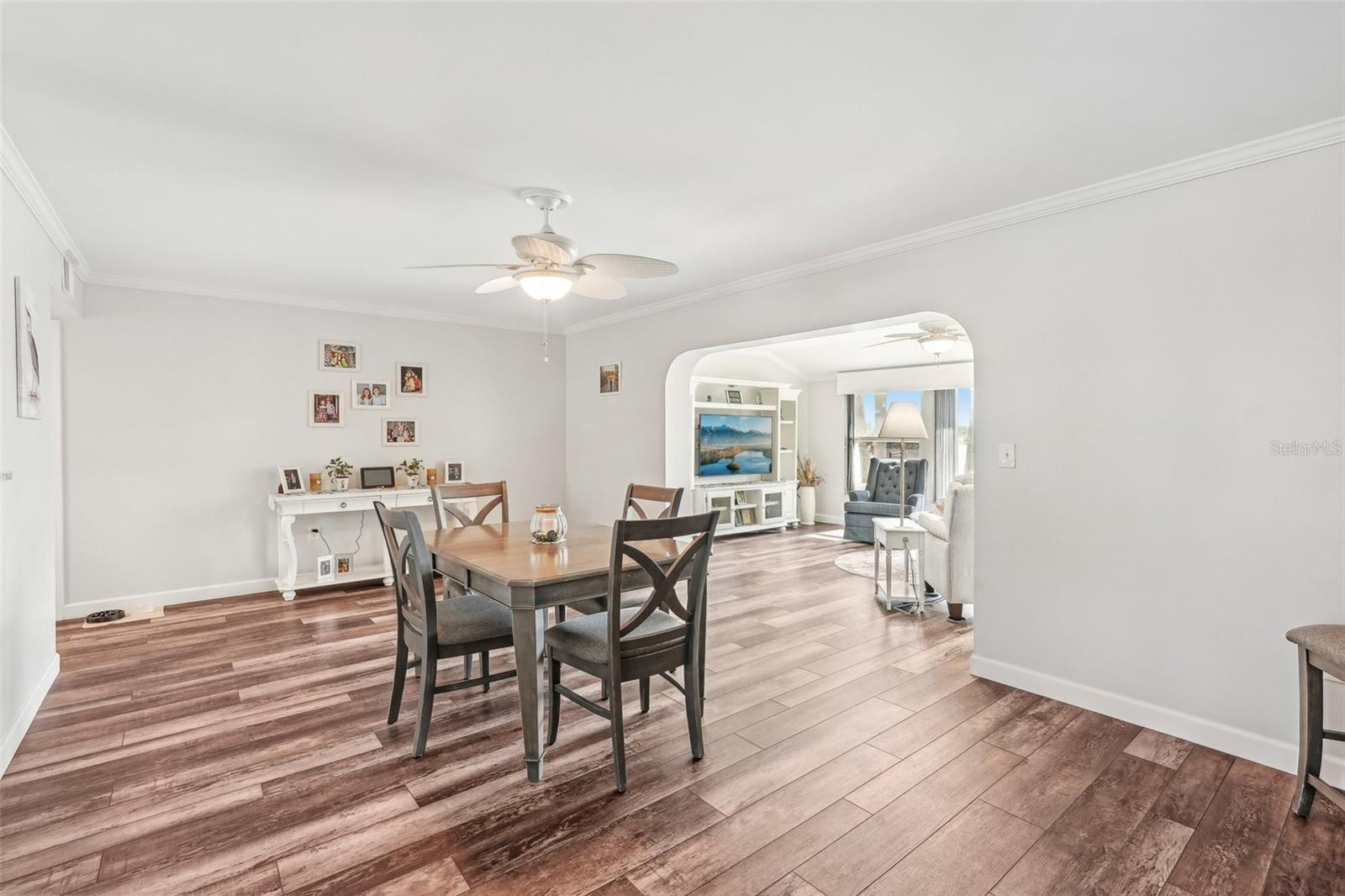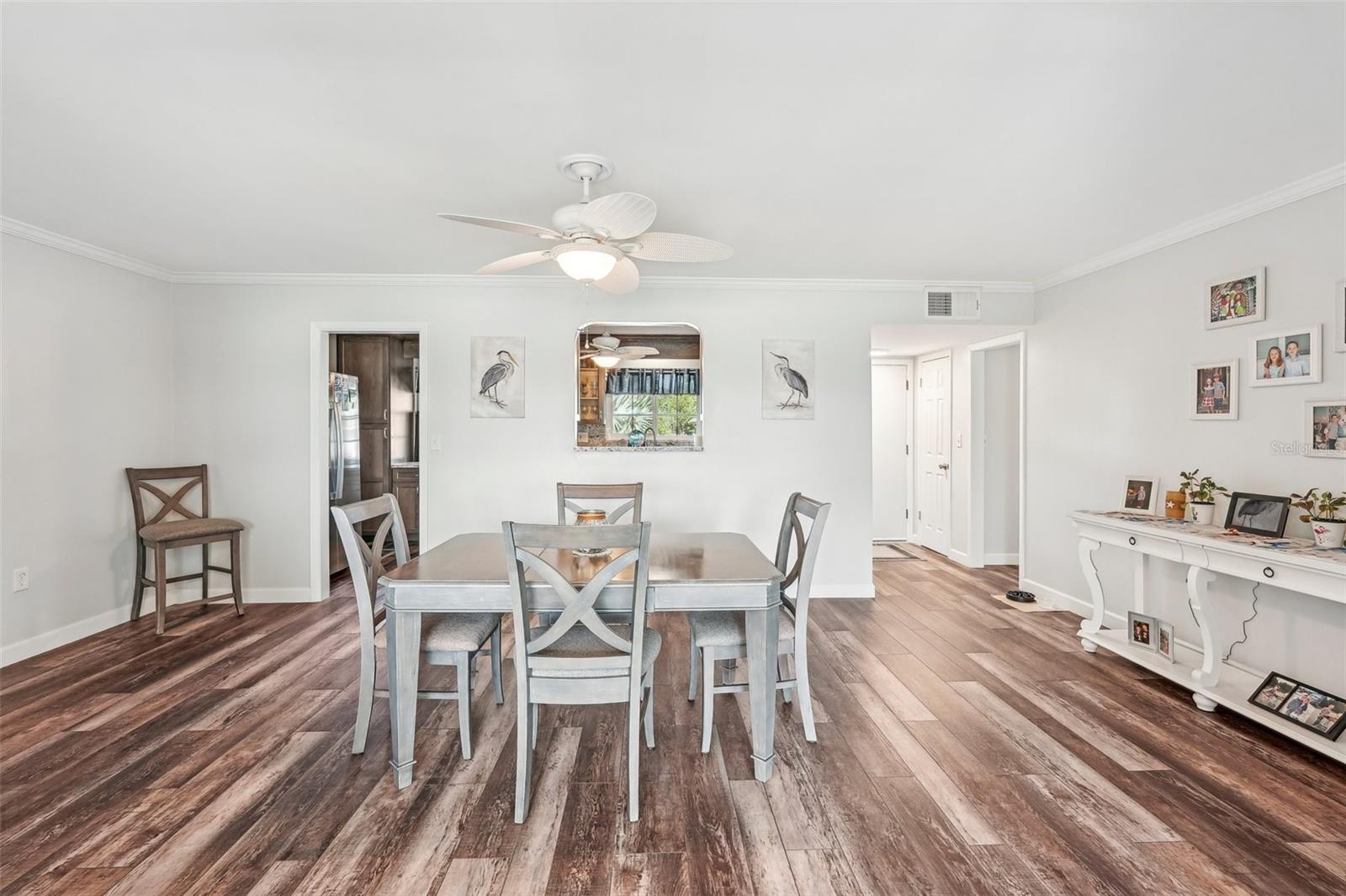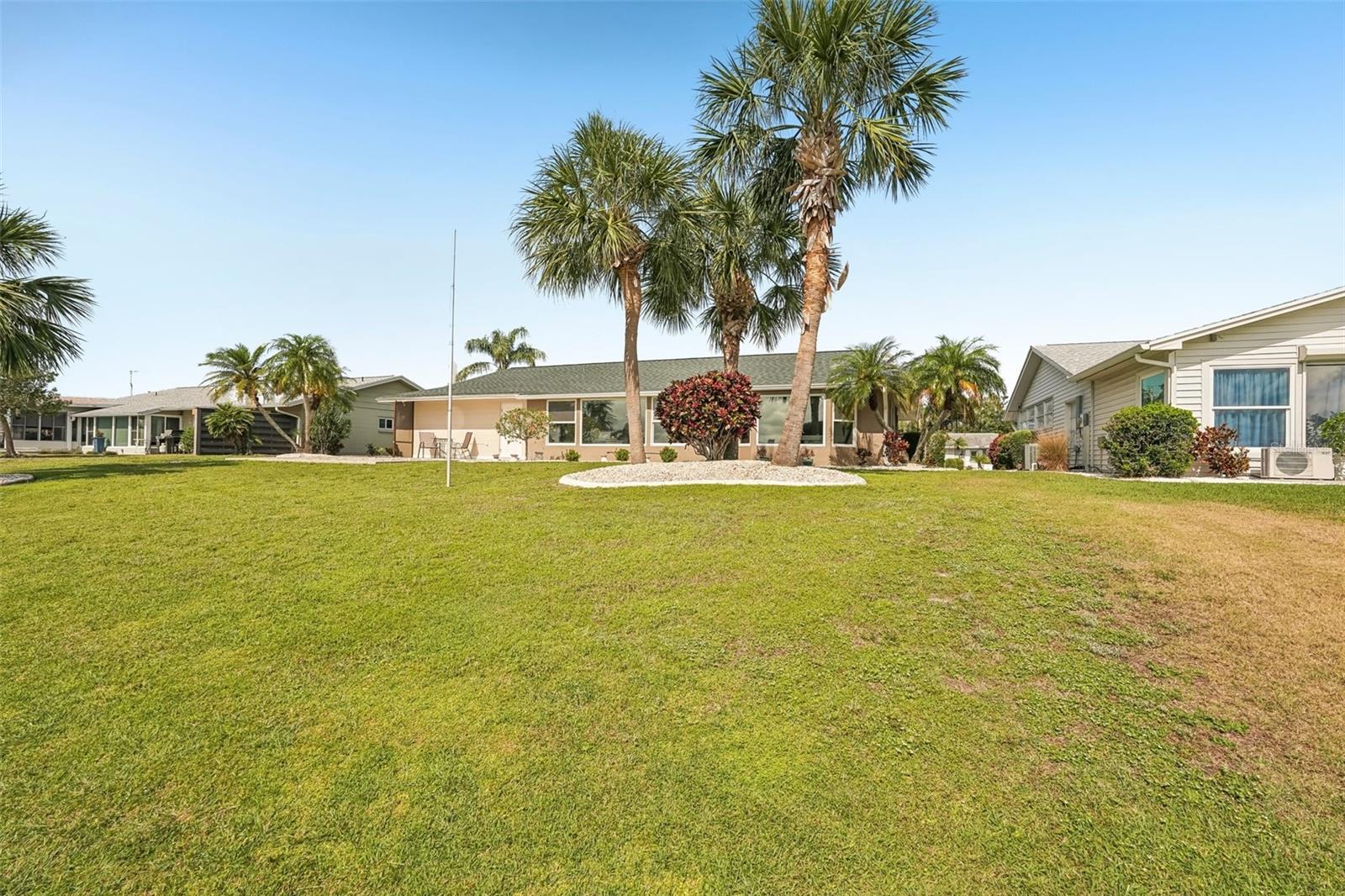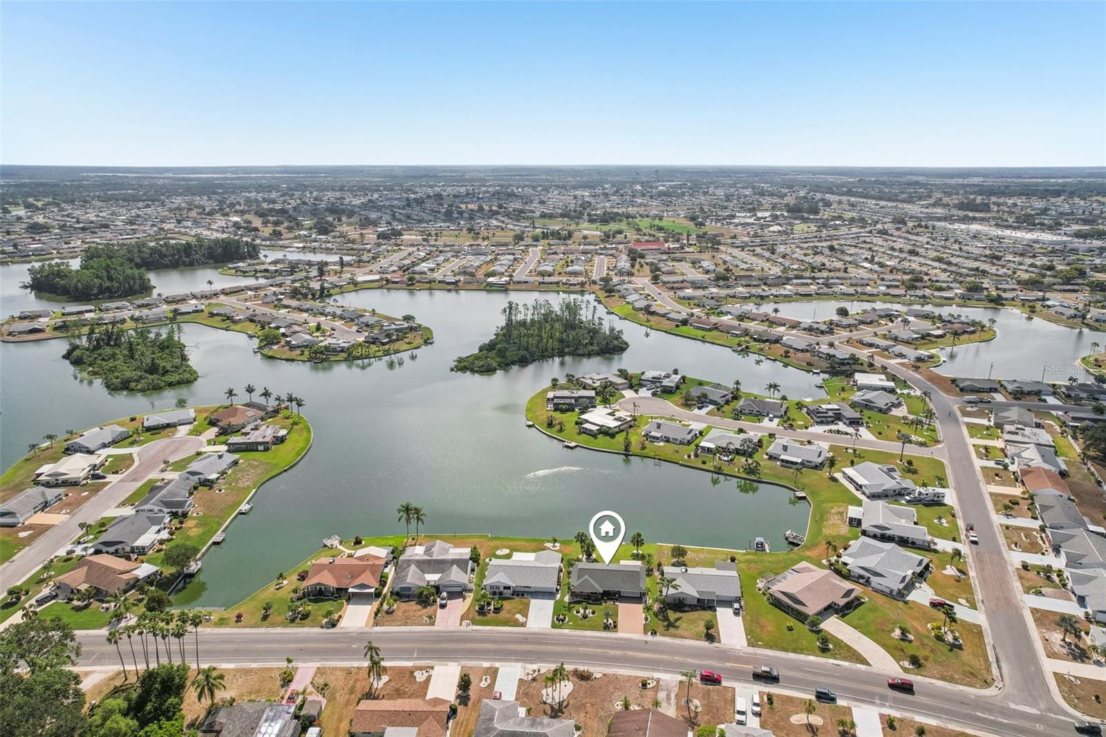 Welcome to this beautifully updated 2-bedroom, 2-bathroom waterfront home in the desirable 55+ community of Del Webb, Sun City Center. Step inside to stunning panoramic water views and gorgeous laminate wood-look flooring that flows throughout the home. The bright, open layout features a spacious kitchen with solid countertops, rich dark wood cabinets, and stainless steel appliances. The primary suite includes charming bay windows, dual closets, and an en suite bath. Enjoy peaceful mornings on the front porch and relaxing evenings on the back patio which will soon be a screened in lanai, being installed June 2025. Additional highlights include a large utility/storage room conveniently located off the kitchen and garage. Plus, build your own dock and bring your boat for peaceful rides around the lake! You’ll love Sun City Center with its amazing facilities, pools, and clubs just waiting for you to enjoy. Nestled between Sarasota and Tampa, this location offers a convenient ride to airports, great shopping, dining, and professional entertainment. With easy access to award-winning, sandy beaches, this home provides the best of all worlds without the stress of big city life. Leave it all behind and enjoy your new life here in one of Florida’s most affordable 55-and-better communities! This home combines style, comfort, and the relaxed Florida lifestyle you’ve been looking for!