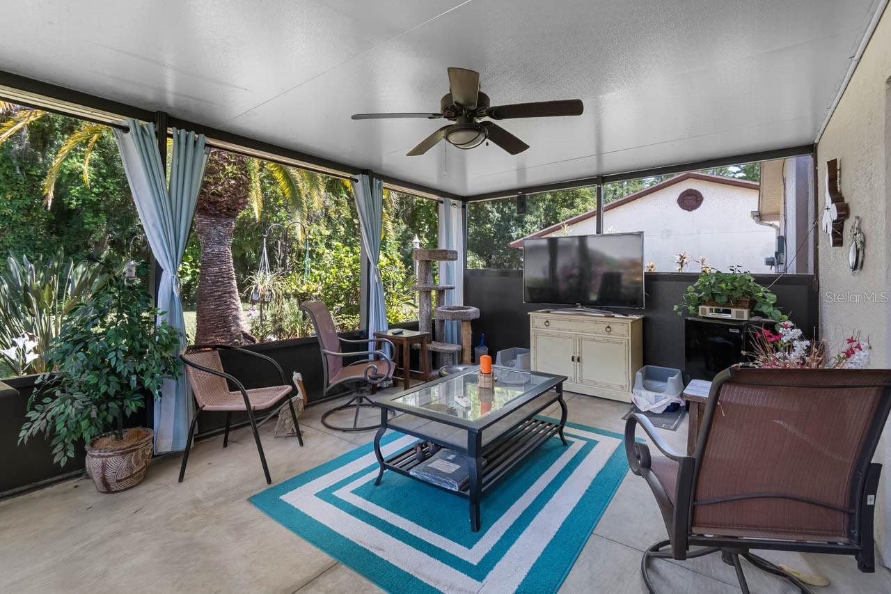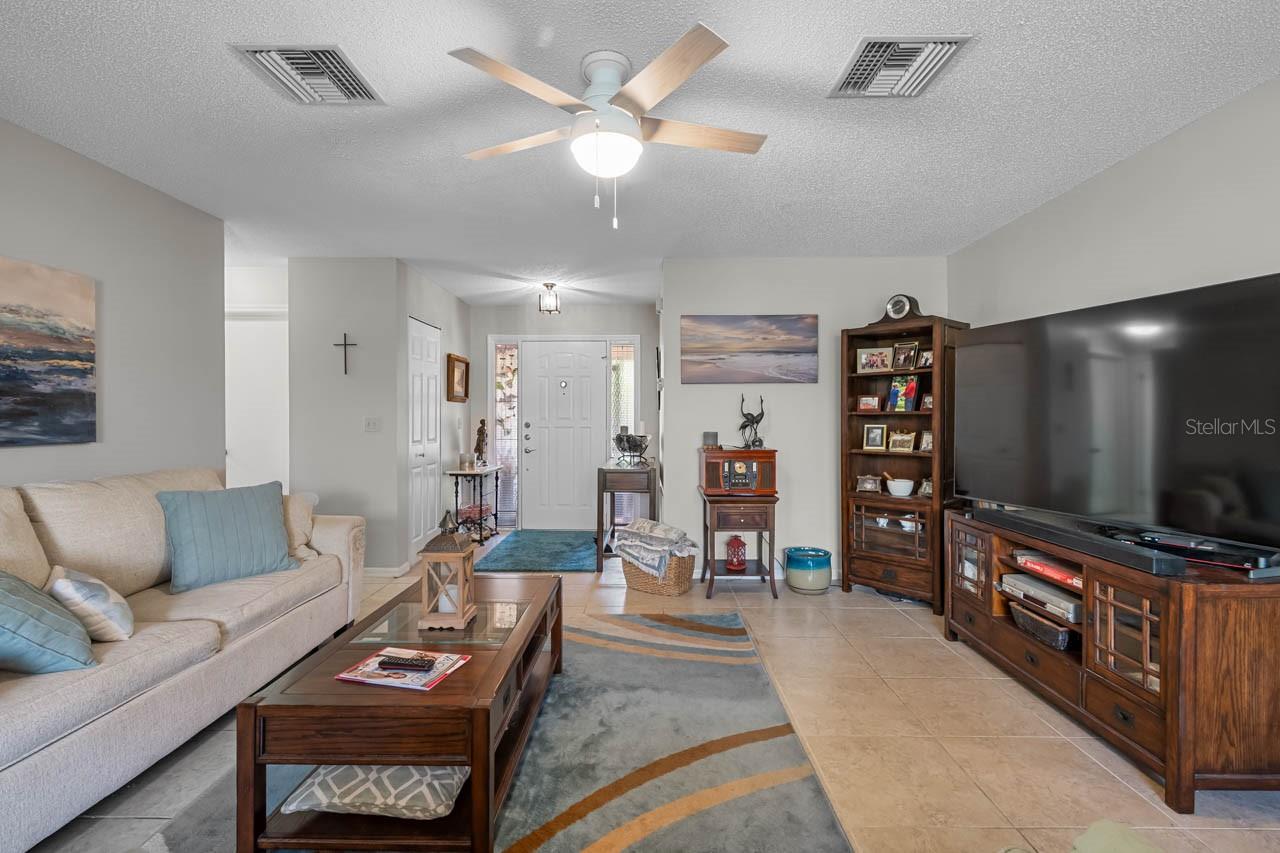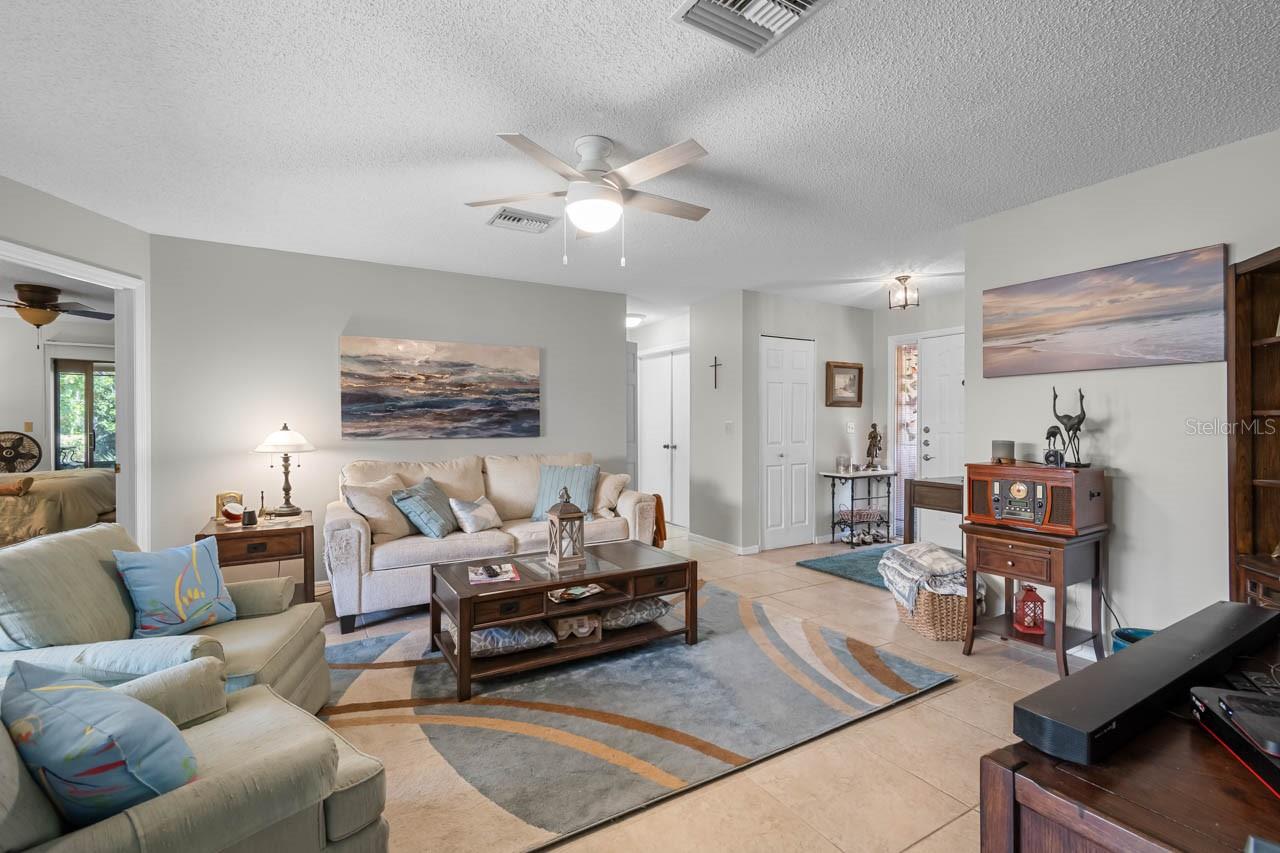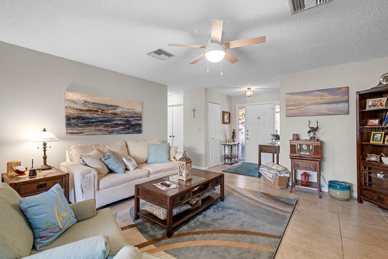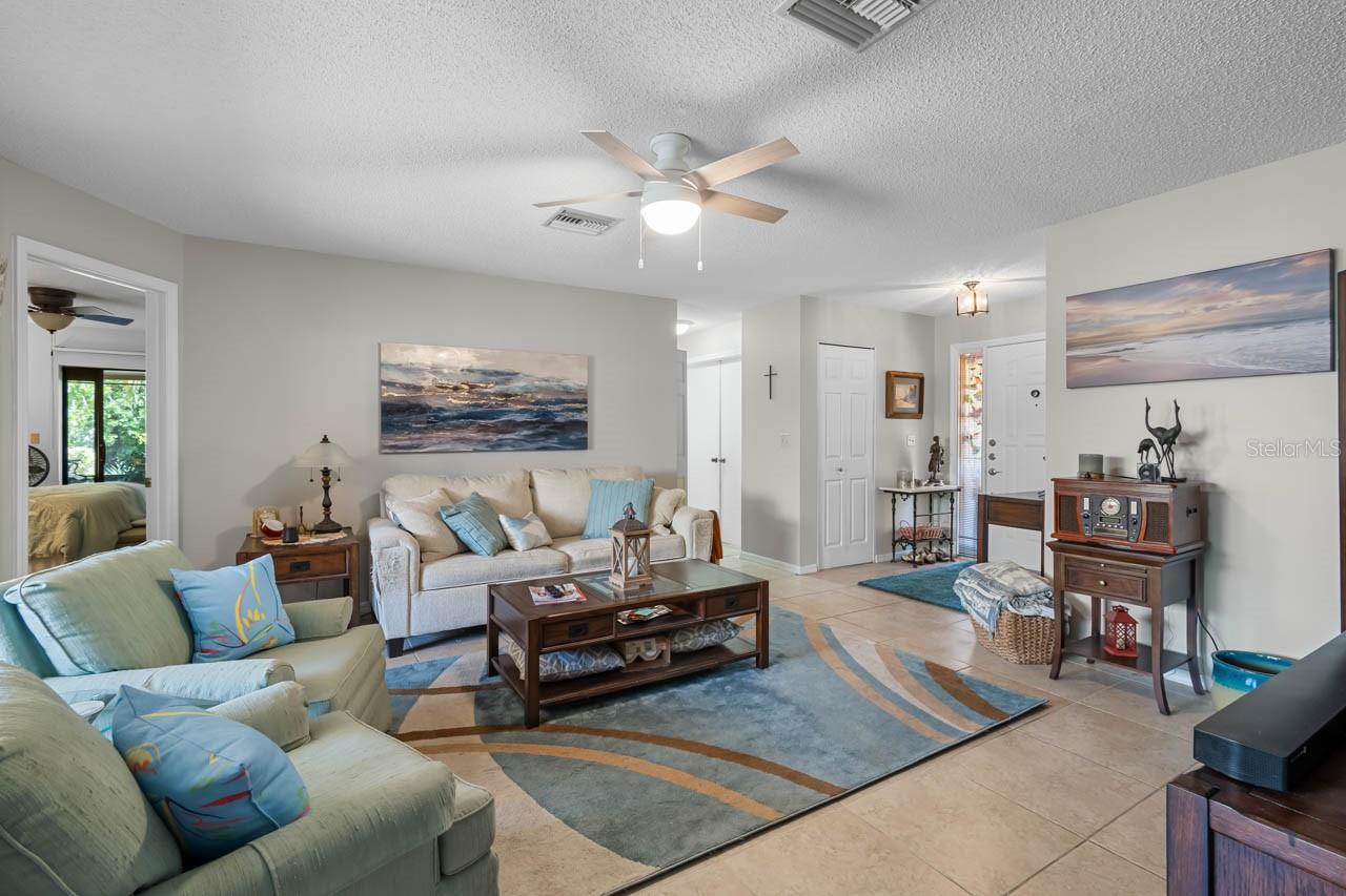 Motivated Seller is replacing roof prior to closing! Don't miss the opportunity to own this inviting 2-bedroom, 2-bathroom, 1.5-car garage home nestled in the heart of the active 55+ community of Sun City Center! HVAC replaced in 2024, FRESHLY PAINTED, NEW interior doors, NEW garage door opener, 15 square feet of NEW cedar planking in main closet, skylights, and so much more! Step through the COVERED & SCREENED FRONT PORCH into the foyer with convenient coat closet. Inside, you'll find CERAMIC TILE FLOORING throughout, except for the wood-look laminate flooring in each bedroom. NO CARPET to contend with in this adorable villa! The open-concept great room houses the living room, dining room with its scenic view of the mature landscaping outside, and of course the well-appointed kitchen, featuring newer STAINLESS STEEL appliances and an island! Rest and recharge in the primary bedroom retreat, complete with an EN-SUITE BATHROOM boasting a single sink vanity, SHOWER STALL, linen closet, and plentiful cabinet storage! The primary also includes a WALK-IN CLOSET and sliders to the COVERED/SCREENED LANAI where the conservation view provides privacy and attracts beautiful butterflies! The secondary bedroom has double-doors and makes an excellent flex space, and the secondary bathroom has a single sink vanity and tub/shower combination. Don't miss your chance to make this charming home yours and enjoy all the amenities and activities this vibrant community provides. Schedule your showing today!