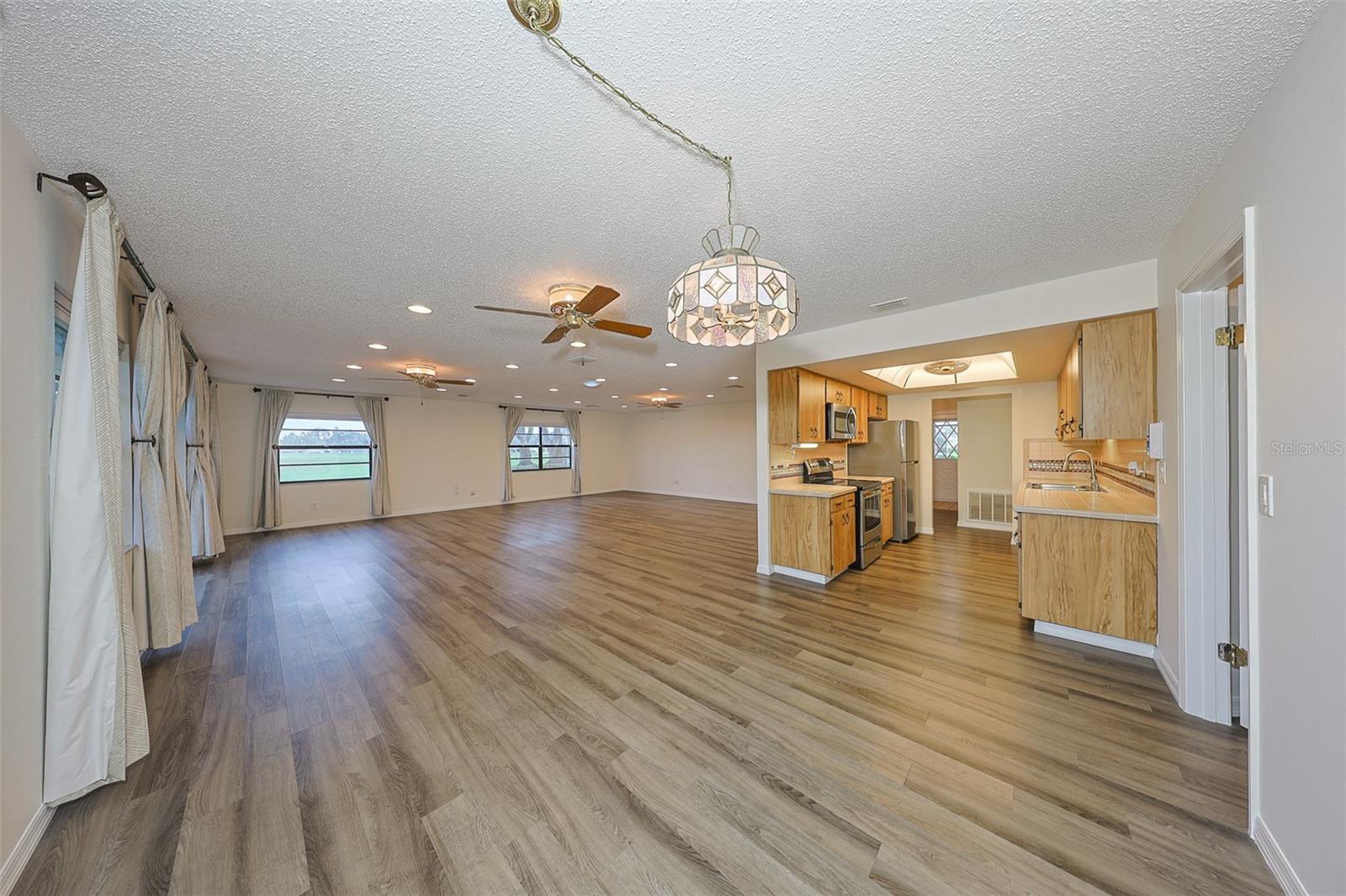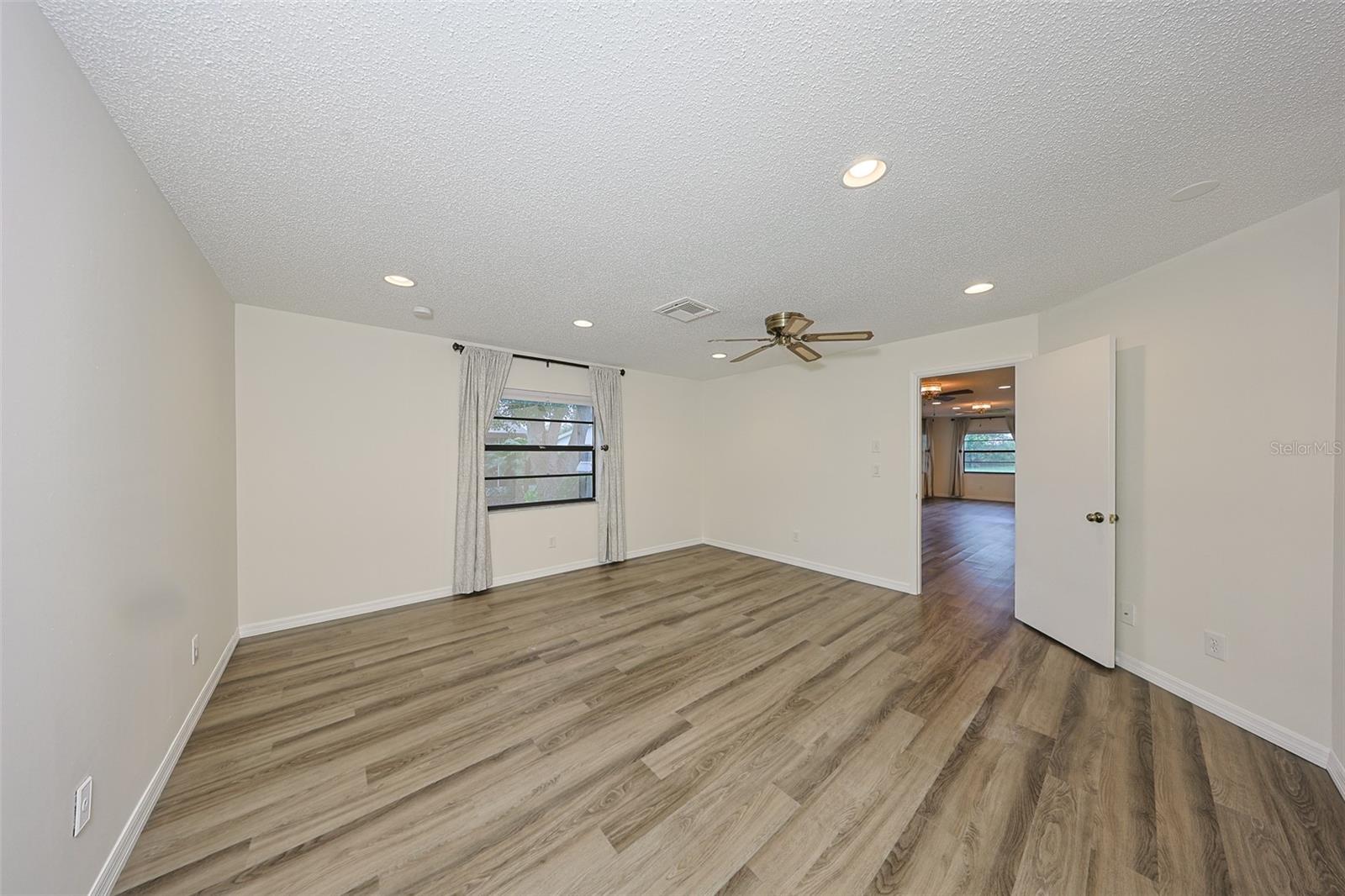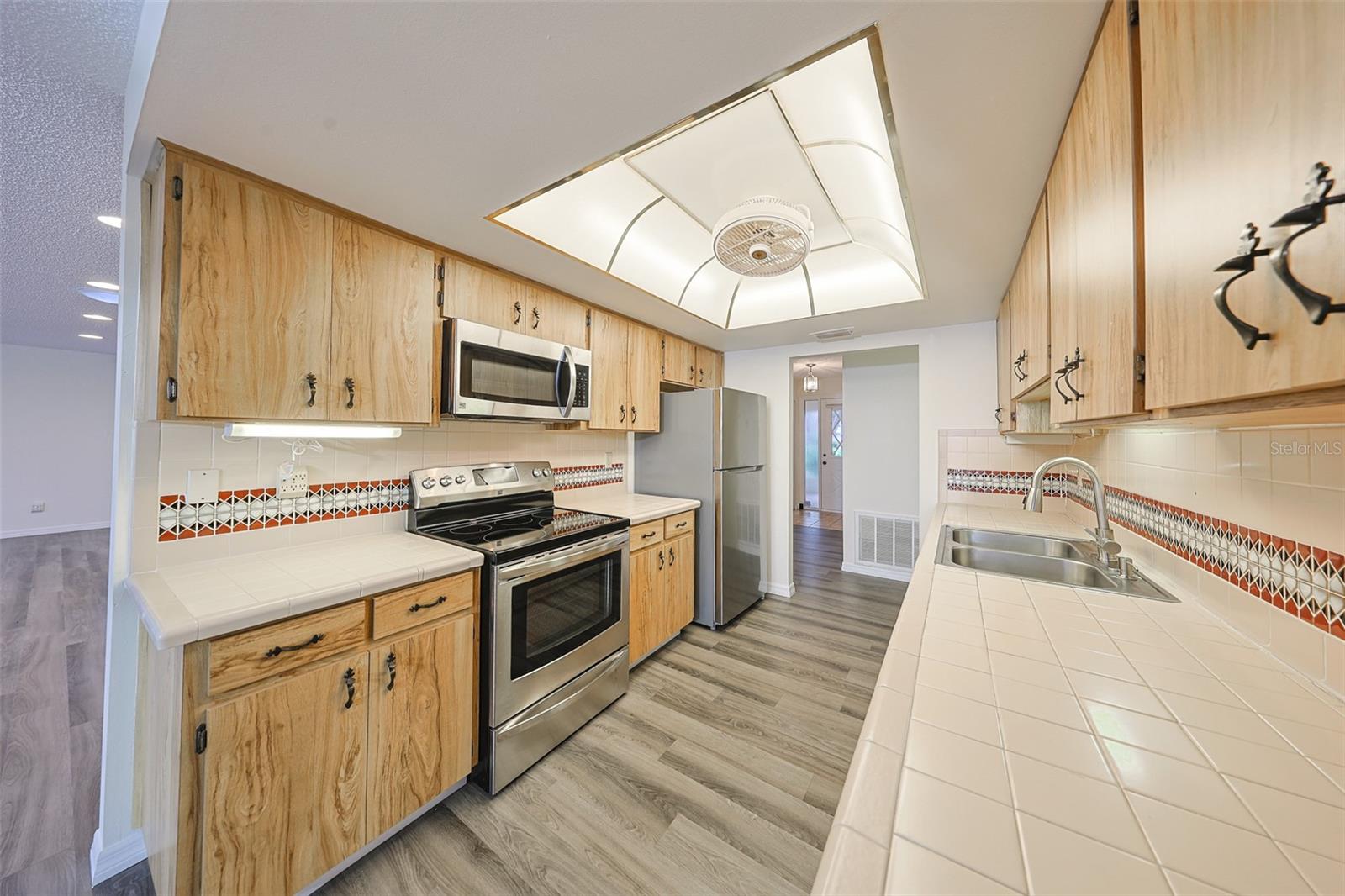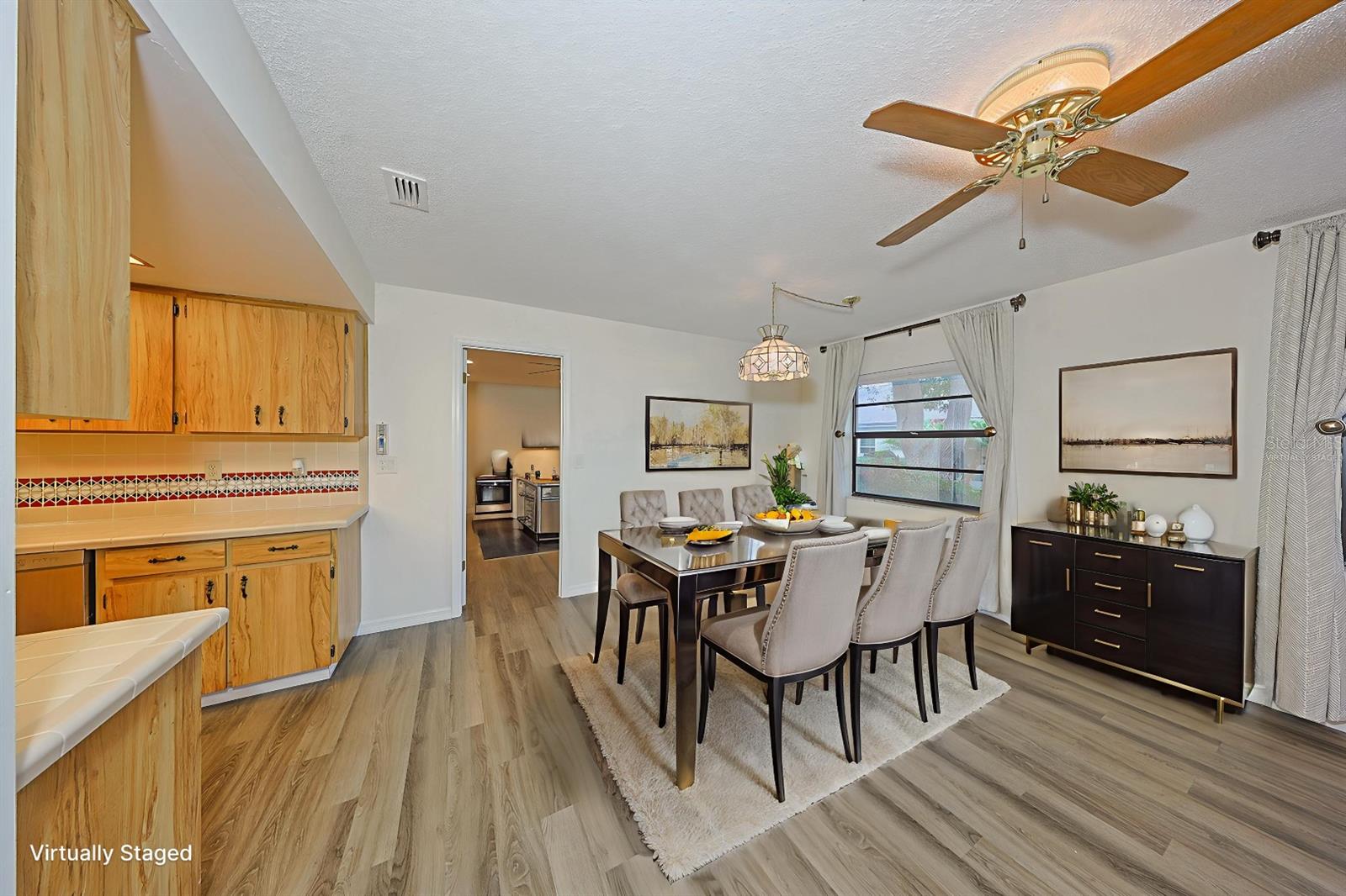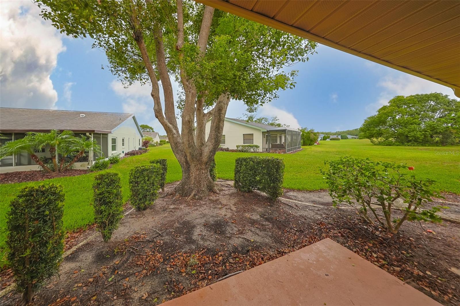 One or more photo(s) has been virtually staged. Discover abundant space and comfort in this expanded Sahara floor plan featuring a desirable split-bedroom layout. Situated in the Gated Community of Kings Point and a part of Sun City Center which was Recognized as the #1 Retirement Community for 2024 by Realtor.com and Travel + Leisure Magazine. This home has been nicely updated for modern living with expansive windows throughout the home offering peaceful views of surrounding green space. All windows have new blinds that may be raised from the bottom or lowered from the top for maximum flexibility. The garage is roomy enough for 2 cars and storage space. A fresh coat of paint was just completed for the exterior. Recent upgrades include new vanities in both the primary and guest bathrooms, luxury vinyl plank flooring (2022), a new electrical panel (2025), new roof (2025), new refrigerator (2025), hot water heater (2021), and HVAC system (2019). The generous primary suite boasts a custom-designed walk-in closet. All walls and ceilings have a fresh coat of paint. Enjoy your morning coffee or evening drink on the inviting screened front porch. Additional highlights include upgraded toilets with bidet attachments in both bathrooms and Updated LED recessed lighting with dimmer switches throughout the main living area. There is room on the back for the addition of a 10 X 25 Screened Lanai. Living in Kings Point means access to a truly resort-style lifestyle. Take advantage of world-class amenities including the North Clubhouse with indoor and outdoor pools, spas, and Veterans Theatre. The South Club has both indoor and outdoor pools and SPA/Hot tub, the popular Sports Bar for watching your favorite team and Palm Court Cafe for breakfast lunch and dinner, plus a fitness center and stained glass studio. Then there is the Nantucket Pool for quiet relaxation and another SPA/Hot tub. The 2020 Centre houses the Ladies Serenity SPA plus a world class fitness center. Other activities include pickleball, golf, lawn bowling, billiards, cards, model railroad, stained glass, pottery, and live shows at the Veterans Theater. The entire community is golf cart accessible for convenient access to shopping, medical facilities, and social events. Luxury, comfort, and community await, welcome to your new home!
