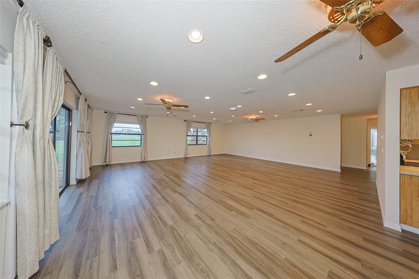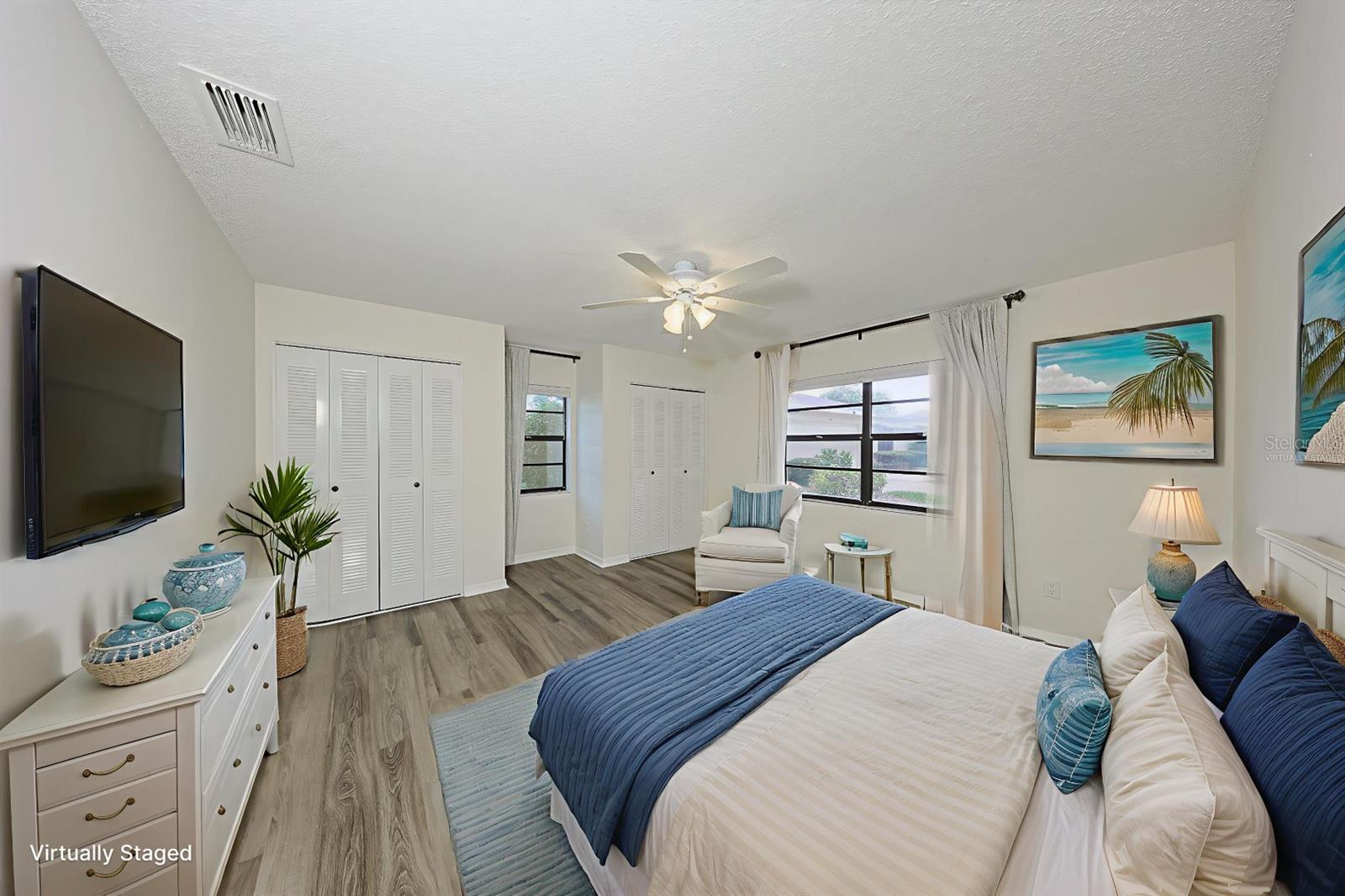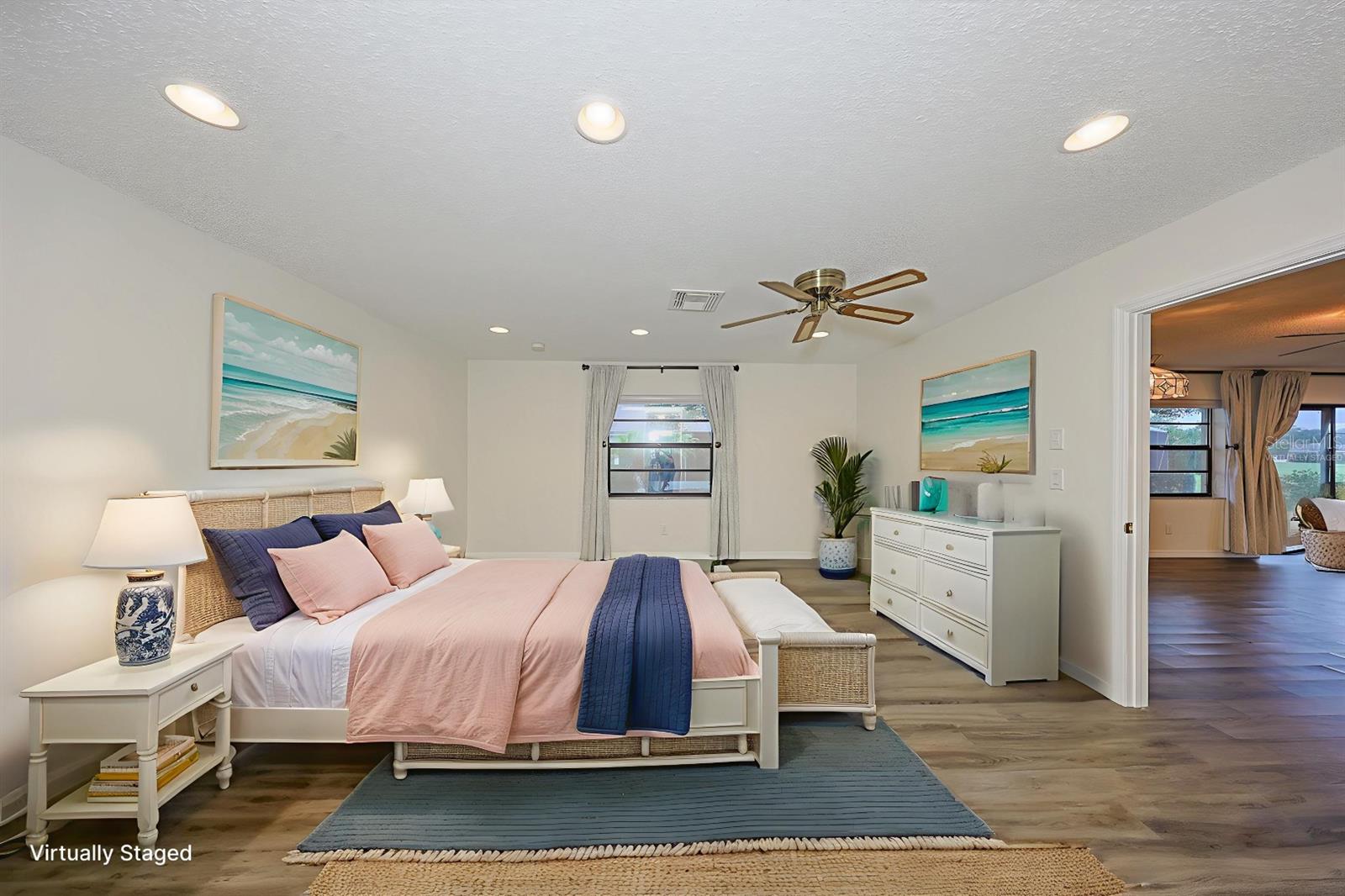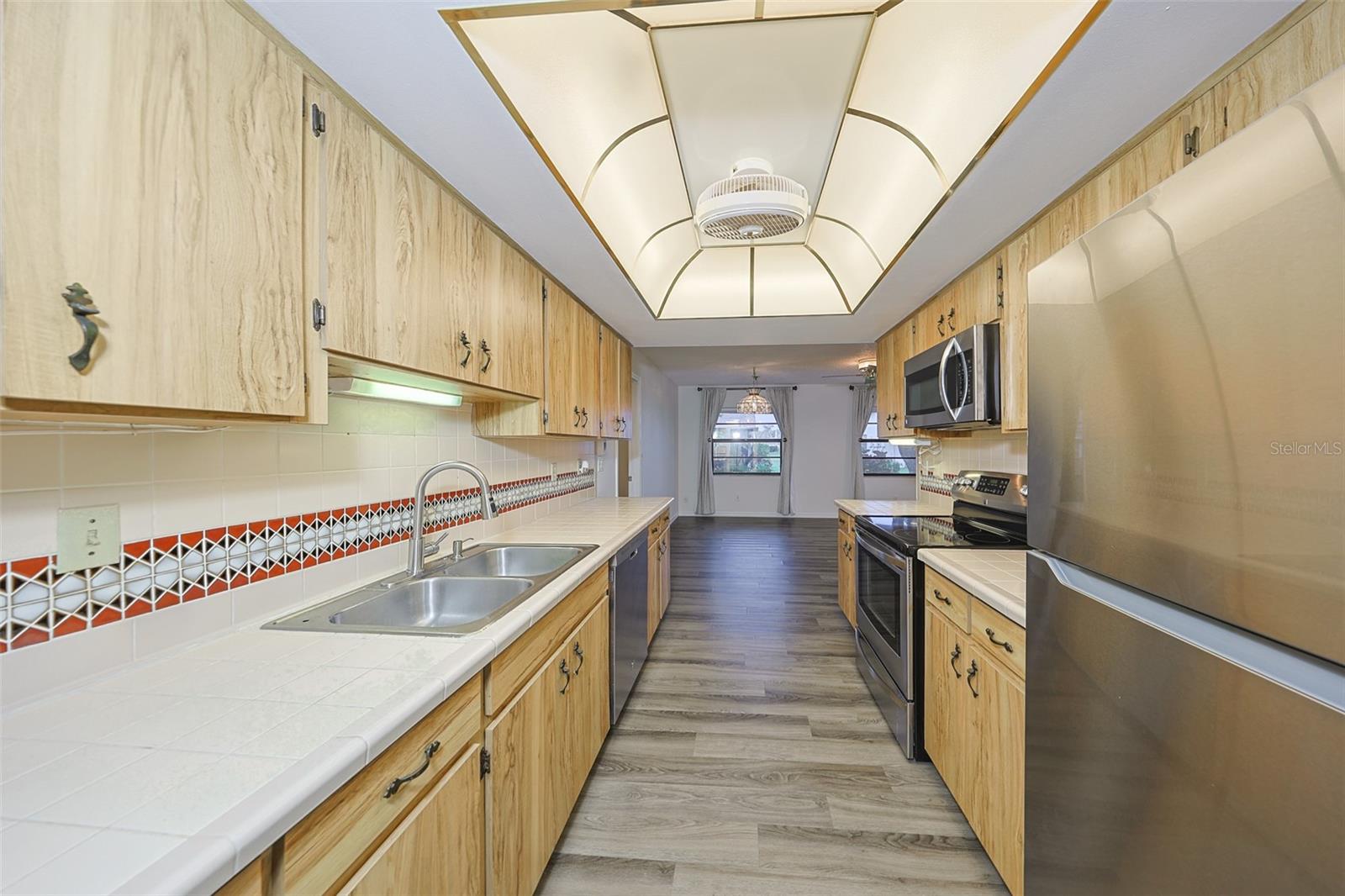 One or more photo(s) has been virtually staged. Discover abundant space and comfort in this expanded Sahara floor plan featuring a desirable split-bedroom layout. Situated in the Gated Community of Kings Point and a part of Sun City Center which was Recognized as the #1 Retirement Community for 2024 by Realtor.com and Travel + Leisure Magazine. This home has been nicely updated for modern living with expansive windows throughout the home offering peaceful views of surrounding green space. All windows have new blinds that may be raised from the bottom or lowered from the top for maximum flexibility. The garage is roomy enough for 2 cars and storage space. A fresh coat of paint was just completed for the exterior. Recent upgrades include new vanities in both the primary and guest bathrooms, luxury vinyl plank flooring (2022), a new electrical panel (2025), new roof (2025), new refrigerator (2025), hot water heater (2021), and HVAC system (2019). The generous primary suite boasts a custom-designed walk-in closet. All walls and ceilings have a fresh coat of paint. Enjoy your morning coffee or evening drink on the inviting screened front porch. Additional highlights include upgraded toilets with bidet attachments in both bathrooms and Updated LED recessed lighting with dimmer switches throughout the main living area. There is room on the back for the addition of a 10 X 25 Screened Lanai. Living in Kings Point means access to a truly resort-style lifestyle. Take advantage of world-class amenities including the North Clubhouse with indoor and outdoor pools, spas, and Veterans Theatre. The South Club has both indoor and outdoor pools and SPA/Hot tub, the popular Sports Bar for watching your favorite team and Palm Court Cafe for breakfast lunch and dinner, plus a fitness center and stained glass studio. Then there is the Nantucket Pool for quiet relaxation and another SPA/Hot tub. The 2020 Centre houses the Ladies Serenity SPA plus a world class fitness center. Other activities include pickleball, golf, lawn bowling, billiards, cards, model railroad, stained glass, pottery, and live shows at the Veterans Theater. The entire community is golf cart accessible for convenient access to shopping, medical facilities, and social events. Luxury, comfort, and community await, welcome to your new home!