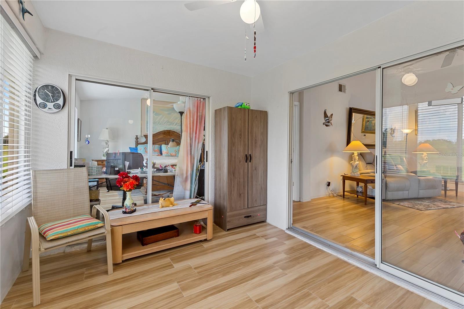 Welcome to this beautifully maintained home offering peaceful water views and the relaxed Florida lifestyle that makes Kings Point one of the most desirable 55+ communities in Sun City Center. As you enter through the enclosed front entry and step into the foyer, you are immediately greeted by a tranquil view of the pond and scenic nature trails beyond. These picturesque paths are perfect for walking, biking, or golf cart cruising, and it’s not uncommon to see neighbors fishing along the water’s edge. This serene setting can be enjoyed from multiple rooms in the home, including the Great Room, Kitchen, Florida Room, and the spacious Primary Bedroom. The thoughtfully designed split-bedroom floor plan provides privacy for both homeowners and guests. The expansive Great Room features soaring ceilings and flows seamlessly into the L-shaped dining area, creating an inviting space ideal for entertaining or enjoying quiet evenings at home. Neutral décor throughout creates a bright and welcoming atmosphere. Beautiful wood-look porcelain tile flooring extends through most of the home, while the foyer, kitchen, and bathrooms feature ceramic tile. The updated kitchen (2025) showcases elegant granite countertops and backsplash, a pantry for additional storage, and a new garbage disposal (2024). The spacious Primary Suite offers both a large walk-in closet and a full wall closet, providing exceptional storage. The Primary Bath includes a long mirrored vanity, glass-enclosed shower, and linen closet. The Florida Room is a wonderful extension of the living space, surrounded by three walls of windows and featuring an additional exterior door leading to the grilling area—perfect for enjoying Florida’s beautiful weather year-round. Additional features include ceiling fans throughout, a garage workbench, pull-down attic ladder for extra storage, electric vehicle hookup, and washer (2025) and dryer in the garage. The roof was replaced in July 2025, providing peace of mind for the next owner. A transferable rented parking space is also available for an RV, boat, or additional vehicle. Living in Kings Point means embracing an active, resort-style lifestyle. Residents enjoy access to multiple clubhouses, indoor and outdoor pools, fitness centers, pickleball and tennis courts, lawn bowling, a theater, restaurant, library, arts and crafts studios, and more than 200 clubs and social organizations. The community also offers 24-hour gated security, an emergency squad, and golf cart-friendly streets, making it easy to get around and stay connected with neighbors and activities. If you are looking for beautiful views, thoughtful upgrades, and the vibrant lifestyle Kings Point is known for, this home offers the perfect opportunity to enjoy the very best of Florida living.