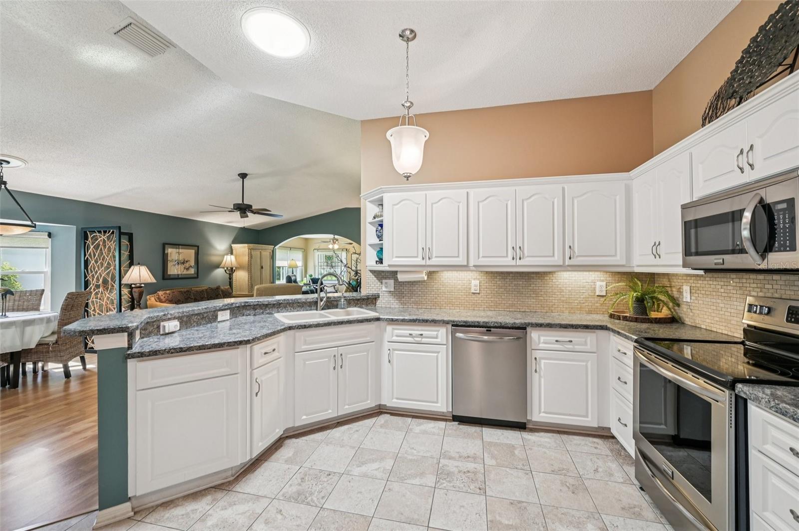 Welcome to this charming 2-bedroom, 2-bath condo with a 1.5 car garage in the highly sought-after Kings Point community of Sun City Center! Approach your private side entrance through a small garden area, where you can enjoy your morning coffee or evening breeze on the covered and screened porch. Inside, you'll find beautiful laminate and tile flooring throughout the main living areas, creating a warm and stylish ambiance. The spacious kitchen with eat in dining is a standout, featuring abundant cabinet space, stainless steel appliances (Refrigerator 1.5-year-old), Solatube Tubular Skylights and a breakfast bar. The living space boasts soaring ceilings with architectural detail and plenty of natural light. Custom window shades throughout. Inside operated hurricane shutters also give peace of mind. The split-bedroom layout ensures privacy, with the primary suite offering a walk-in closet and a private en suite bath with new shower door and slip resistant tile flooring in shower enclosure. Both bathrooms feature raised vanities with granite countertops, new lighting and Solatube Tubular Skylights. Additional highlights include a convenient laundry room , just off the kitchen, with storage above washer. The garage features 12 ft of custom-built shelving with room for both your vehicle and golf cart. This home also features a brand new A/C unit with new roof plans in place by Nantucket I. You’ll love the gated community of Kings Point, which has amazing facilities, pools, clubs and events just waiting for you to enjoy. Located between Sarasota and Tampa, this home is perfectly positioned for a convenient ride to airports, great shopping, dining, and professional entertainment. With easy access to award-winning, sandy beaches, you’ll experience the best of all worlds—without the stress of big city life. Leave the hustle behind and embrace a new chapter in Sun City Center, Florida, the state's top-ranked and most affordable 55+ retirement community. Schedule your showing today!