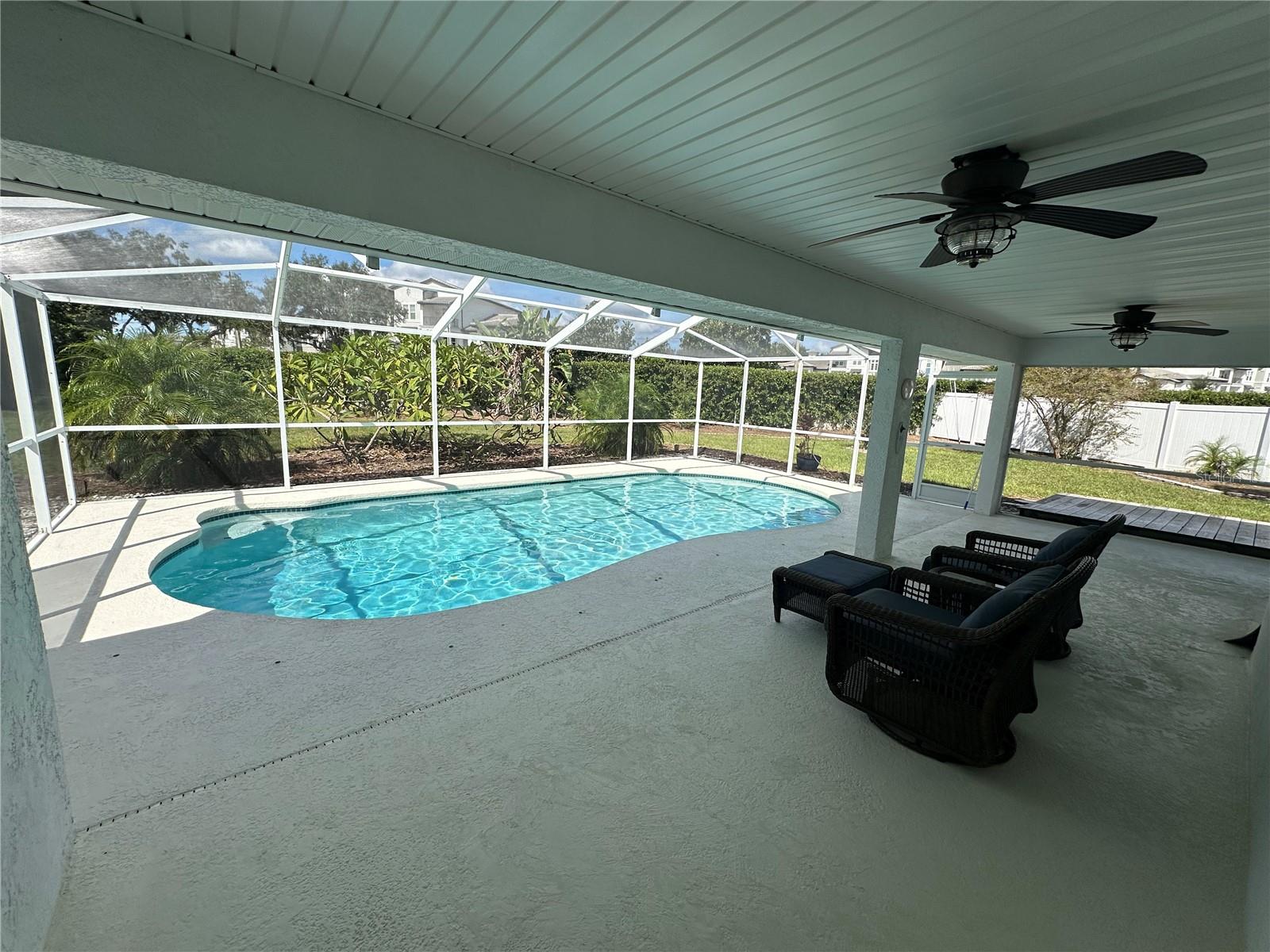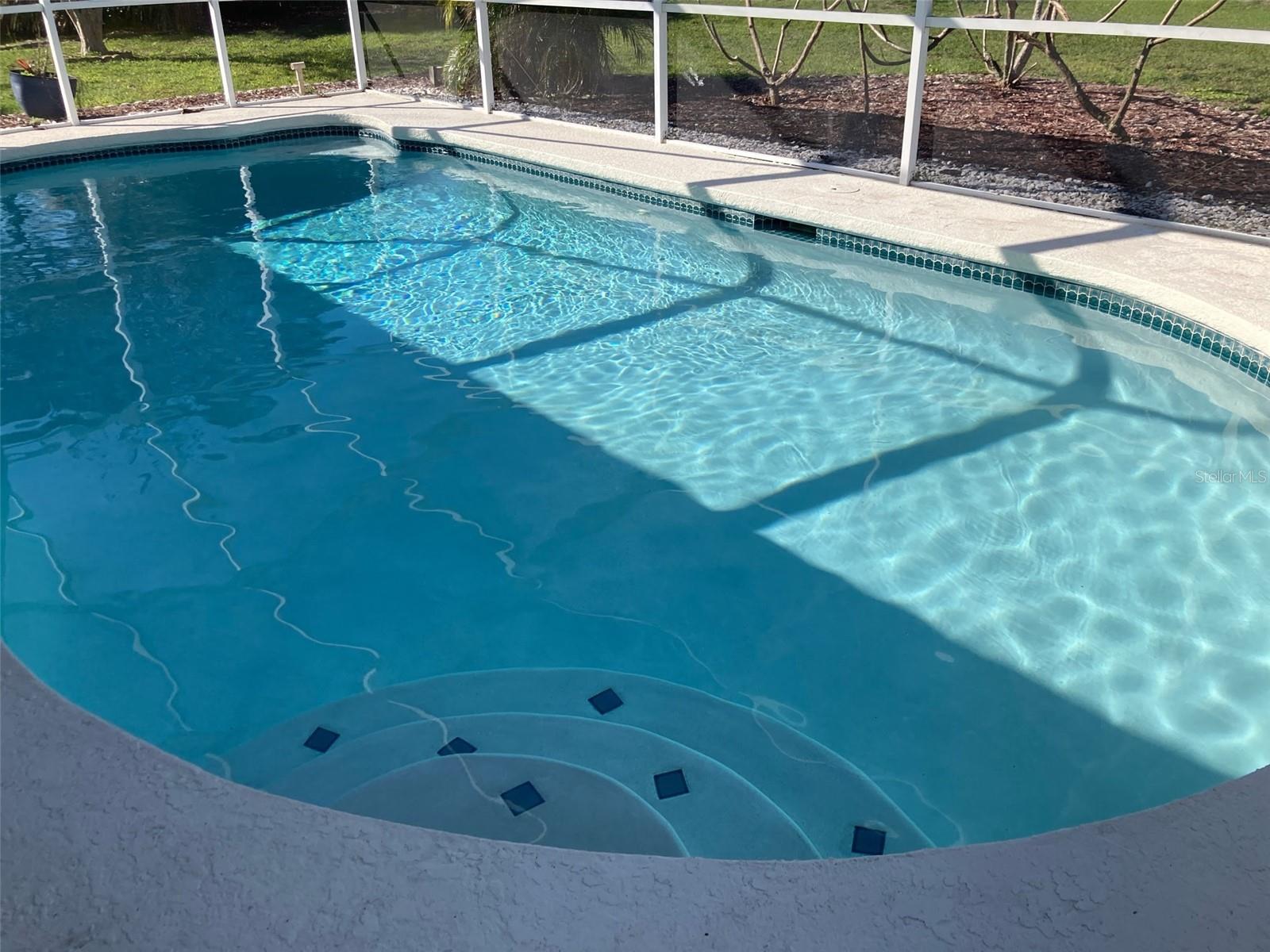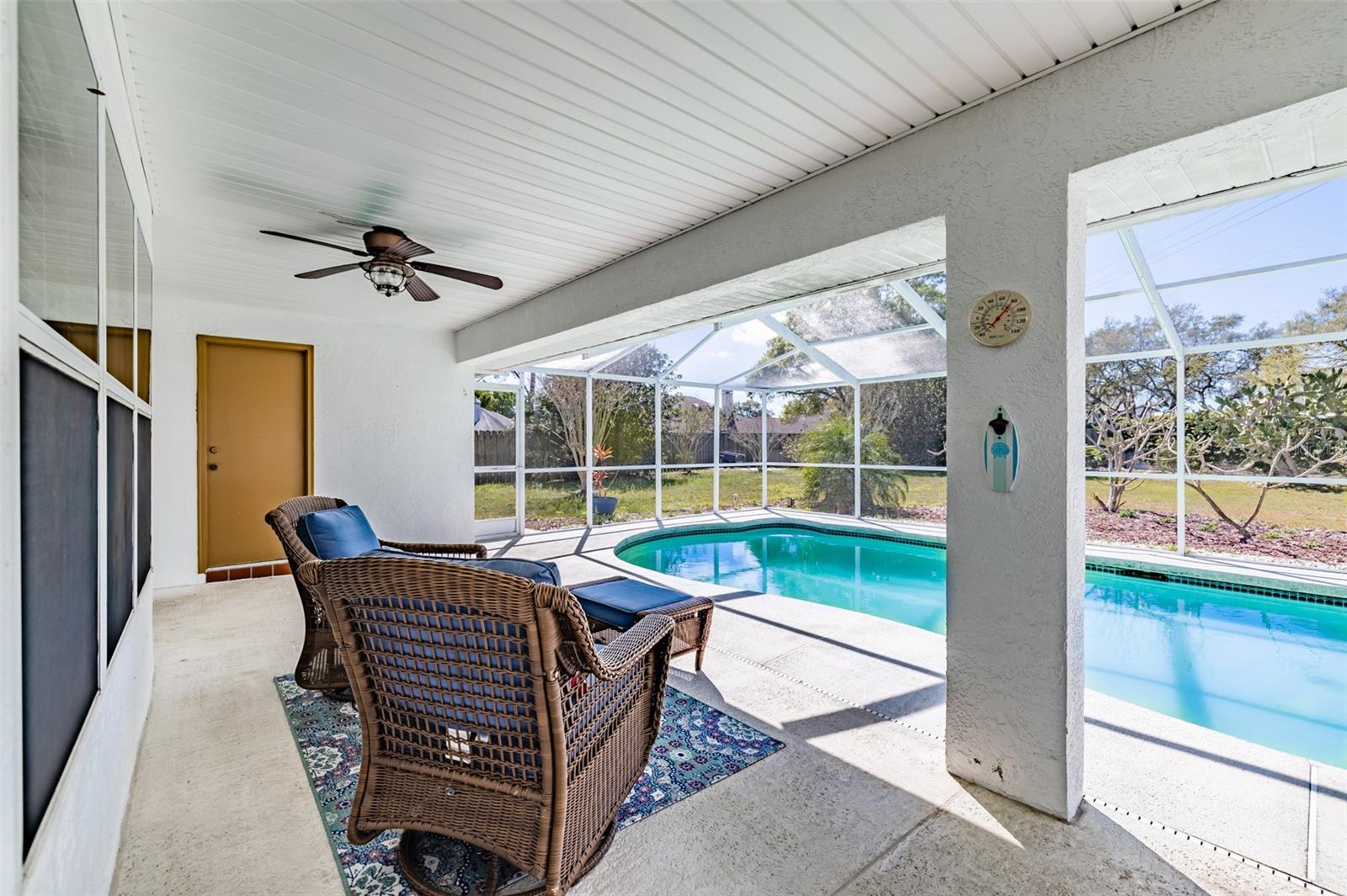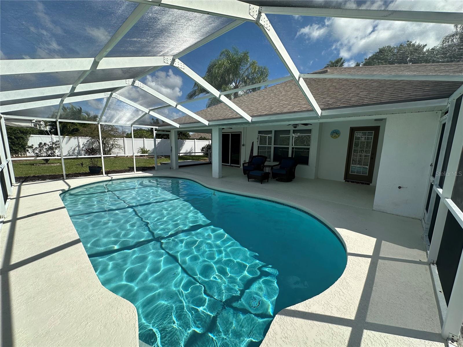 YOUR POOL HOME IS HERE! This beautifully 3-bedroom, 2.5-bathroom, 2-car garage pool home offers the perfect blend of comfort and convenience. This home delivers peace of mind with extensive upgrades: impact hurricane doors and windows, new AC system (12/2024), water softener (4/2023), water heater tank (4/2023), pool solar panels (1/2024), and pool/deck resurfacing (11/2023). Situated on just over a quarter-acre lot in the highly desirable community of The Villages at Cypress Creek, this residence is packed with desirable features. Inside, you’ll find tile floors throughout, vaulted ceilings, a formal dining room, a kitchen nook, and plenty of storage. The split-bedroom floor plan offers privacy with the Owner’s Suite positioned at the back of the home. The suite includes a walk-in closet, double vanity, walk-in shower, private toilet room, and direct access to the back patio and pool area. Two additional bedrooms share a full bathroom at the front of the home. A conveniently located half bath by the pool adds extra functionality for outdoor entertaining. The outdoor living space is a true Florida retreat, featuring a large in-ground pool under a screened lanai, a fully fenced backyard, mature landscaping, and a sprinkler system. The home uses county water and sewer, but also includes a well for irrigation and pool refills. Additional highlights include an exterior storage room and a screened back patio perfect for enjoying year-round. Location is everything, and this home delivers. Conveniently located between Tampa and Sarasota, you’ll enjoy easy access to Tampa Bay marinas and parks (15 minutes), Tampa International Airport (40 minutes), and nearby schools and Community College South Shore. The Villages at Cypress Creek offers a Championship Golf Course, 640-acre Nature Preserve, and annual community events that foster a vibrant neighborhood atmosphere. With low HOA fees, no CDD, and no flood zone, this property offers both value and peace of mind. An unbeatable mix of comfort, upgrades, and location—act now before it’s gone!