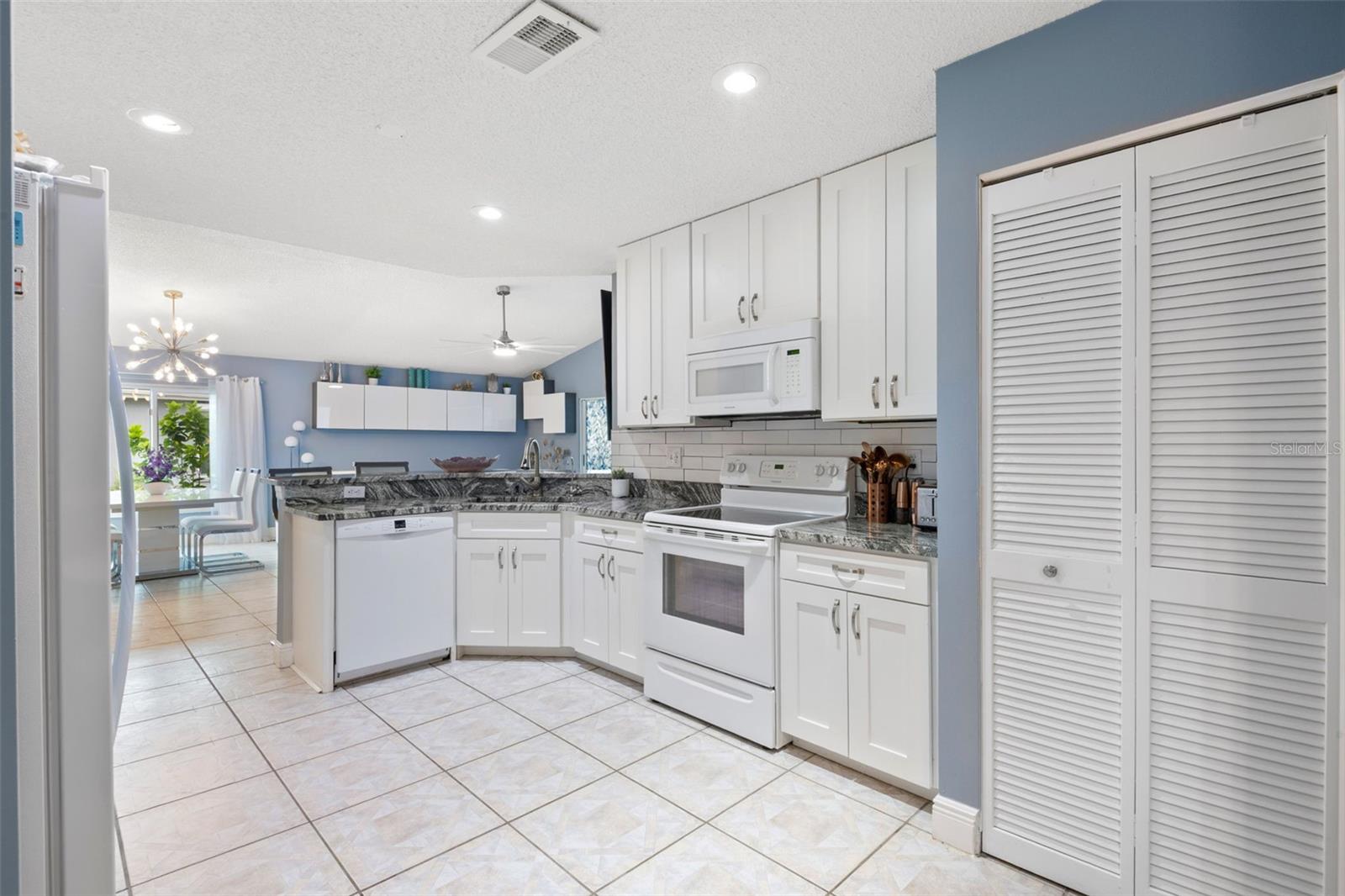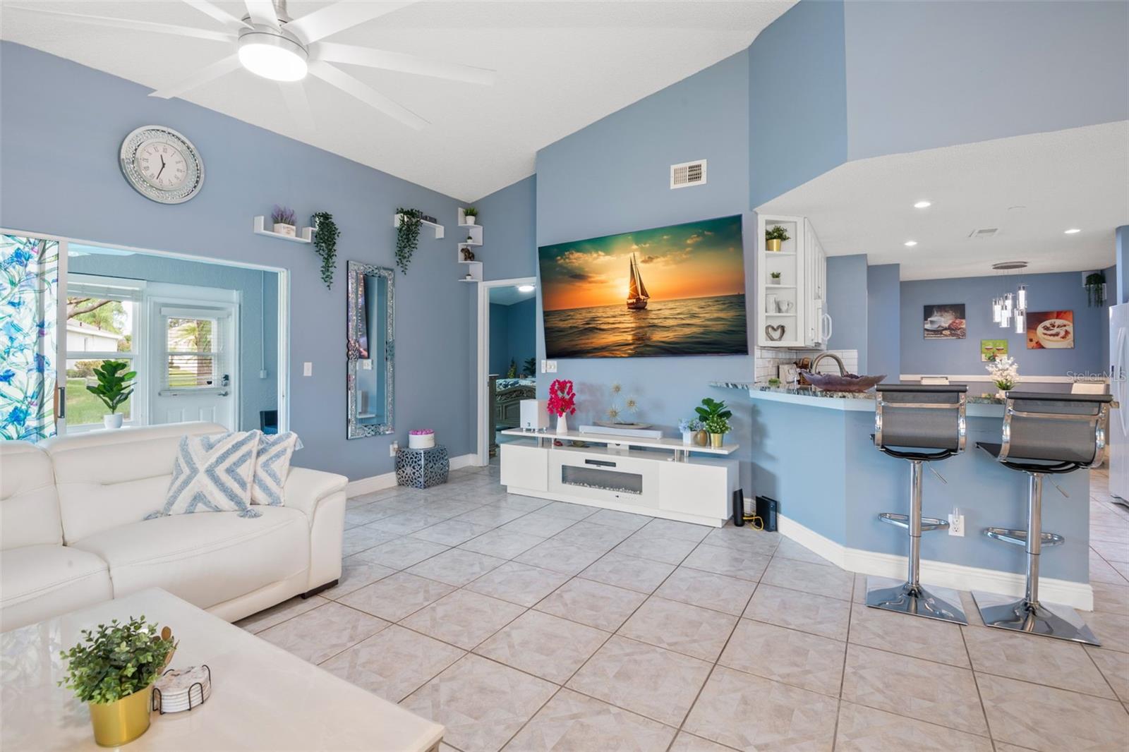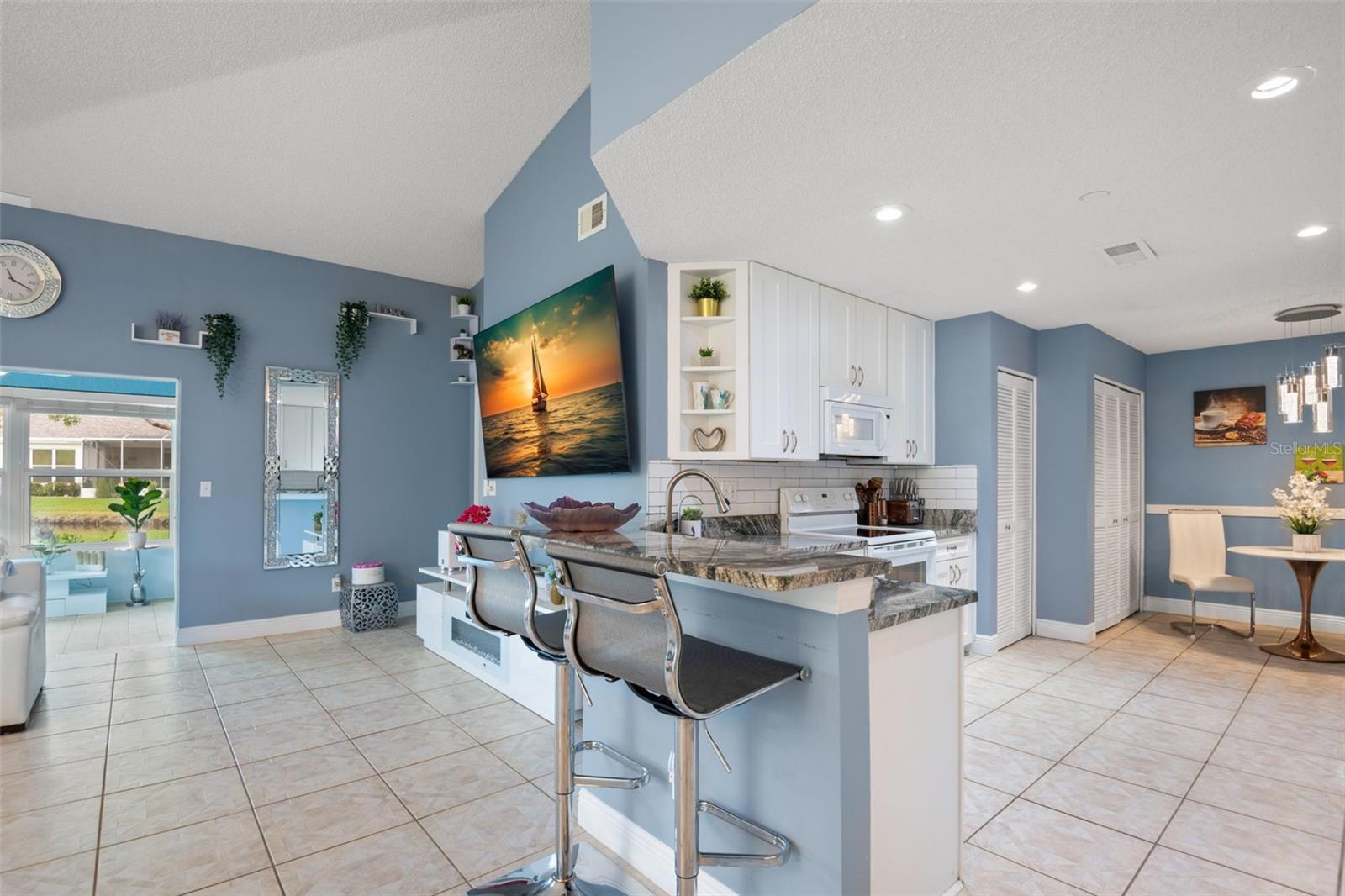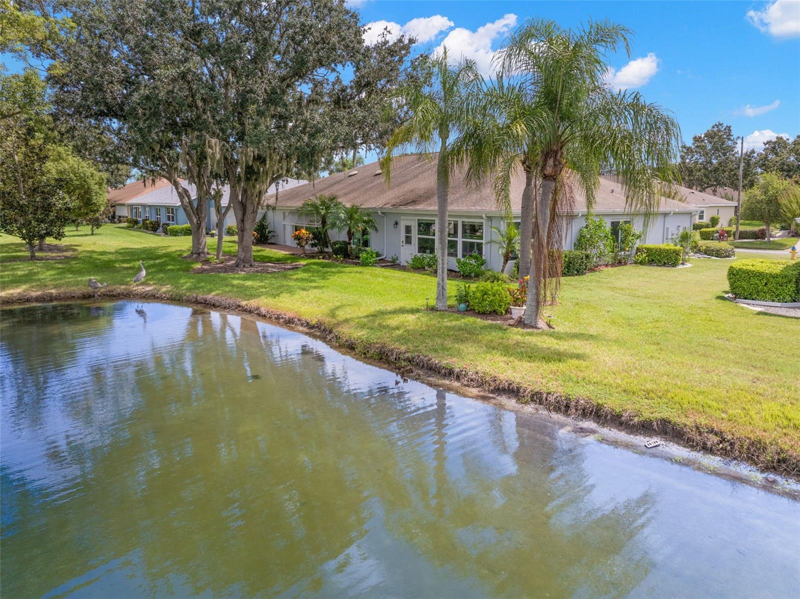One or more photo(s) has been virtually staged. **Water Views! ** Hurricane Windows! ** No CDD ** No Flood Requirement** Experience PRIVACY and water views in this UPDATED condo located in the gated community of Kings Point! With resort-style amenities, you'll thrive in this golf cart-friendly 55+ location that offers a wealth of activities, including over 200 clubs to join, multiple indoor/outdoor heated pools, fitness facilities, pickleball, an onsite salon, restaurants, and much more! This sought-after Sandpiper split floor plan has 2 bedrooms, 2 full bathrooms, a Florida room, and a 2-car garage. Highlights include HURRICANE WINDOWS, cathedral ceilings, tile flooring throughout, and lots of natural light! An open concept has the living and dining spaces adjacent to the RENOVATED kitchen with GRANITE countertops, white shaker style cabinetry, an eat in space and a breakfast bar that caters to both everyday living and entertaining. The Florida room serves as your bonus area and offers serene views of water and wildlife, including a variety of birds! This versatile space has double pane windows and can be utilized as an office, exercise area, third bedroom, or even a craft room. Mature trees and landscaping enhance privacy, creating a perfect spot to unwind. Back inside, the primary bedroom is in the rear of the home and offers the same views and soaring ceilings! The en-suite bathroom is thoughtfully designed for dual functionality, featuring a separate water closet and shower away from the vanity. You'll also enjoy a spacious walk-in closet that accommodates all your storage needs. The second bedroom is generously sized, easily fitting king-size furniture, and provides immediate access to the second full bathroom. The laundry is located INSIDE making this chore more enjoyable! This association allows for Emotional Support and Service Animals - process is easy and an AGE waiver is younger han 55! MAINTENANCE FREE LIVING that has an ON-SITE property management company and includes lawn care, pest control, water, sewer, trash and cable with 200 channels and internet! If you plan on venturing out there is quick access to restaurants, SHOPPING, beaches & 30 minutes to Tampa International Airport, less than an hour to the Sarasota shops and 20 minutes to Ellenton Prime Outlets!