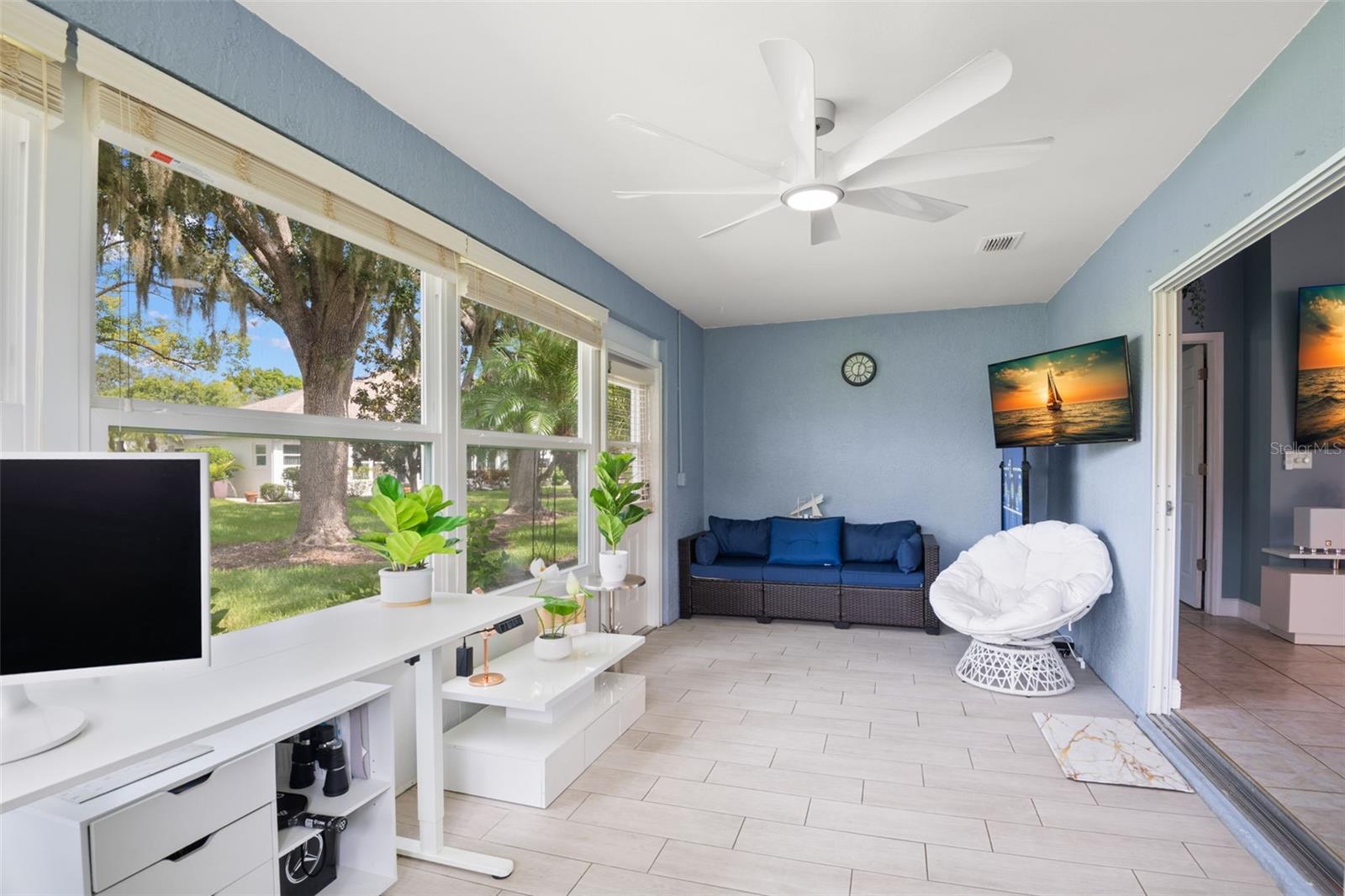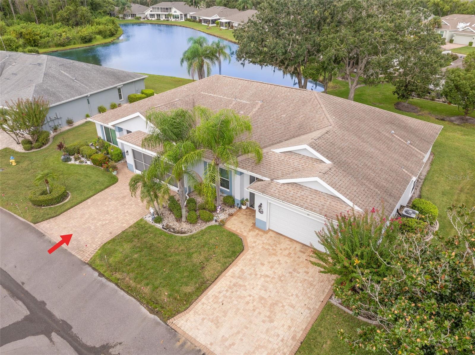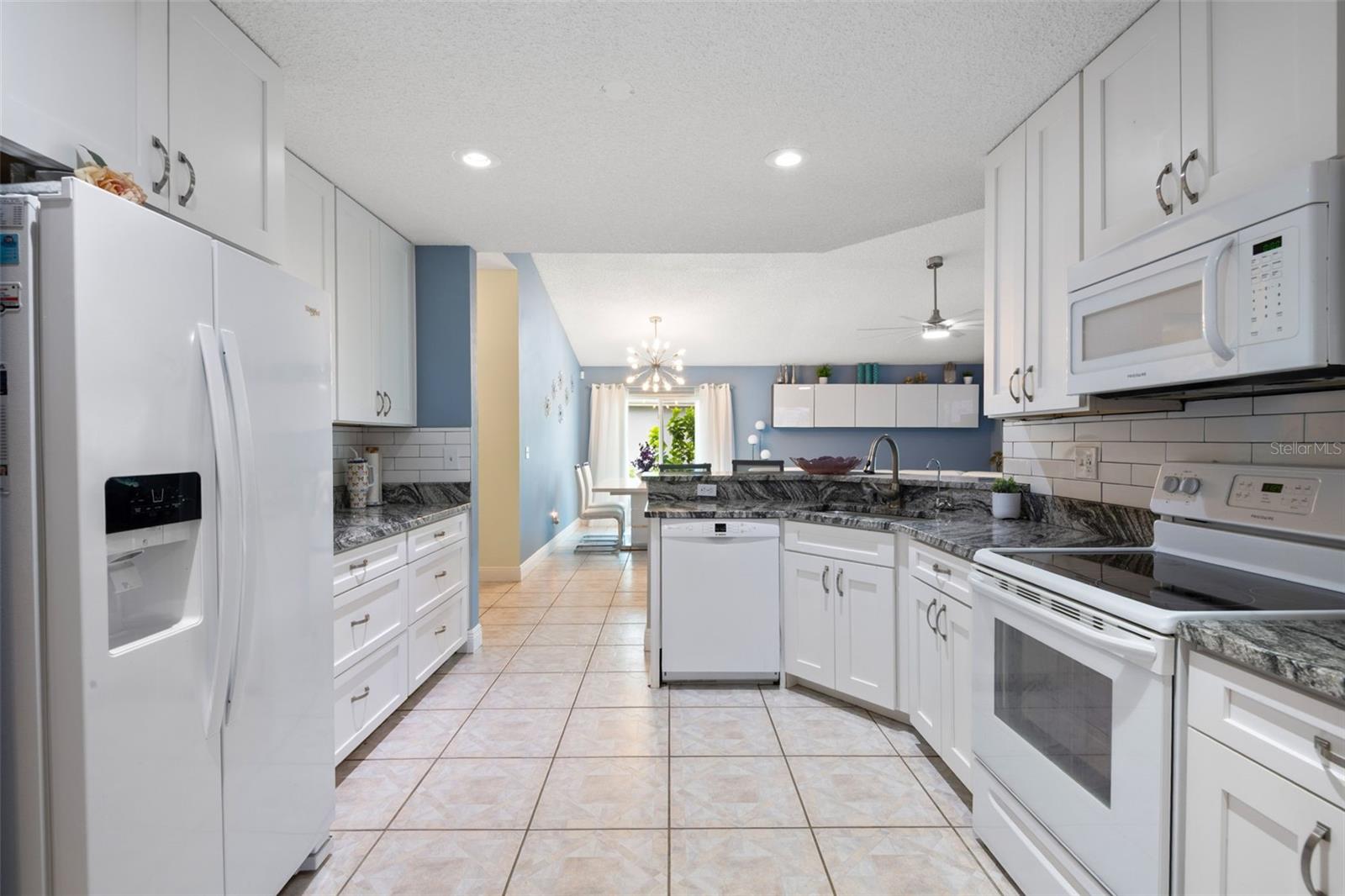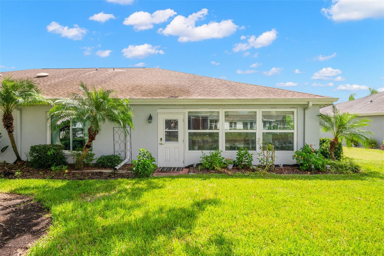 One or more photo(s) has been virtually staged. **Water Views! ** Hurricane Windows! ** No CDD ** No Flood Requirement** Experience PRIVACY and water views in this UPDATED condo located in the gated community of Kings Point! With resort-style amenities, you'll thrive in this golf cart-friendly 55+ location that offers a wealth of activities, including over 200 clubs to join, multiple indoor/outdoor heated pools, fitness facilities, pickleball, an onsite salon, restaurants, and much more! This sought-after Sandpiper split floor plan has 2 bedrooms, 2 full bathrooms, a Florida room, and a 2-car garage. Highlights include HURRICANE WINDOWS, cathedral ceilings, tile flooring throughout, and lots of natural light! An open concept has the living and dining spaces adjacent to the RENOVATED kitchen with GRANITE countertops, white shaker style cabinetry, an eat in space and a breakfast bar that caters to both everyday living and entertaining. The Florida room serves as your bonus area and offers serene views of water and wildlife, including a variety of birds! This versatile space has double pane windows and can be utilized as an office, exercise area, third bedroom, or even a craft room. Mature trees and landscaping enhance privacy, creating a perfect spot to unwind. Back inside, the primary bedroom is in the rear of the home and offers the same views and soaring ceilings! The en-suite bathroom is thoughtfully designed for dual functionality, featuring a separate water closet and shower away from the vanity. You'll also enjoy a spacious walk-in closet that accommodates all your storage needs. The second bedroom is generously sized, easily fitting king-size furniture, and provides immediate access to the second full bathroom. The laundry is located INSIDE making this chore more enjoyable! This association allows for Emotional Support and Service Animals - process is easy and an AGE waiver is younger han 55! MAINTENANCE FREE LIVING that has an ON-SITE property management company and includes lawn care, pest control, water, sewer, trash and cable with 200 channels and internet! If you plan on venturing out there is quick access to restaurants, SHOPPING, beaches & 30 minutes to Tampa International Airport, less than an hour to the Sarasota shops and 20 minutes to Ellenton Prime Outlets!