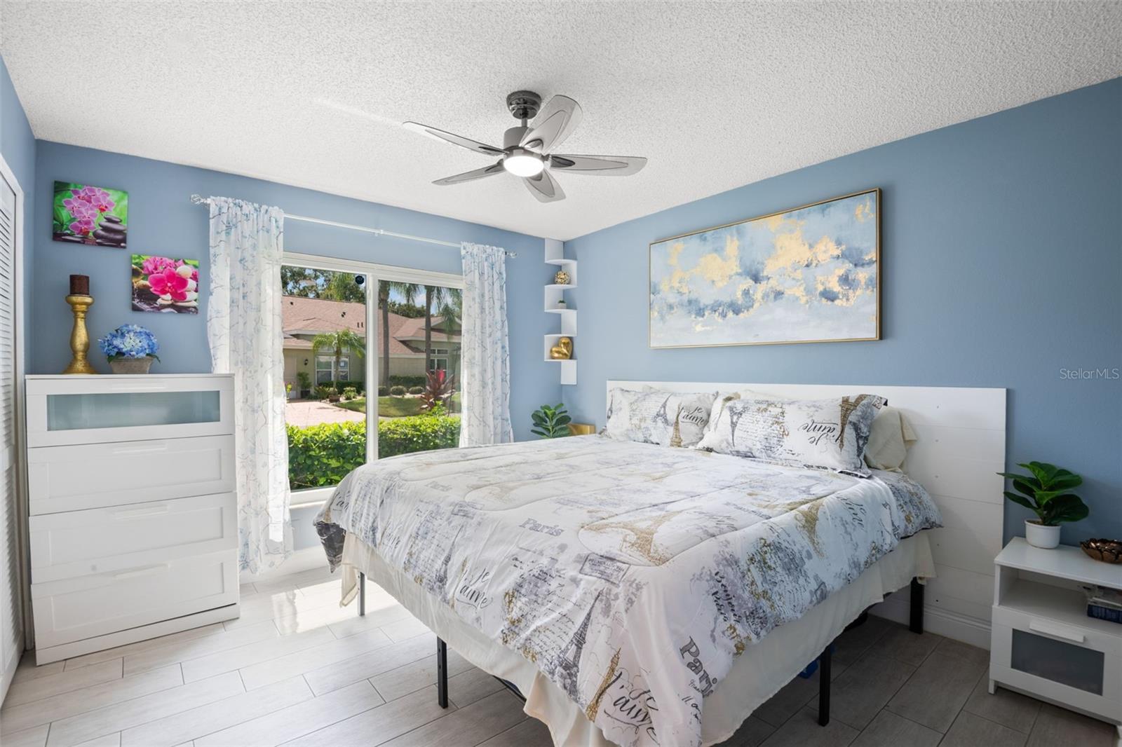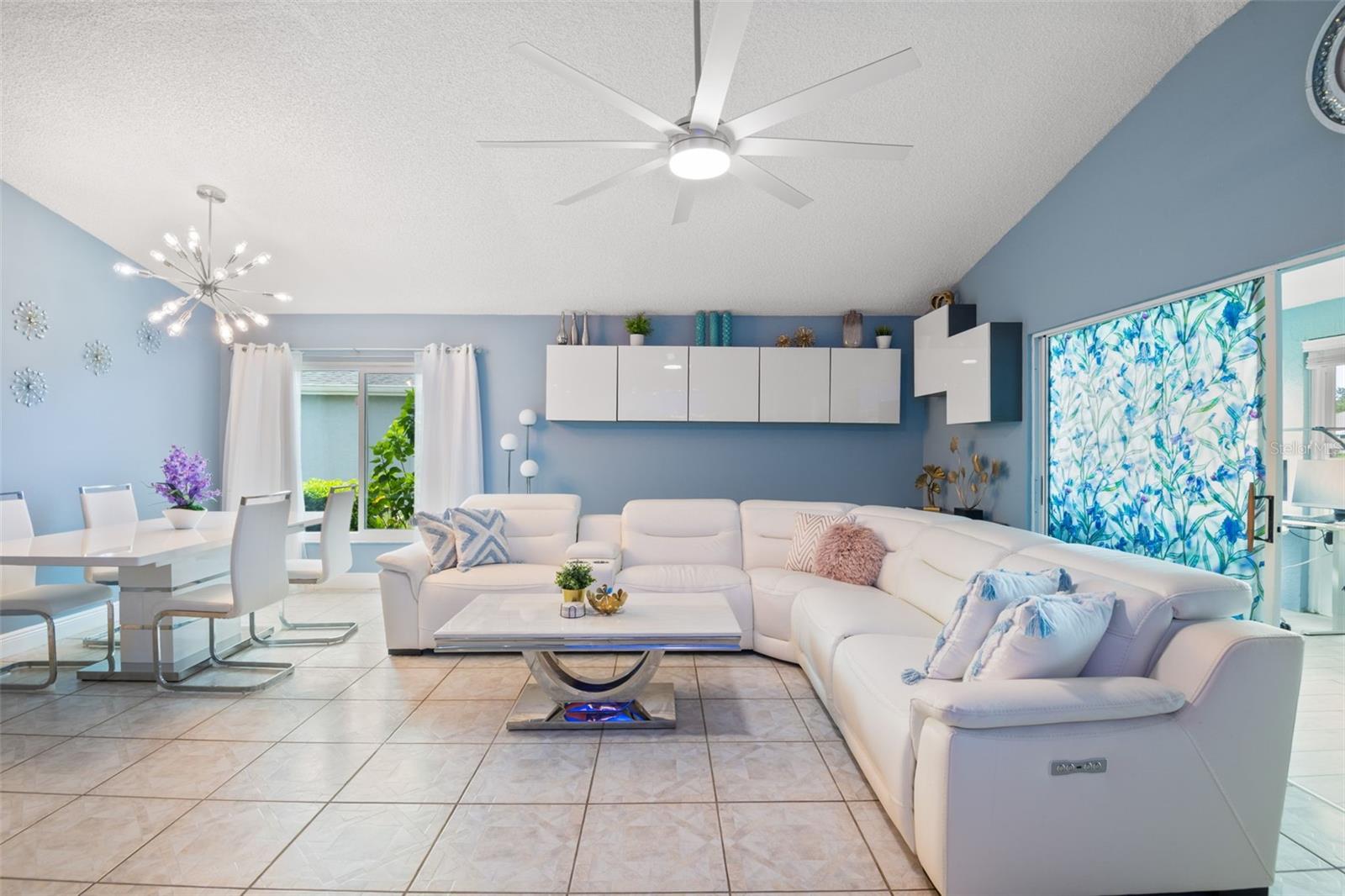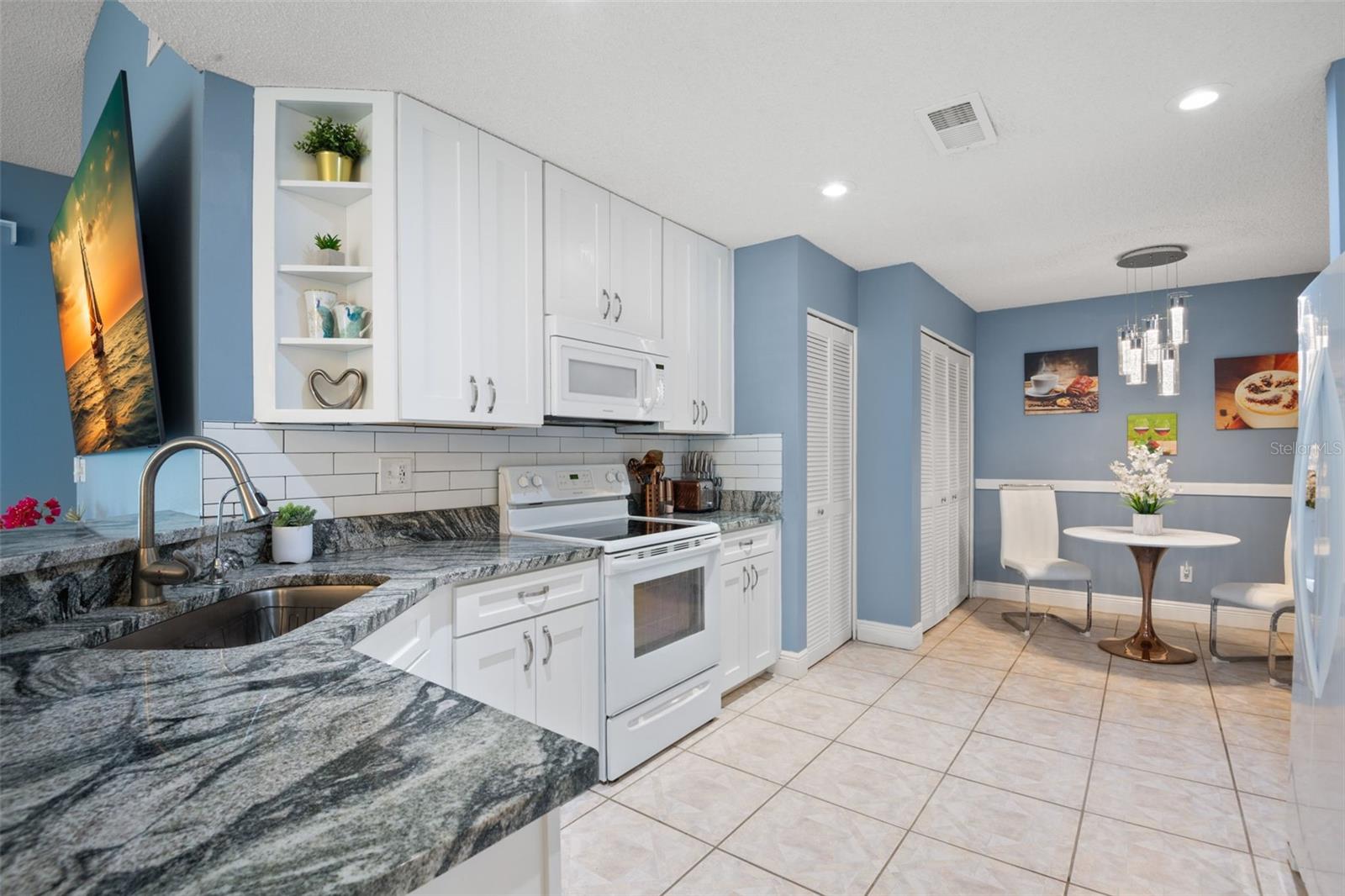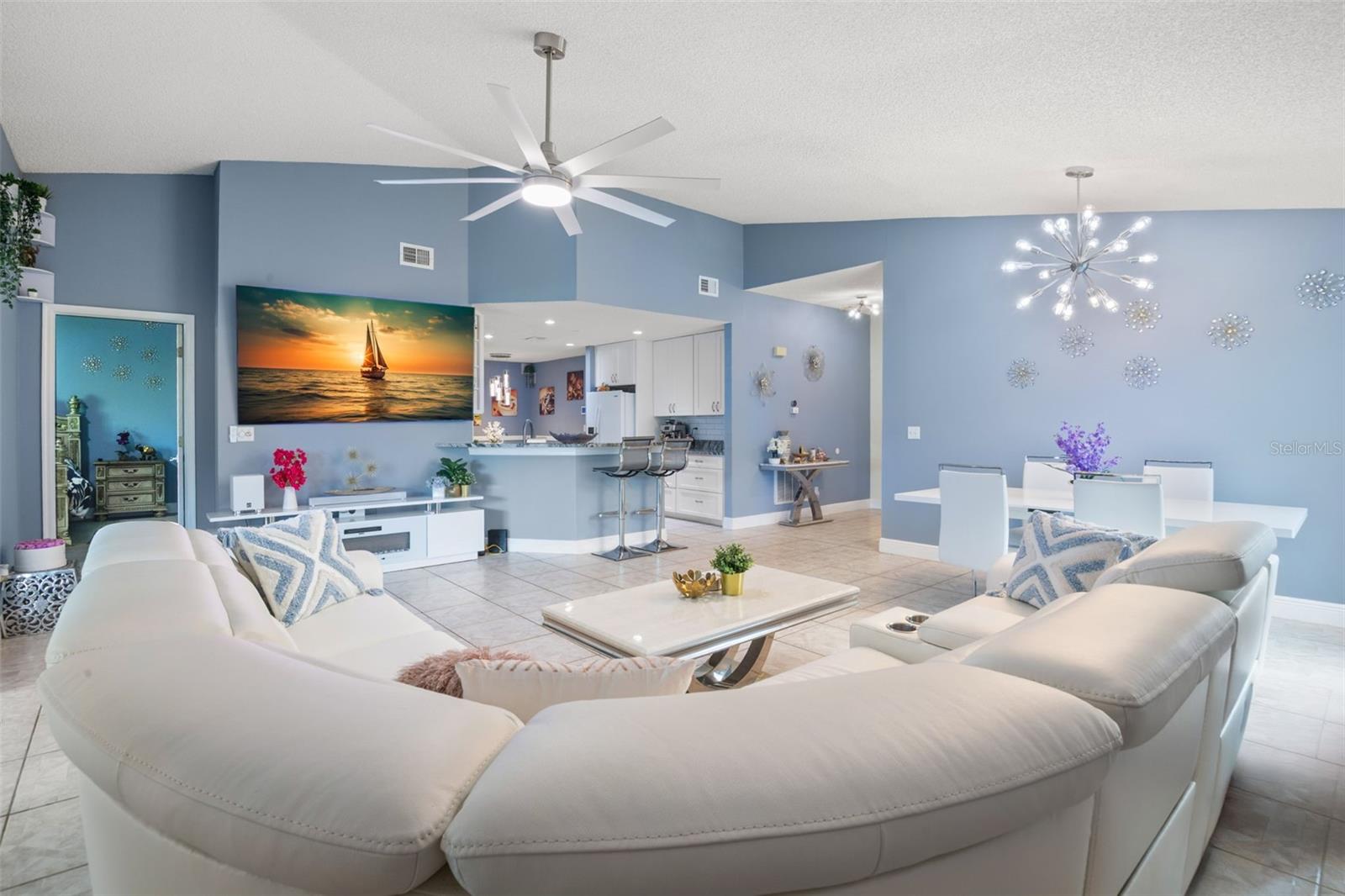 One or more photo(s) has been virtually staged. **Water Views! ** Hurricane Windows! ** No CDD ** No Flood Requirement** Experience PRIVACY and water views in this UPDATED condo located in the gated community of Kings Point! With resort-style amenities, you'll thrive in this golf cart-friendly 55+ location that offers a wealth of activities, including over 200 clubs to join, multiple indoor/outdoor heated pools, fitness facilities, pickleball, an onsite salon, restaurants, and much more! This sought-after Sandpiper split floor plan has 2 bedrooms, 2 full bathrooms, a Florida room, and a 2-car garage. Highlights include HURRICANE WINDOWS, cathedral ceilings, tile flooring throughout, and lots of natural light! An open concept has the living and dining spaces adjacent to the RENOVATED kitchen with GRANITE countertops, white shaker style cabinetry, an eat in space and a breakfast bar that caters to both everyday living and entertaining. The Florida room serves as your bonus area and offers serene views of water and wildlife, including a variety of birds! This versatile space has double pane windows and can be utilized as an office, exercise area, third bedroom, or even a craft room. Mature trees and landscaping enhance privacy, creating a perfect spot to unwind. Back inside, the primary bedroom is in the rear of the home and offers the same views and soaring ceilings! The en-suite bathroom is thoughtfully designed for dual functionality, featuring a separate water closet and shower away from the vanity. You'll also enjoy a spacious walk-in closet that accommodates all your storage needs. The second bedroom is generously sized, easily fitting king-size furniture, and provides immediate access to the second full bathroom. The laundry is located INSIDE making this chore more enjoyable! This association allows for Emotional Support and Service Animals - process is easy and an AGE waiver is younger han 55! MAINTENANCE FREE LIVING that has an ON-SITE property management company and includes lawn care, pest control, water, sewer, trash and cable with 200 channels and internet! If you plan on venturing out there is quick access to restaurants, SHOPPING, beaches & 30 minutes to Tampa International Airport, less than an hour to the Sarasota shops and 20 minutes to Ellenton Prime Outlets!