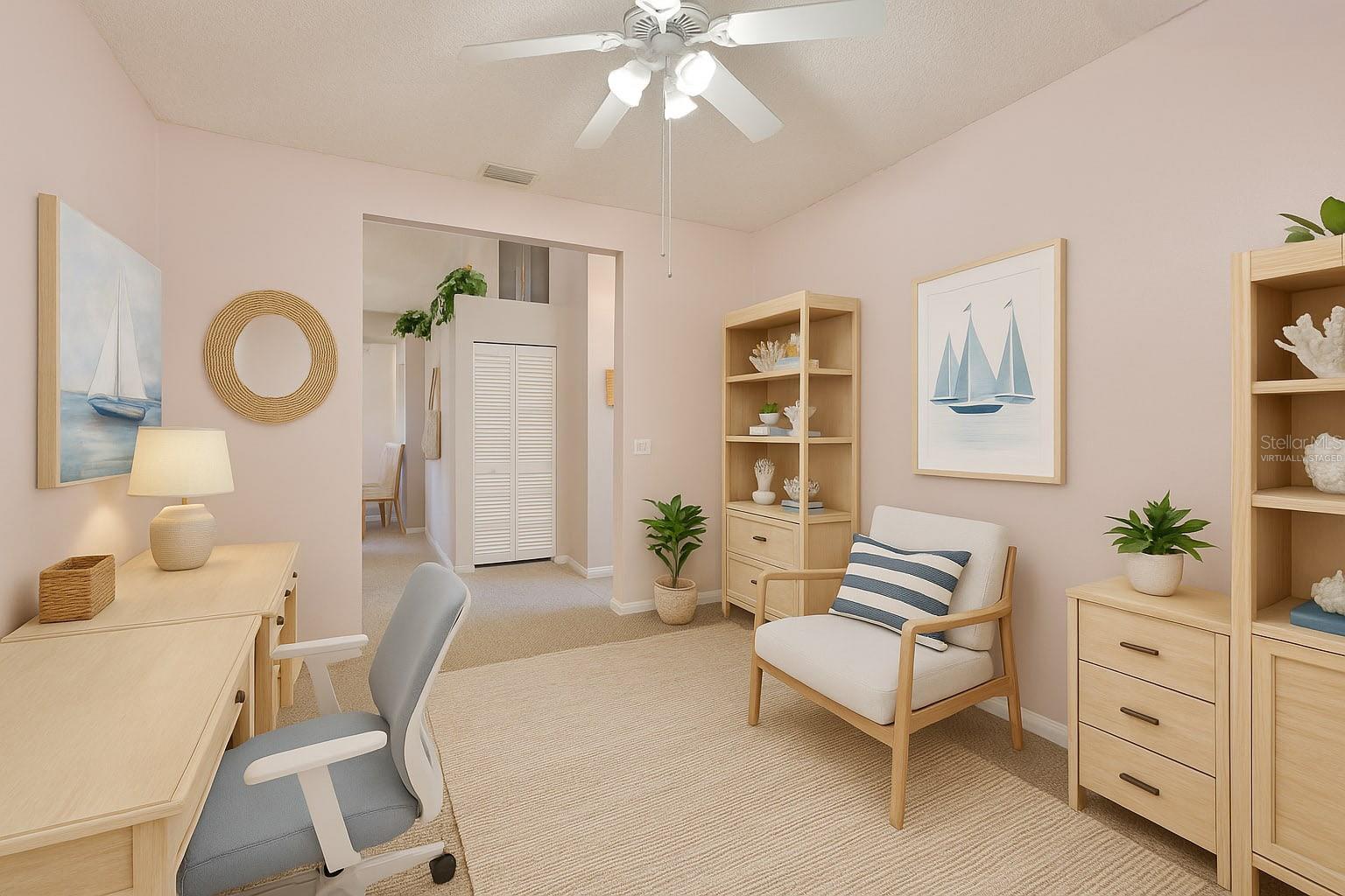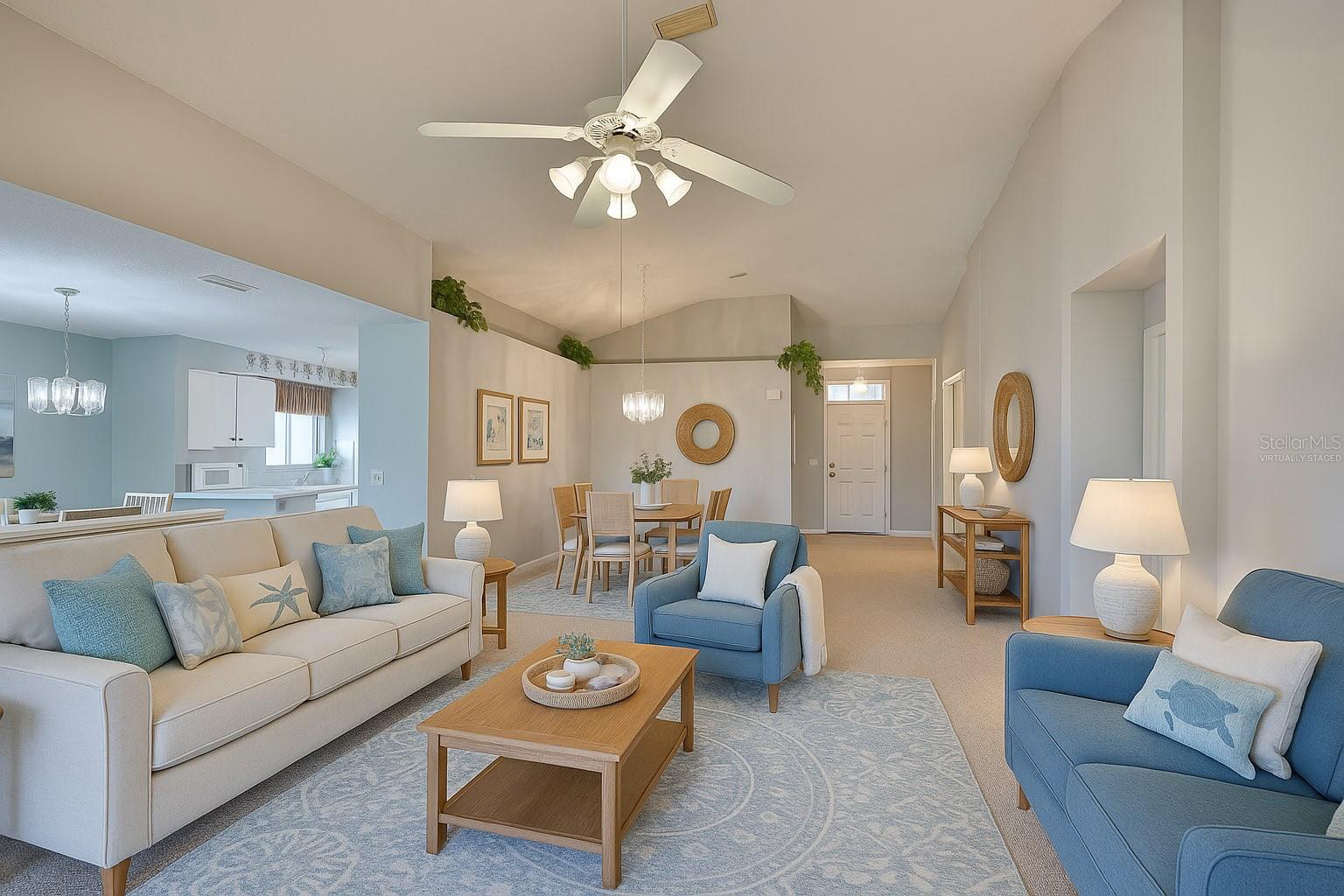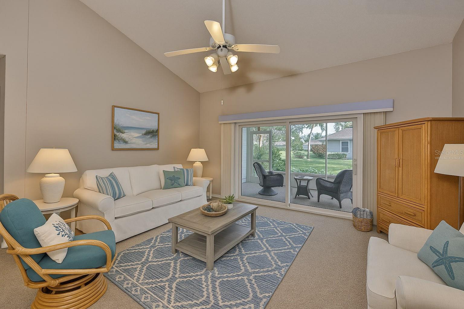 One or more photo(s) has been virtually staged. Enjoy a maintenance free lifestyle in this spacious 1,600 sq ft 2 bedroom, 2 bathroom plus DEN Malibu floorplan with attached garage and two screened lanais. Just bring your toothbrush and start living the dream in the fabulous Resort Style 55+ gated Kings Point community in Sun City Center, FL. Located in Manchester III neighborhood of Kings Point close to the South Clubhouse, this fabulous Malibu floor plan features 2 bedrooms, 2 bathrooms plus a Den/Flex room that is perfect for a den/office or even a third bedroom. This home features a NEW ROOF in 2025, a Paver driveway, screened entryway, two screened lanais, and dual pane windows throughout. Upon entering the home you'll have a clear sightline through the main room to the screened lanai and beautiful shaded backyard. The guest bedroom and bathroom are located in the front of the home, and the guest bathroom has a tub/shower combo. The main bedroom has a vaulted ceiling, large walk-in closet, and an en-suite bathroom with an oversized walk-in shower. The Living/Dining room has a vaulted ceiling and is perfect for entertaining. The kitchen has a large eat-in area with a sliding glass door leading to the second screened lanai making it the perfect spot to enjoy your morning coffee and nature. Inside laundry. Your monthly Condo fees includes gated security with 24-hour guard, cable, Internet, building insurance, roof and exterior maintenance, grounds maintenance, pest control, recreational facilities, water, escrow reserves, fidelity bond and all of the incredible amenities. Kings Point is a golf cart friendly, resort-style community with two beautiful clubhouses, an 850-seat Theater, 6 heated pools, 2 hot tubs, state-of-the-art fitness centers, a Cafe, Sportsbar, and a full service spa where you can get a massage, a hairstyle, or have your nails done. You'll find plenty to do with Pickleball, Tennis, Billiards, and Dozens of social and sports clubs will keep you entertained year-round. KingsPoint even has its own free transportation system to go to doctors, hospitals, shopping, banking and restaurants. Be sure to visit the resort style KingsPoint South Clubhouse at 1224 Newport Loop and check out the Cafe, Sportsbar, and resort style pool. Manchester III is also part of the 80/20 rule where an age waiver is possible. Manchester III will also allow emotional support and service animals with proper documentation provided to the association.