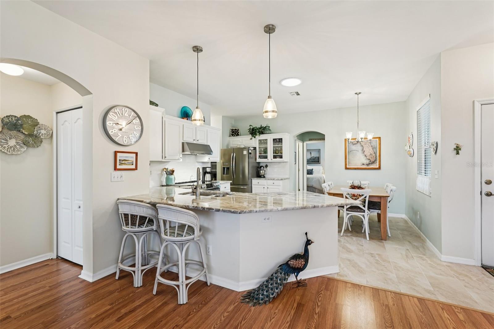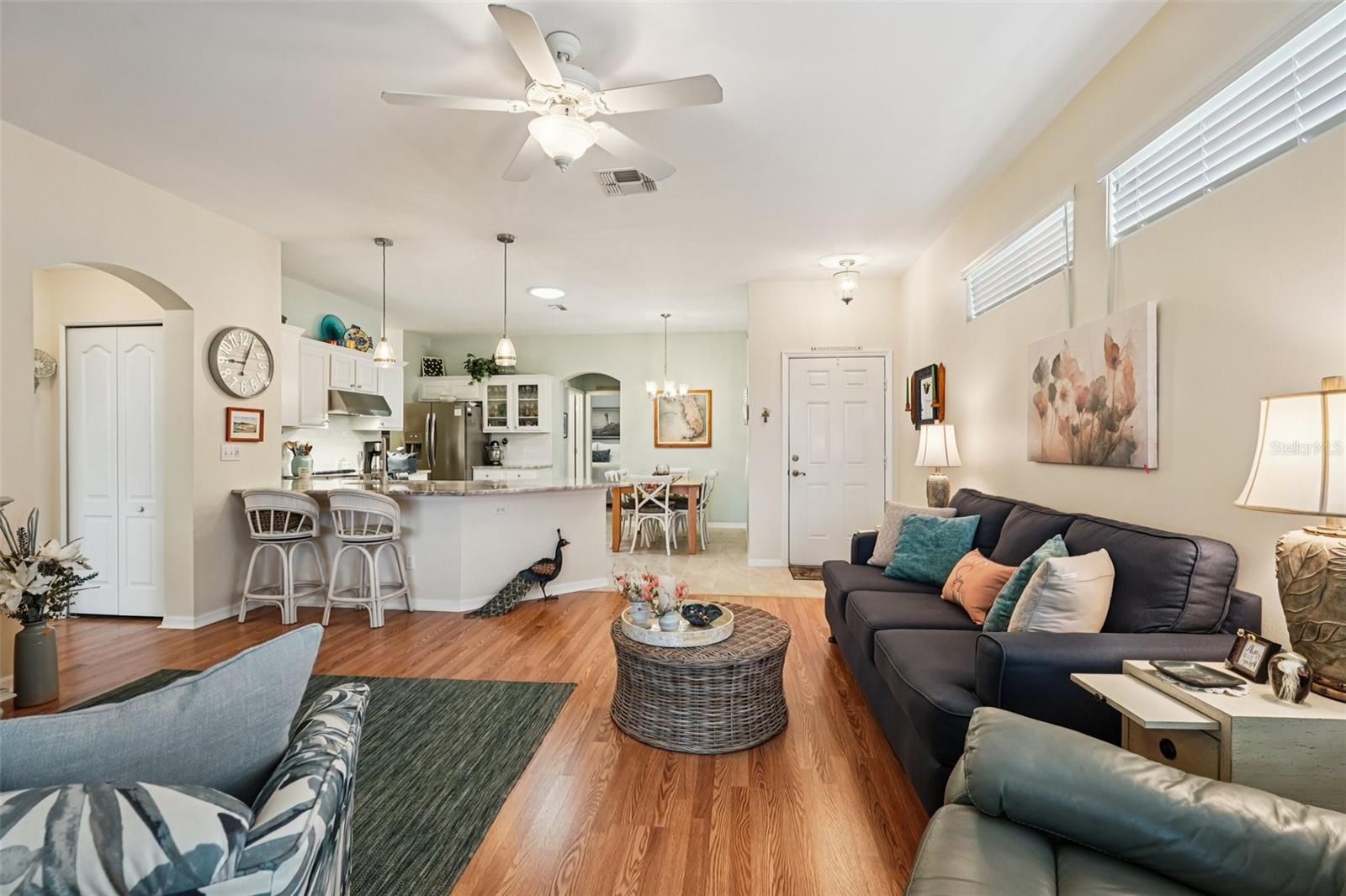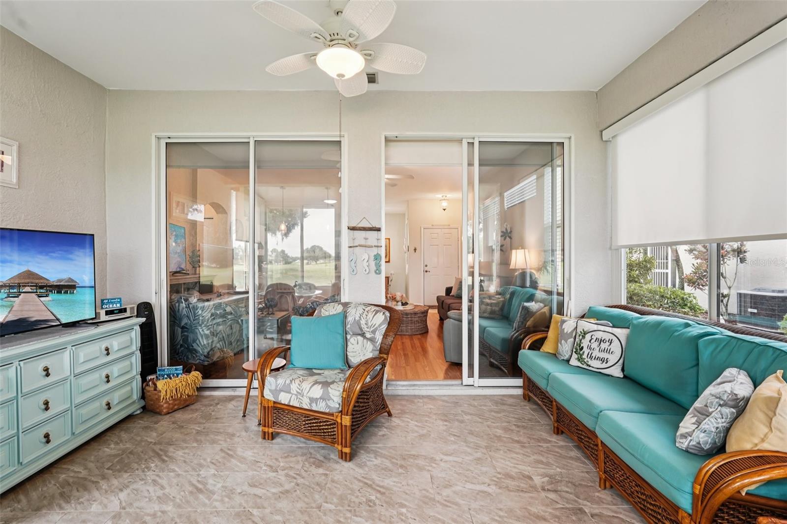 Step into style and comfort in this fully furnished 3-bedroom, 2-bath condo with a 2-car garage, located in the desirable Kings Point community! This spacious home features a side screened-in entrance for added convenience and outdoor enjoyment, along with stunning panoramic views of the golf course, visible through expansive sliding glass doors that open to a bright and airy Florida room. The open-concept kitchen, living, and dining areas flow seamlessly, creating the perfect space for entertaining or relaxing in style. The kitchen boasts stainless steel appliances, a breakfast bar, and ample cabinet space—ideal for both casual dining and hosting guests. Enjoy rich dark laminate flooring, soaring ceilings, and an abundance of natural light throughout. The spacious primary suite offers a private retreat with a beautifully updated ensuite bathroom, featuring a walk-in closet and a large walk-in shower. Both bathrooms are tastefully renovated with modern finishes. The third bedroom offers flexible use as a guest room, office, or den. Additional conveniences include a full laundry room/mudroom area with direct garage access and new windows less than 2 years old. You’ll love the gated community of Kings Point, which has amazing facilities, pools, clubs and events just waiting for you to enjoy. Located between Sarasota and Tampa, this home is perfectly positioned for a convenient ride to airports, great shopping, dining, and professional entertainment. With easy access to award-winning, sandy beaches, you’ll experience the best of all worlds—without the stress of big city life. Leave the hustle behind and embrace a new chapter in Sun City Center, Florida, the state's top-ranked and most affordable 55+ retirement community. Move-in ready and fully furnished — just bring your suitcase and start enjoying the Florida lifestyle!
