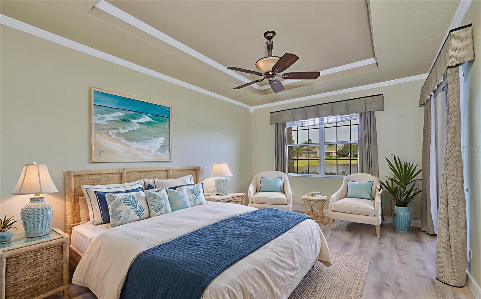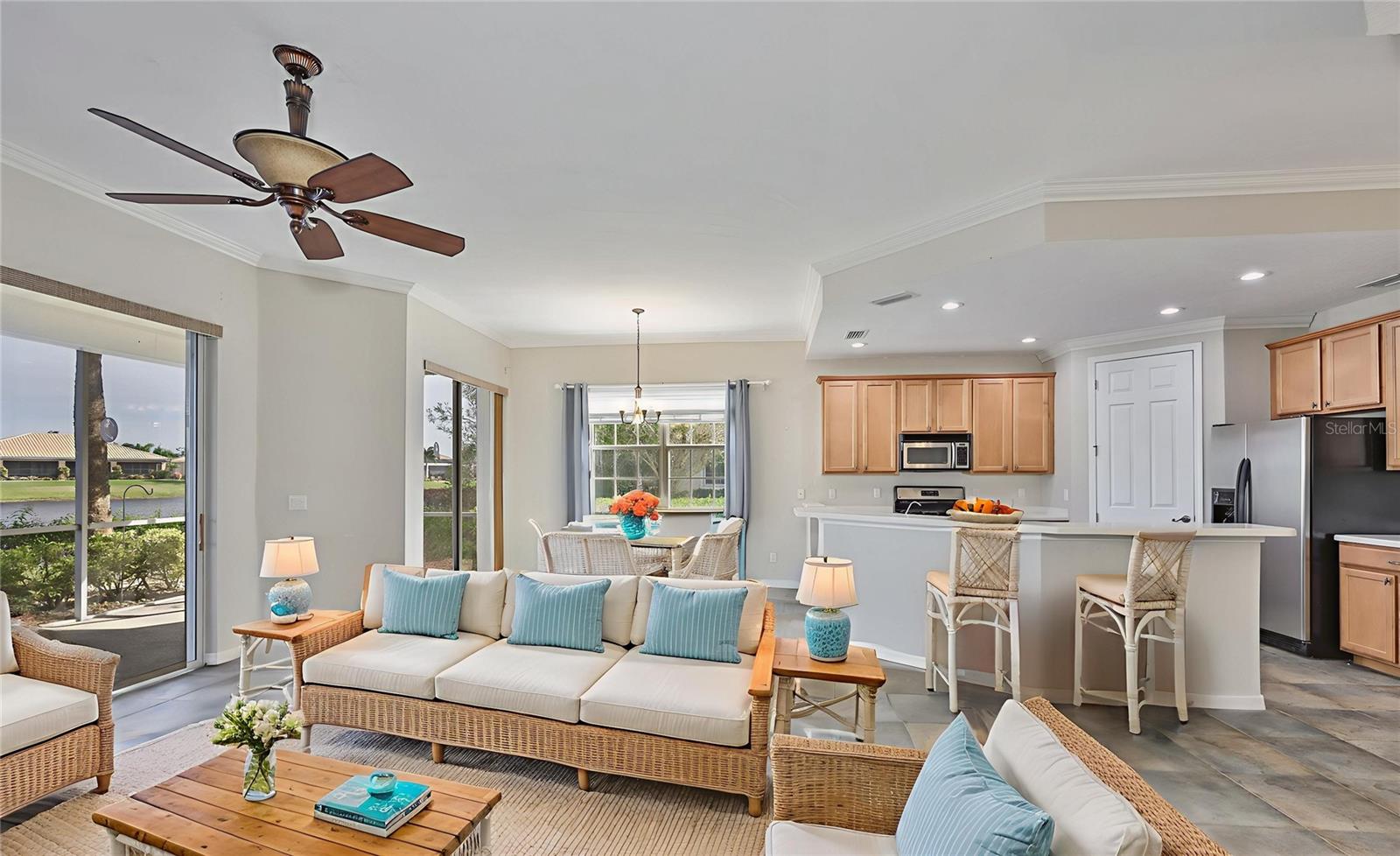 One or more photo(s) has been virtually staged. Spacious Florenzi Floor plan with tile floors and wood laminate throughout, crown molding, new HVAC system and New garage door opener with camera using myQ app with cell phone access. Updated vanity in guest bath, roomy screened lanai facing east for the morning sun overlooking the pond. The Renaissance Club is just steps away from the front door where you can enjoy the pool, hot tub, Amichi's Bar and Grill, fitness center, Sauna, Steam Room and Ladies SPA for pampering your body. The condo has natural gas for cooking, heating and hot water. The monthly maintenance fee covers maintenance on the tile roof, building exterior, landscaping, watering the lawn and shrubs and insurance on the building. Plus, the Sun City Center Community Association offers an active lifestyle with indoor and outdoor pools and hot tubs, world-class fitness center, lawn bowling, pickle ball, baseball, tennis, horseshoes, sawdust engineers, arts and crafts, a pottery studio, all types of clubs for playing cards, computers...and the list goes on. Golf Cart is available with a separate purchase agreement, welcome to your new home.