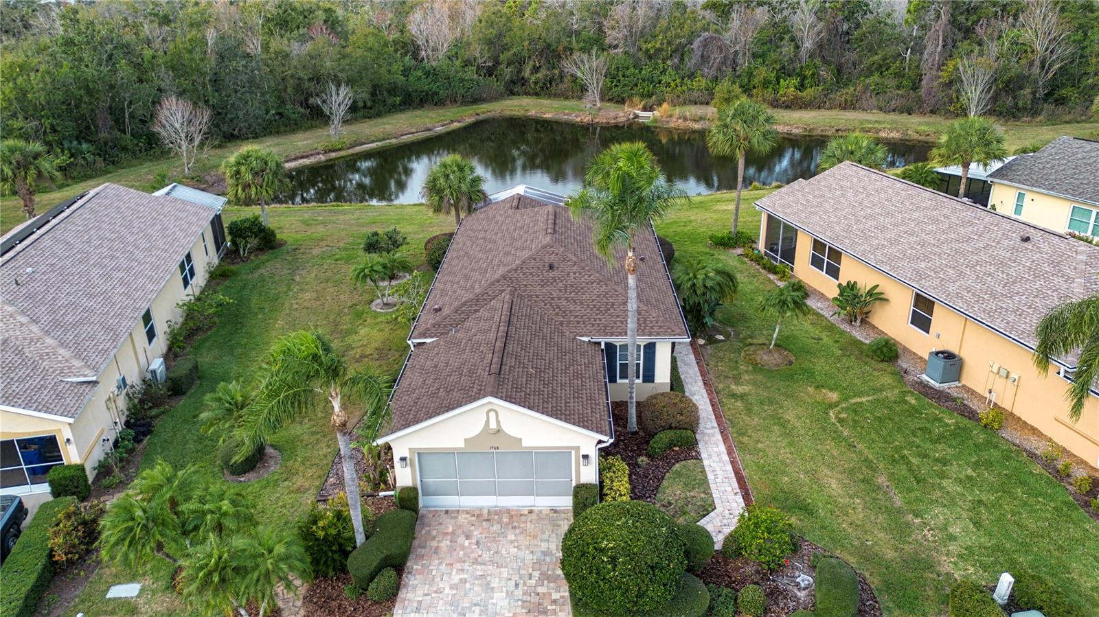 Waterfront POND lot with stunning water views! This 2-bedroom, 2-bath, 2-car garage, 1,503 sqft single-family home is tucked away on a quiet cul-de-sac street in the sought-after 55+ community of Azalea Trace. Enjoy the peace and quiet of no rear neighbors with uninterrupted pond and conservation views from the newly built 200 sqft screened-in lanai. Upon arrival, you are greeted by a perfectly manicured lawn with updated landscape and a newer pavered driveway and walkway to the front screened-in entryway. The home is full of upgrades throughout including a NEW ROOF (2023), new A/C unit (2023), new gutters and downspouts (2023), an enclosed air-conditioned Florida Room (2023), ceiling fans (2020) and SO MUCH MORE! The enclosed Florida room was extended by 4 ft, adding 231 sqft of indoor living space. It is a perfect extension of the living room and an extra space for overnight guests to utilize as a private room when the glass sliders and blinds are closed. This room is complete with hurricane shutters for each of the windows if needed. The open concept boasts a desirable layout between the kitchen, attached breakfast nook, living room, Florida room, and lanai. The kitchen features plenty of cabinet space, pantry closet, and large breakfast bar that overlooks the living room. Just off of the living room is the primary bedroom which has 2 closets and an ensuite bathroom with separate vanities and a large walk-in glass shower in between. The split bedroom floorplan offers added privacy between the primary suite and secondary bedroom, located towards the front of the home with a nearby full bath. The spacious garage is the perfect place to utilize as a workshop as it is complete with storage shelving and a screened door for year-round use. Bring your golf cart to immerse yourself in the Sun City Center lifestyle with easy access to shopping, restaurants, and grocery stores. Community amenities include a clubhouse, indoor/outdoor pools and spas, a fitness center, pickle ball, tennis courts, baseball field, dog park, golf course, clubs, and activities such as arts and crafts. The community is centrally located to major highways making the nearby Tampa Bay cities of Bradenton, Sarasota, St. Petersburg, Clearwater, and Tampa very accessible.