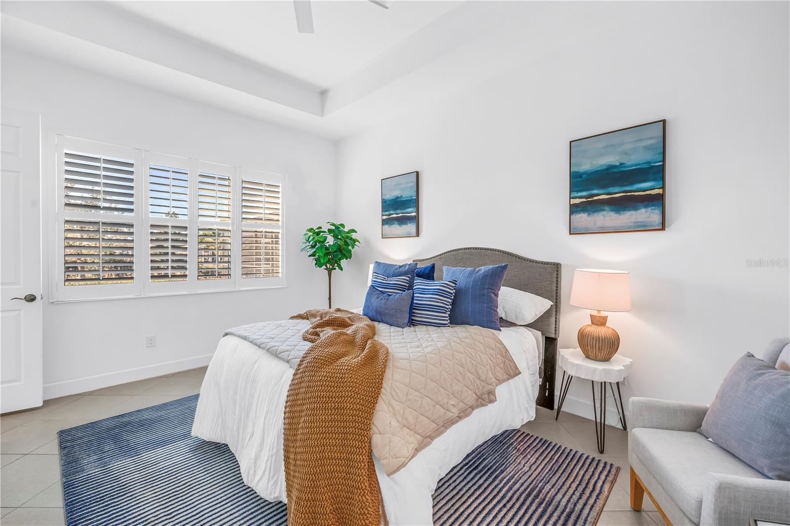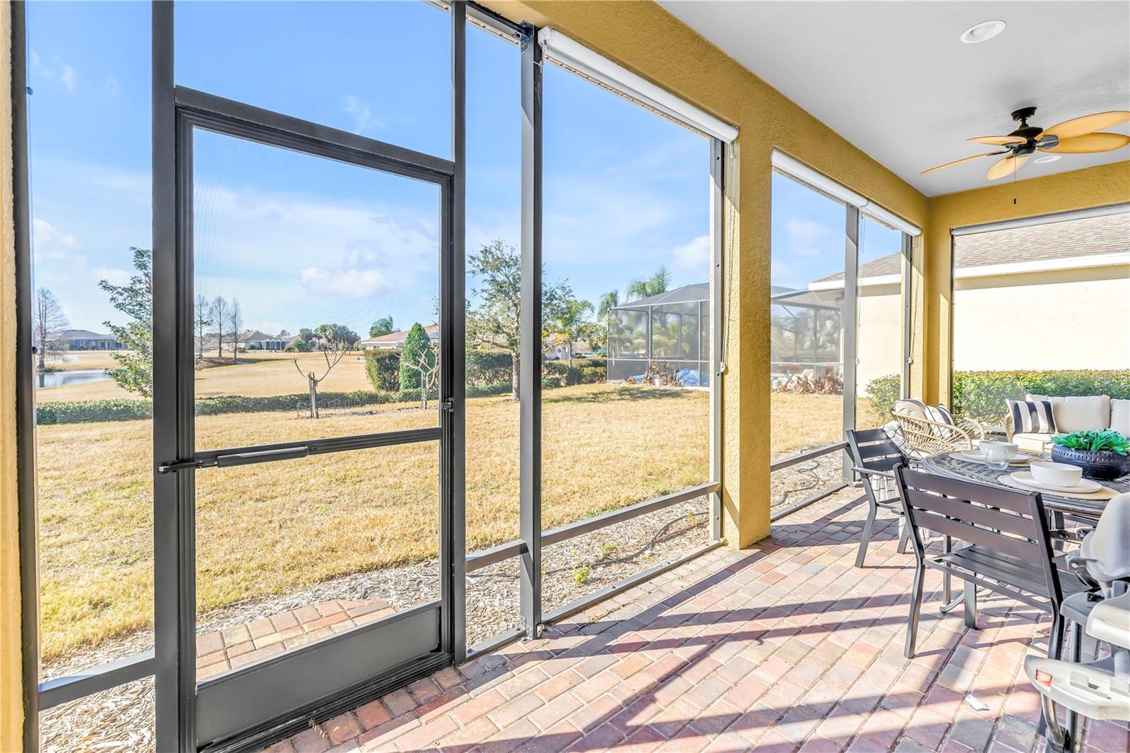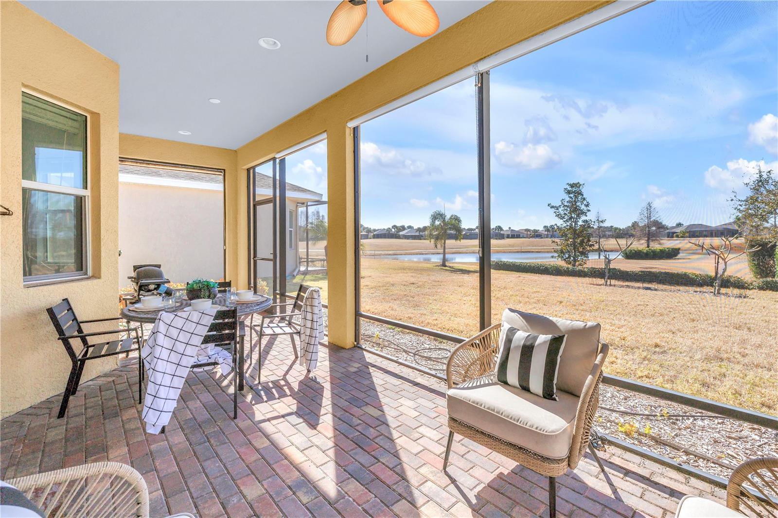 From the moment you step through the door, this MINTO Capistrano home welcomes you with a sense of ease, light, and thoughtful design. Soaring 14-foot ceilings in the foyer set the tone, opening into a beautifully coordinated interior where soft, neutral tile flows seamlessly through every room and continues into both bathrooms, creating a calm and cohesive backdrop for everyday living. Designed to live comfortably and beautifully, this detached single-family residence with a NEW ROOF in 2024 offers two bedrooms plus a versatile den, perfect for a home office, hobby space, or easily a third bedroom for visiting guests. The heart of the home is the open kitchen, where warm wood cabinetry, granite countertops, and a central island with breakfast bar invite everything from quiet mornings to lively gatherings. It connects effortlessly to the dining area and great room, accented by elegant tray ceilings that add volume and architectural interest. The primary suite is a true retreat, featuring its own tray ceiling, an oversized walk-in closet, and a spacious walk-in shower designed for comfort and relaxation. Throughout the home, plantation shutters frame every impact-rated window and door, filling each space with filtered natural light. Slide open the glass doors and step onto the pavered lanai, where tranquil mornings and sunset evenings await. Here, your view stretches across a peaceful pond and manicured golf course — a serene backdrop that feels like a private escape. Located within the gated enclave of Verona, residents enjoy their own exclusive community pool, along with full access to the resort-style amenities of Sun City Center and the Renaissance Clubhouses. From pools and fitness centers to clubs, golf, activities, and social events, there is always something to look forward to. Perfectly positioned between Tampa and Sarasota, this home offers easy access to airports, shopping, dining, entertainment, and some of Florida’s most celebrated white-sand beaches. All of this, tucked within one of the state’s most affordable and amenity-rich 55+ communities, where life moves at your pace, and every day feels just a little more like a vacation. Fees are as follows: $2778/Annually -Club Renaissance, $714.54/ Quarter - Verona at Renaissance, $325/Annually - Renaissance Maintenance, $346/Annually - SCC Community Association