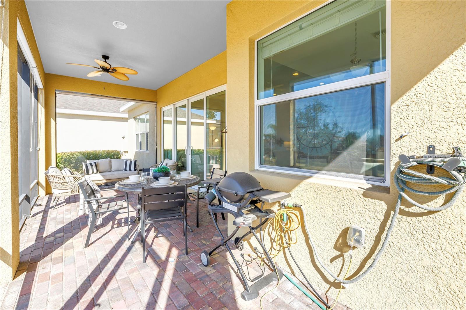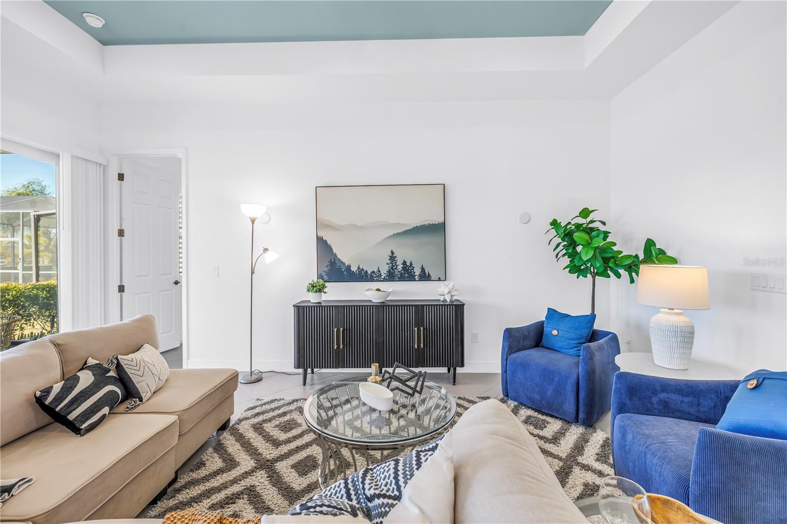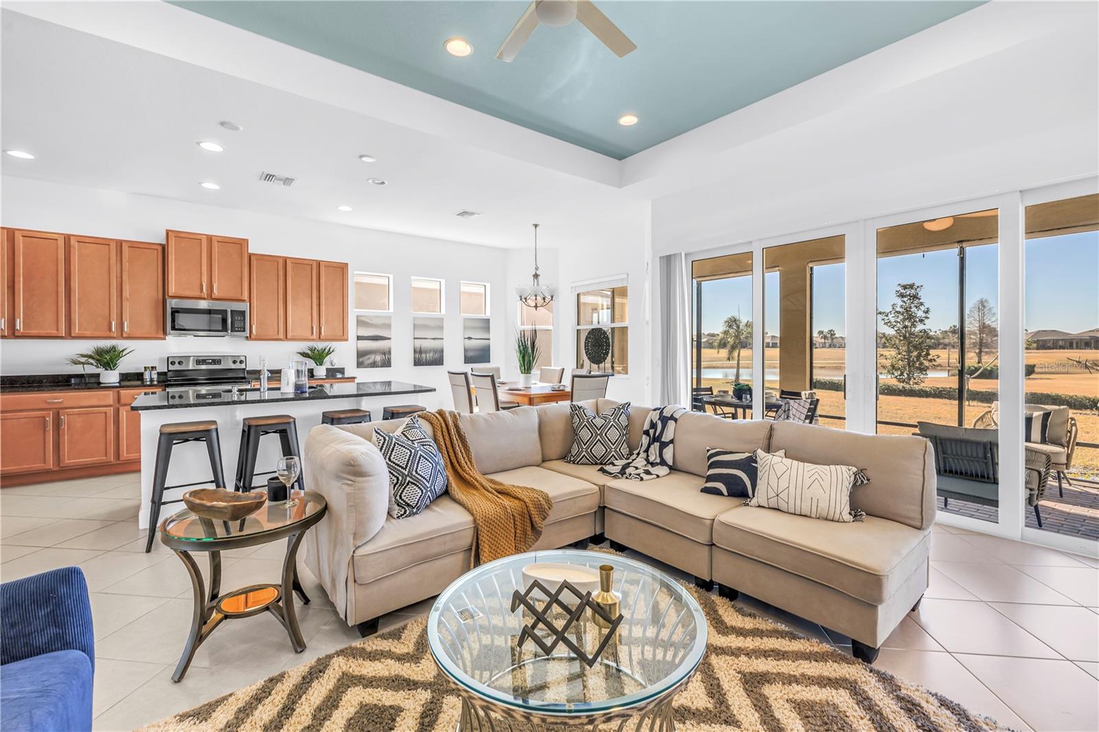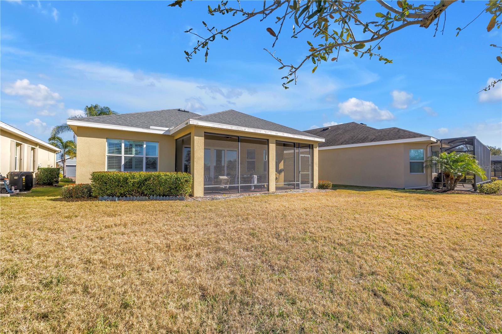 From the moment you step through the door, this MINTO Capistrano home welcomes you with a sense of ease, light, and thoughtful design. Soaring 14-foot ceilings in the foyer set the tone, opening into a beautifully coordinated interior where soft, neutral tile flows seamlessly through every room and continues into both bathrooms, creating a calm and cohesive backdrop for everyday living. Designed to live comfortably and beautifully, this detached single-family residence with a NEW ROOF in 2024 offers two bedrooms plus a versatile den, perfect for a home office, hobby space, or easily a third bedroom for visiting guests. The heart of the home is the open kitchen, where warm wood cabinetry, granite countertops, and a central island with breakfast bar invite everything from quiet mornings to lively gatherings. It connects effortlessly to the dining area and great room, accented by elegant tray ceilings that add volume and architectural interest. The primary suite is a true retreat, featuring its own tray ceiling, an oversized walk-in closet, and a spacious walk-in shower designed for comfort and relaxation. Throughout the home, plantation shutters frame every impact-rated window and door, filling each space with filtered natural light. Slide open the glass doors and step onto the pavered lanai, where tranquil mornings and sunset evenings await. Here, your view stretches across a peaceful pond and manicured golf course — a serene backdrop that feels like a private escape. Located within the gated enclave of Verona, residents enjoy their own exclusive community pool, along with full access to the resort-style amenities of Sun City Center and the Renaissance Clubhouses. From pools and fitness centers to clubs, golf, activities, and social events, there is always something to look forward to. Perfectly positioned between Tampa and Sarasota, this home offers easy access to airports, shopping, dining, entertainment, and some of Florida’s most celebrated white-sand beaches. All of this, tucked within one of the state’s most affordable and amenity-rich 55+ communities, where life moves at your pace, and every day feels just a little more like a vacation. Fees are as follows: $2778/Annually -Club Renaissance, $714.54/ Quarter - Verona at Renaissance, $325/Annually - Renaissance Maintenance, $346/Annually - SCC Community Association