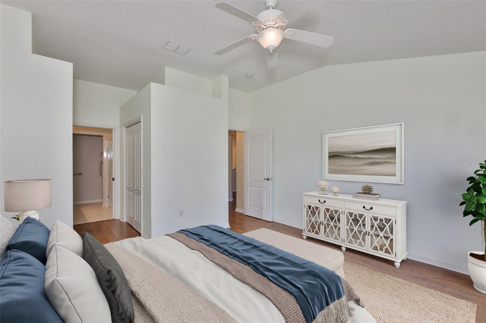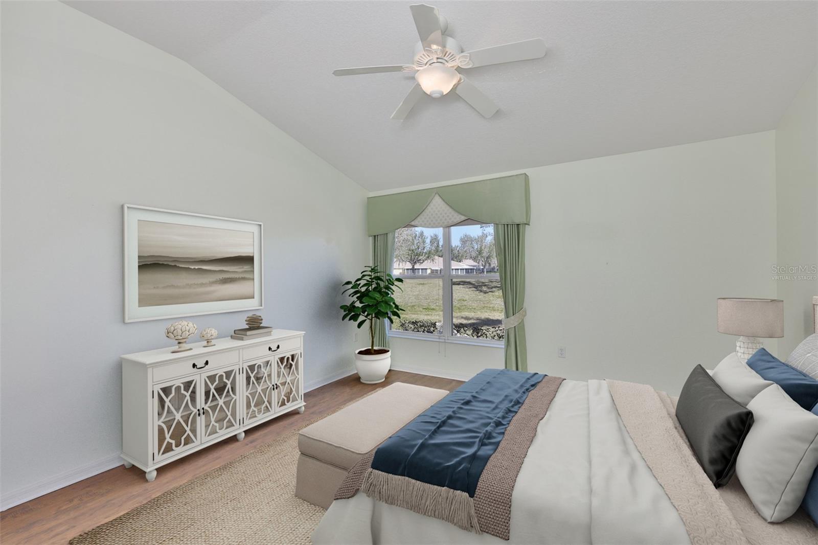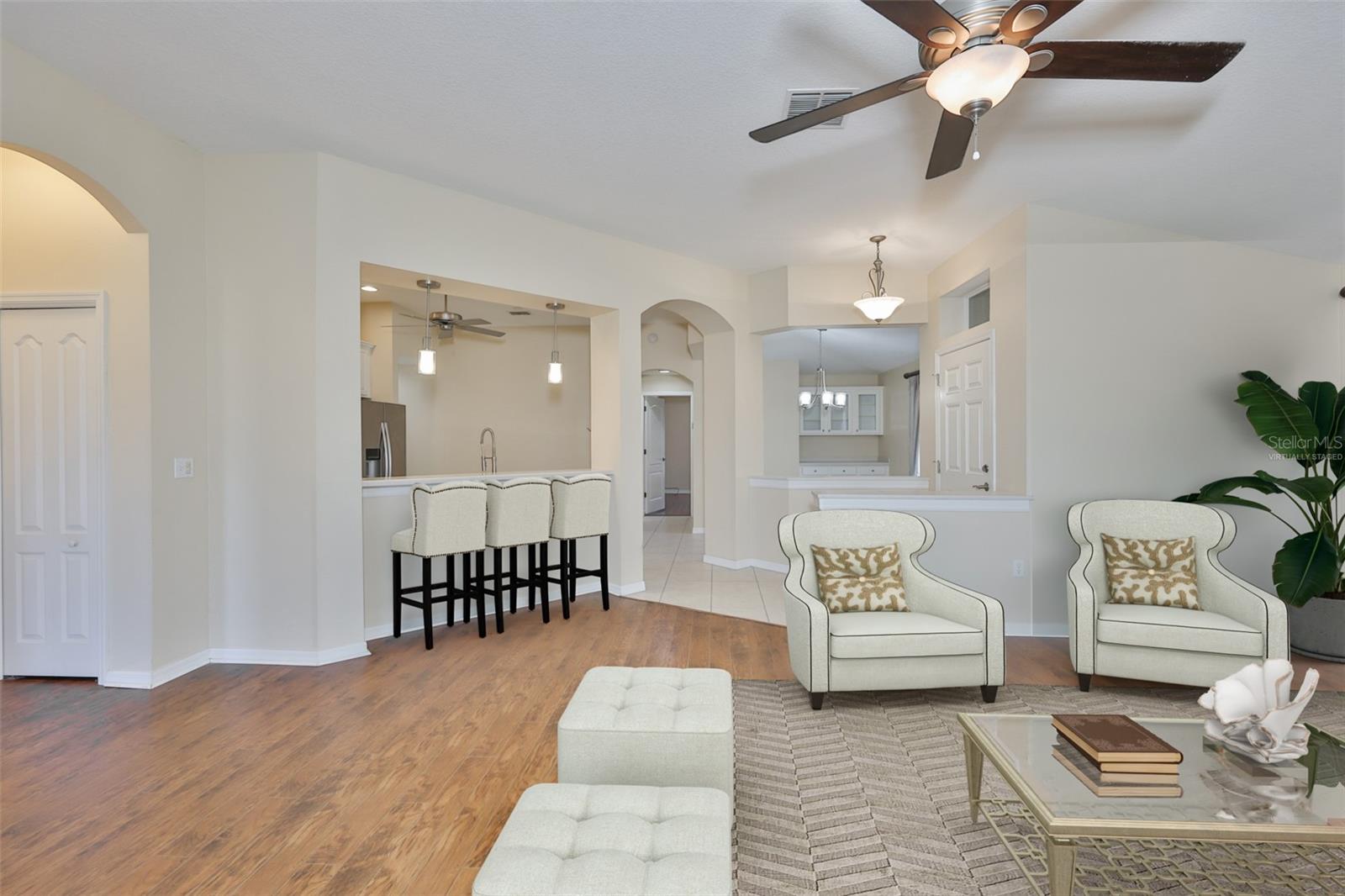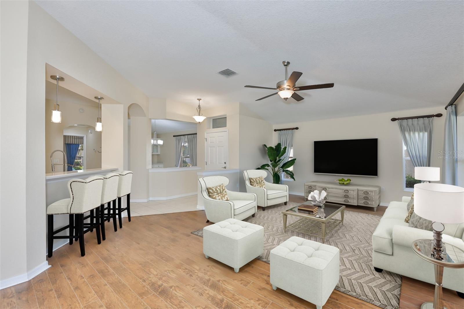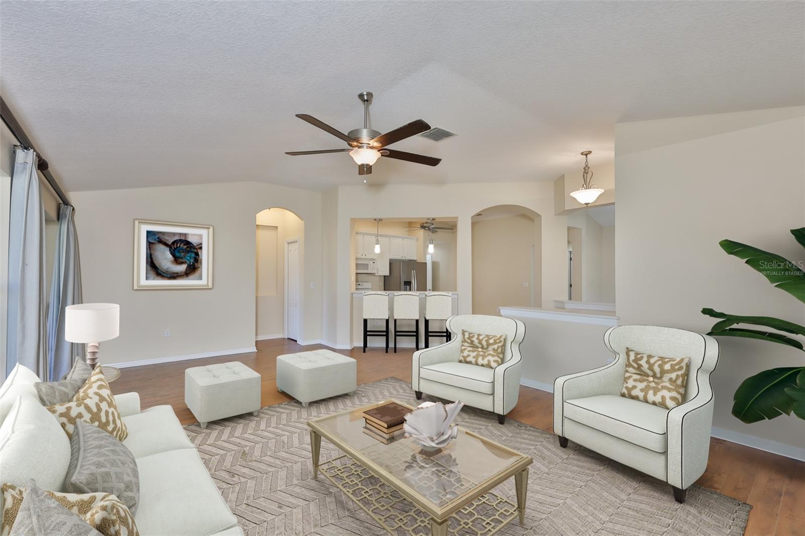 One or more photo(s) has been virtually staged. Welcome to your Florida dream lifestyle at 2119 Grantham Greens Dr, where maintenance-free villa living meets resort-style amenities in the heart of Sun City Center's premier Kings Point community. This immaculate 2-bedroom, 2-bathroom home offers 1,450 square feet of thoughtfully designed single-story living with stunning golf course views from your private screened lanai. WORRY-FREE OWNERSHIP This home has been meticulously maintained with major systems recently updated: 2024 roof replacement, 2025 water heater, 2021 HVAC, and fresh exterior paint completed by the association in January 2026. Added conveniences include 2025 gutters and energy-efficient natural gas service. Simply move in and start enjoying the Florida lifestyle you've been dreaming about. ELEGANT INTERIOR Step inside to discover vaulted ceilings that create an impressive sense of space and light throughout the open floor plan. The kitchen features a convenient pantry with pull-out shelving, pristine white cabinetry, and all appliances convey including the washer and dryer. Wood-look laminate flooring flows seamlessly through the main living areas, while ceiling fans in every room ensure year-round comfort. The spacious primary suite boasts a beautifully updated en-suite bathroom and walk-in closet with custom built-in organizational systems. The second bedroom offers flexibility as a guest room, office, or hobby space. INDOOR-OUTDOOR LIVING Your approximately 20'x8' screened lanai provides the perfect vantage point to watch golfers navigate the course while you sip your morning coffee or enjoy spectacular Florida sunsets. This is outdoor living at its finest. PRACTICAL CONVENIENCES The oversized 2-car garage includes a utility sink for projects and hobbies. Every detail has been considered for comfortable, convenient living. KINGS POINT LIFESTYLE Your $754 monthly HOA fee is one of the best values in Sun City Center, covering an impressive array of services and amenities including Spectrum cable and internet, lawn maintenance and landscaping, exterior pest control, community pool and spa, state-of-the-art fitness center, tennis and pickleball courts, clubhouse with planned social activities, golf course access with membership options available, 24-hour manned security gate, woodworking and craft studios, billiards and card rooms, and catering kitchen for events. You'll literally only pay your electric bill - everything else is covered! PET-FRIENDLY This section of Kings Point welcomes up to two pets, so bring your furry companions along to enjoy the Florida sunshine. LOCATION, LOCATION Sun City Center offers the perfect combination of peaceful retirement living with easy access to Tampa Bay beaches, shopping, dining, world-class healthcare, and Tampa International Airport. This turnkey villa represents exceptional value in one of Florida's most desirable 55+ communities. Don't miss this opportunity to own a meticulously maintained home where every day feels like vacation.