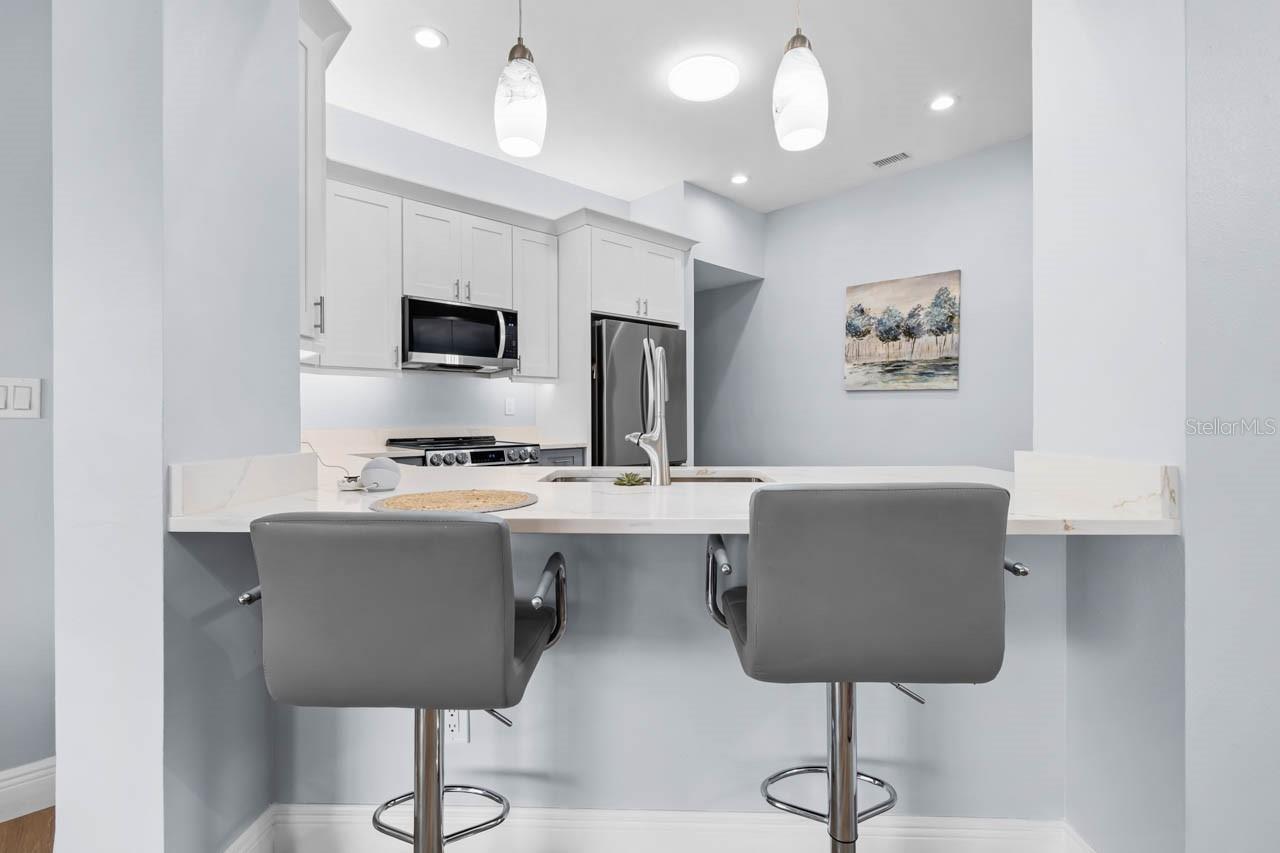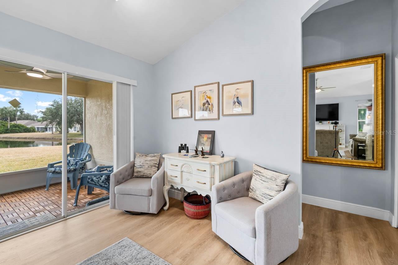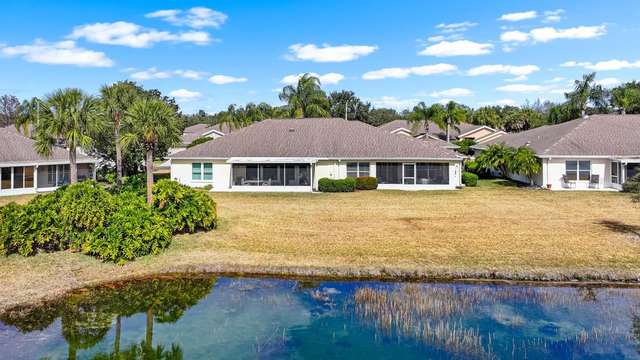 Owner Motivated! Gorgeous, meticulously renovated 2-bed, 2-bath, 2-car POND VIEW home now for sale in the amenity-rich 55+ community of Kings Point! Almost every square inch of this property was updated between 2024-2025, with such upgrades as waterproof LUXURY VINYL PLANK FLOORING (lifetime warranty) - NO CARPET, extended height baseboards, updated electrical fixtures & outlets, RECESSED LIGHTING, dimmable accent lighting, SOFT-CLOSE cabinets & drawers, pocket doors, chair rail, wainscotting, and more. Removing an interior wall transformed the Great Room into a truly OPEN CONCEPT layout and further highlights the high ceilings. The renovated kitchen is a dream come true with NEW 46-inch SOLID WOOD cabinetry, dimmable overmount & undermount lighting, premium stone countertops, a BREAKFAST BAR with pendant lights, and all newer STAINLESS STEEL APPLIANCES! The dining room makes smart use of space with the closet "office." Embrace tranquility in the primary suite with DUAL CLOSETS and EN-SUITE BATHROOM complete with an extended single-sink vanity and spacious shower. The secondary bathroom is also fully modernized with a high-end vanity featuring soft-close cabinetry, new sink faucet, and hardware. Beyond the aesthetic updates, the home's other highlights include a newer heat pump HVAC system with an oversized high-efficiency filter, a WHOLE-HOUSE WATER SOFTENER, a NEWER WATER HEATER (2024), added insulation, and a WHOLE-HOUSE SURGE PROTECTOR. Of course, one of the most remarkable features of this home is its location and peaceful water view. The property overlooks one of the best-maintained ponds in Kings Point, providing stunning views of local wildlife from the kitchen, living room, and primary bedroom. There is also a newly screened lanai for enjoying the outdoors in comfort, and it even has waterproof wooden flooring - design and function perfectly paired. The garage has been FRESHLY PAINTED and is equipped with GOLF CART CHARGING, a garage door SCREEN system, a deep sink, and ATTIC STORAGE with electricity and floor! Kings Point is a bustling gated and golf cart friendly community known for a myriad of recreation facilities, indoor/outdoor heated pools, a state-of-the art fitness center, arts, crafts, tennis, pickle-ball, lawn bowling, auditorium with 800+ seating and over 200 clubs & activities. Don't miss this great opportunity; schedule your showing today!
