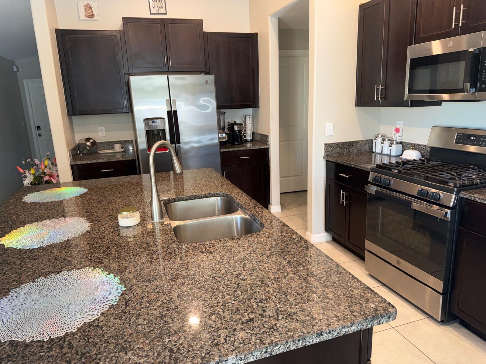 This meticulously designed, 3-bedroom, 2-bathroom home in the desirable Belmont West community boasts an excellent location and 1,451 square feet of living space. Its smart and versatile layout caters to diverse needs, whether you're looking for room to grow, space to entertain, or a home office. The open floor plan invites you into a spacious living area that flows seamlessly into the dining room and a gourmet kitchen, complete with granite countertops, stainless steel appliances, a central island, and a large pantry. Dark wood cabinetry and ceramic tile flooring throughout the main living areas and bedrooms add durability and style. The private master suite is located at the rear of the home and includes a large bathroom with beautiful crown molding and a walk-in closet. Two additional bedrooms are located at the front of the house, offering flexible space for guests or a home office. The backyard features a large, 25x16-foot polished concrete patio. Ideal for relaxing evenings or weekend gatherings, this tranquil outdoor retreat is just steps from your door. As an added bonus, the home comes with a stylish and modern TV unit for enjoying time with family and guests. Located in a vibrant neighborhood with a variety of amenities, Belmont West offers two resort-style pools, a dog park, basketball and tennis courts, scenic walking trails, and a community center. You'll also appreciate the convenience of being just minutes from I-75, with grocery stores only 5 minutes away, top-rated schools, restaurants on Big Ben, and other essential items nearby. This home truly offers the best of both worlds: don't miss the opportunity to make it yours!