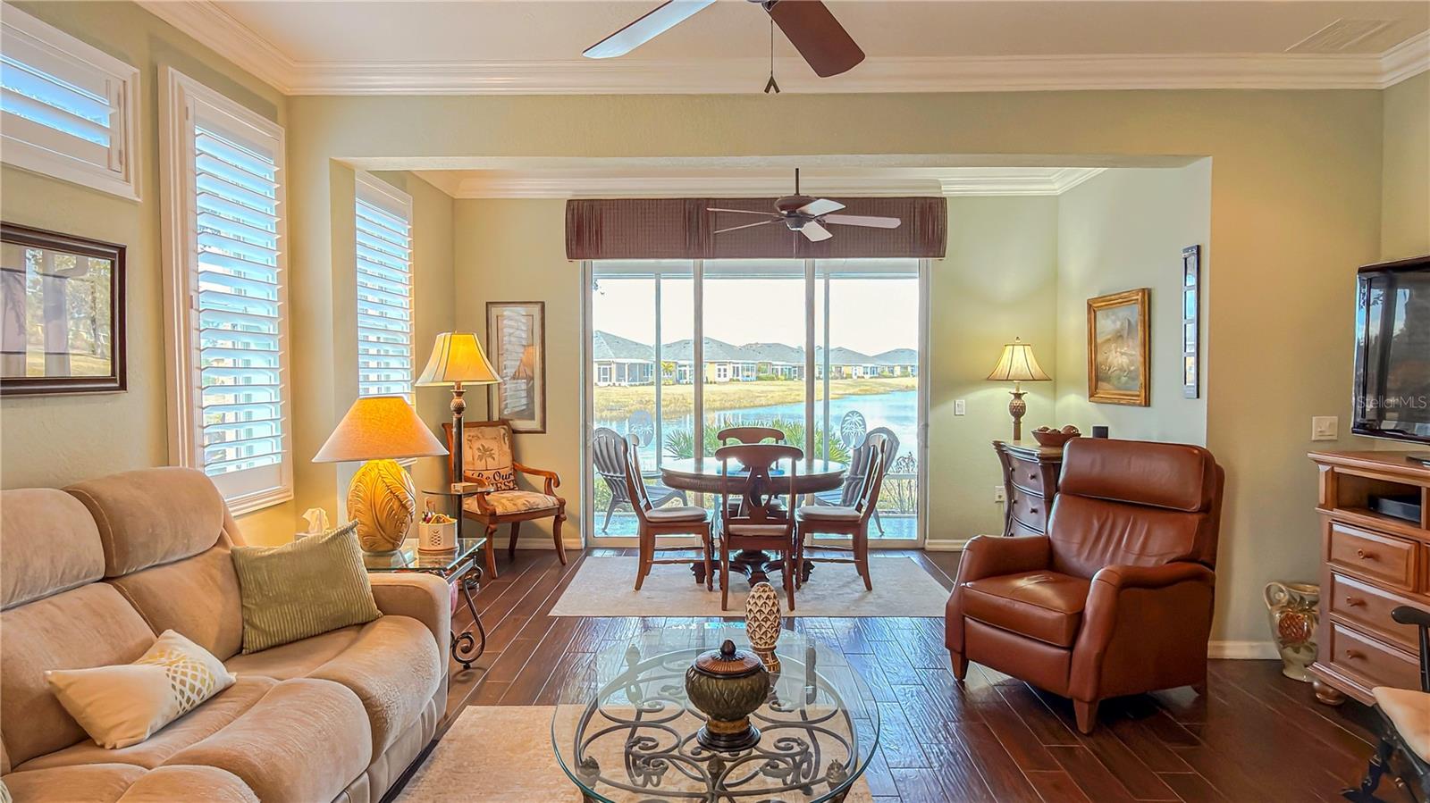 WOW! Prepare to be impressed. This beautifully appointed 2-bedroom, 2-bath plus den condo offers the perfect blend of comfort, elegance, and Florida lifestyle living. A stunning leaded glass front door welcomes you inside, where you’ll immediately notice the impeccable condition and tasteful décor throughout. The spacious living room provides a front-row seat to tranquil water views and the delightful wildlife that frequents the backyard and pond, creating a peaceful and picturesque backdrop. The entire interior has been beautifully painted and meticulously maintained—you won’t find a cleaner, more move-in-ready home. Upgrades abound, including 42-inch wood cabinetry, elegant ceiling fans, crown molding throughout, and plantation shutters that add timeless style and privacy. The kitchen features gorgeous quartz countertops, and both bathrooms offer raised vanities topped with quartz. Beautiful tile flooring flows throughout the entire home, and the primary bath showcases a completely newly redesigned shower for a luxurious retreat. Additional highlights include natural gas service for the dryer, water heater, and furnace, as well as leaf-guard gutter protection for added convenience and peace of mind. No detail has been overlooked—this home truly has it all. Enjoy resort-style living in the gated community of Kings Point in Sun City Center. Residents have access to two magnificent clubhouses featuring heated indoor and outdoor pools, a state-of-the-art fitness center, spa, game rooms, computer lab, and an abundance of clubs and activities—including Pickleball and Cornhole. Ideally located within easy driving distance of Tampa, St. Petersburg, and Sarasota—offering professional sports, arts, museums, and world-class beaches. The magic of Walt Disney World is just 90 minutes away! Come live the dream and experience the best of Florida living.