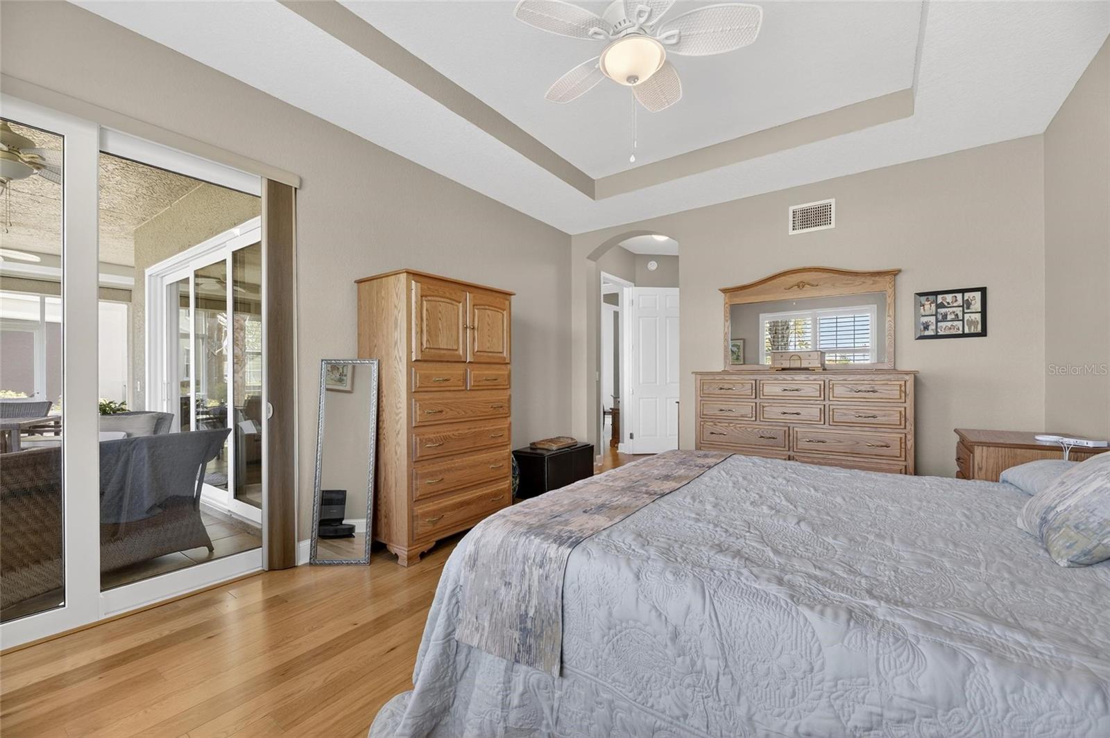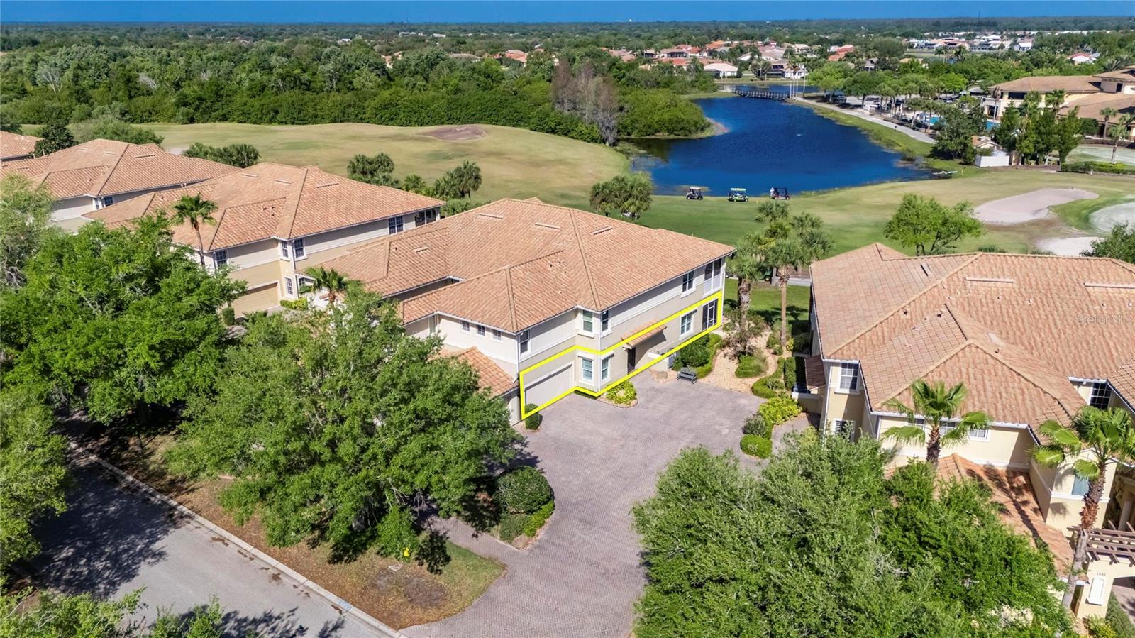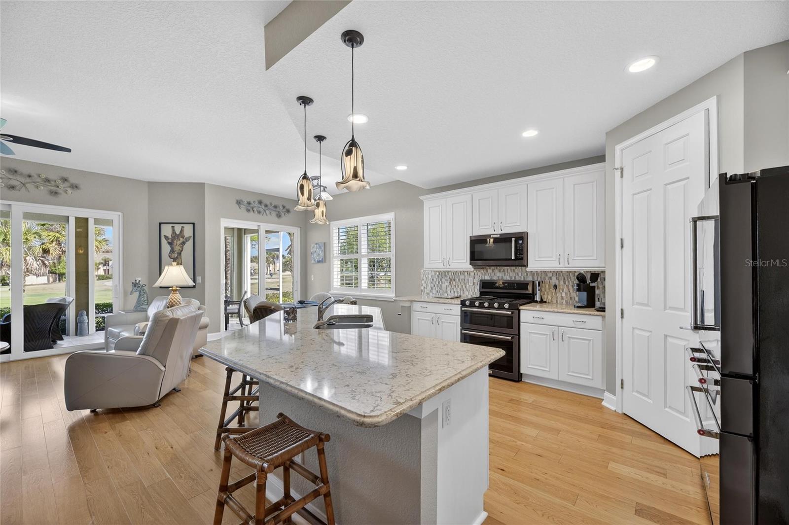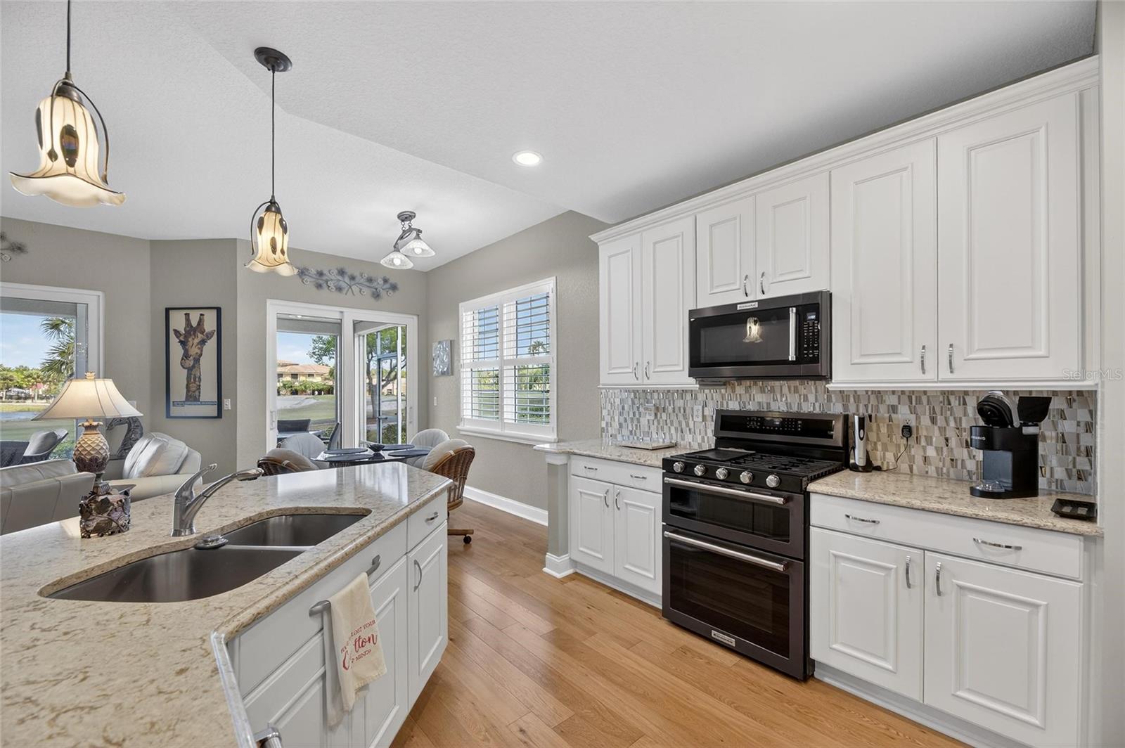 Beautifully Updated Condo with Stunning Water & Golf Course Views! Enjoy peace of mind and modern comfort with major upgrades already in place, including a new HVAC system with a 10-year warranty (2025), gas water heater (2023), double-pane windows with electric hurricane shutters, water softener, and a finished, no-maintenance garage floor—all designed for easy, worry-free living. Welcome to active, carefree retirement in the premier 55+ resort-style community of Renaissance in Sun City Center, where every day feels like a vacation. This luxurious, maintenance-free ground-level 3-bedroom, 2-bath condo offers nearly 1,900 sq ft of beautifully updated living space. Step inside to soaring ceilings, neutral décor, engineered hardwood flooring, custom plantation shutters, and breathtaking water and golf course views across the entire rear of the home. The remodeled chef’s kitchen is a standout, featuring 42-inch white cabinetry with pullouts, a walk-in pantry, matte stainless “smudge-proof” KitchenAid appliances, a natural gas double oven range, quartz countertops, a stylish tile backsplash, and a large counter-height island with seating—perfect for entertaining. The open-concept layout flows effortlessly into the spacious living and dining areas, creating a welcoming environment for gatherings. The private owner’s suite offers lanai access, a large walk-in closet with built-ins, and a beautifully remodeled ensuite bath with a double vanity and walk-in tiled shower with privacy glass. Two additional bedrooms and a fully remodeled guest bath are located on the opposite side of the home for added privacy. The third bedroom can also serve as a den or office. Relax and unwind on the 24x10 covered lanai, recently reframed and rescreened with tile flooring—an ideal spot to enjoy serene water and golf course views all day long. Conveniently located just steps from Club Renaissance, you’ll have access to dining, social activities, a resort-style pool, fitness classes, spa services, and more. Come experience the lifestyle and see why this exceptional home is the perfect place to call your own!