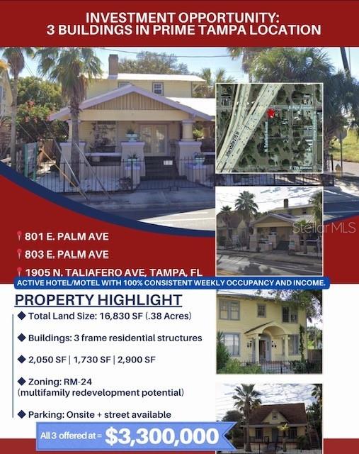 (NEW THE SELLER WILL NOW DO OWNER FINANCING!) This is one of three buildings that make up "PALM VILLA HOSTEL'S" this one located on 803 E Palm Ave Tampa, FL * LODGING & HOSPITALITY AVIALABLE FOR INVESTMENT* Property goes with *801 E Palm Ave & 1905 Taliafero Ave (together asking is $3,300,000.00) as a group TURN KEY TURN KEY property already bringing in money daily as it OPERATES as a Full Occupancy Hotel-Motel Excellent for Bed and Breakfast opportunity for increased revenue(SEE APPOX MONTHLY FINCIALS in Listing) This is a Rare Investment Opportunity in the Tampa Heights Area of East Tampa. This Asset consists of 3 Historic Buildings offering 13 units that are leased individually with Daily and Weekly Rates...This property is ONLY minutes from Downtown Tampa, Channelside and Ybor City