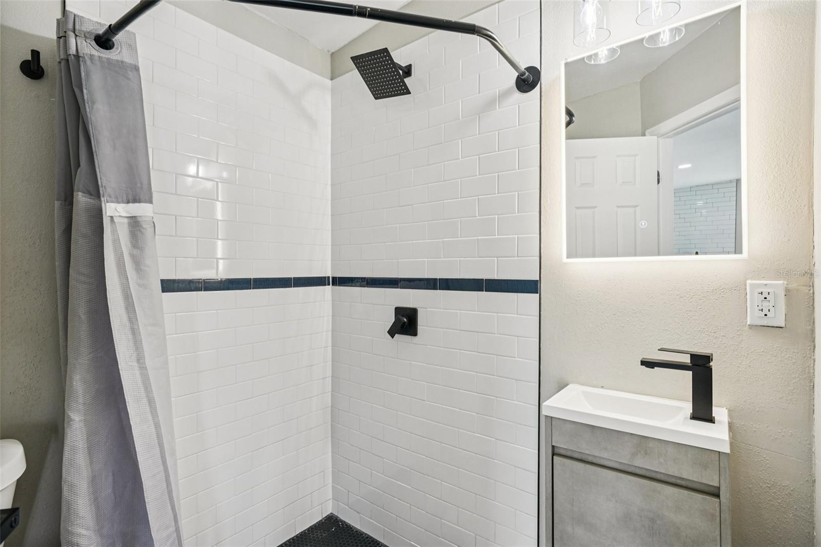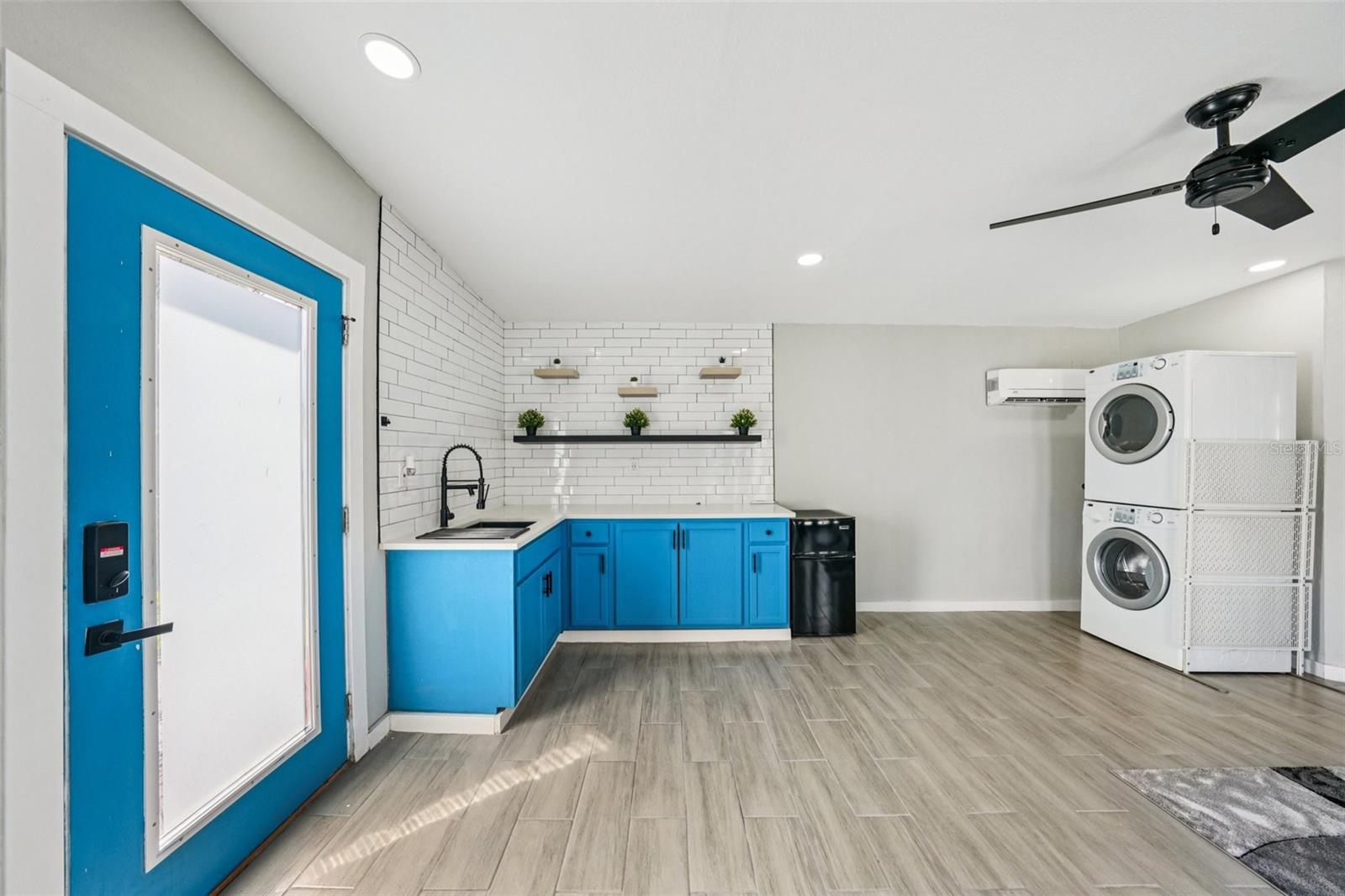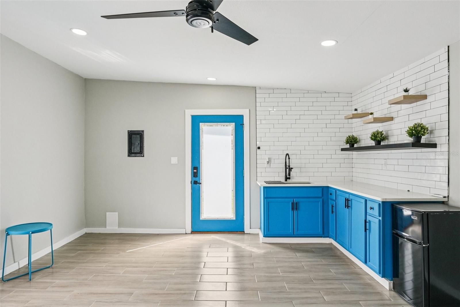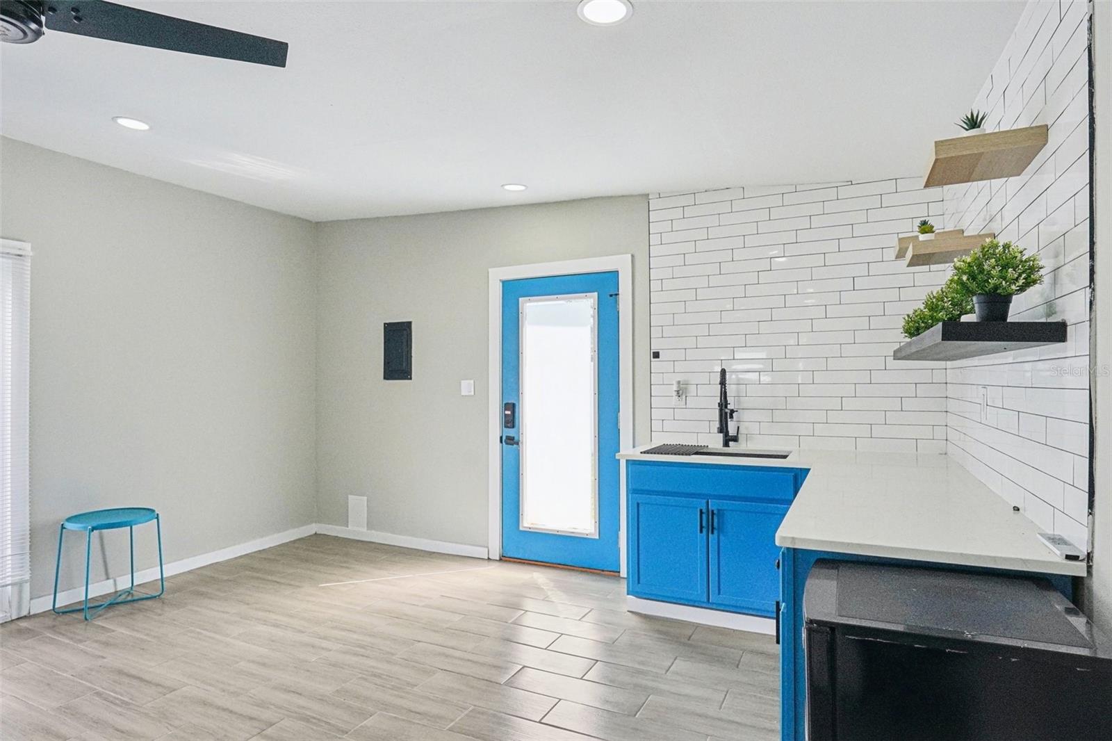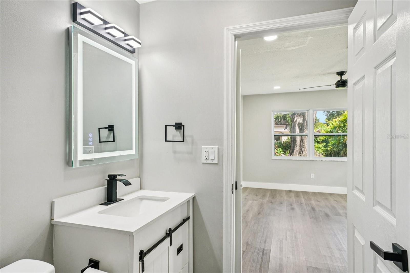 Welcome to this beautifully updated 3-bedroom, 2-bathroom home with a detached mother-in-law studio that blends timeless mid-century architecture with modern touches. The inviting covered front porch, angled rooflines, and decorative board-and-batten shutter accents on the crisp white brick exterior create eye-catching curb appeal and set the tone for the stylish interiors. Step through the door into an open-concept layout designed for comfort and everyday living. Elevated ceilings, recessed lighting, neutral finishes, and beautiful luxury vinyl plank flooring carry throughout, creating a warm yet modern atmosphere that flows easily from room to room. The updated kitchen is light and bright, outfitted with timeless shaker-style cabinets, stainless steel appliances, a large sink, and a pull-down spray faucet. A clean subway tile backsplash pairs with the quartz countertops, while the central island with pull-up breakfast bar overlooking the dining room invites casual meals and conversations with the cook. The split-bedroom plan offers flexibility for a variety of needs. The primary bedroom offers generous space, recessed lighting, a walk-in closet, and an ensuite bathroom. Both bathrooms feature modern finishes, including a sleek vanity with an LED mirror, and a gleaming tiled shower with contemporary accents. The second bedroom is conveniently located near this guest bath and kitchen, while the spacious third bedroom, just off the living room, is ideal for guests, a home office, or playroom. The detached guest house/mother-in-law studio expands the possibilities. With its own A/C unit, open living area, kitchenette, laundry, and full bath, it’s ideal for extended family, visitors, or rental income. Its finishes echo the main home, so it feels like part of the same story—stylish, functional, and inviting. Out back, a covered deck extends the living space of the main house, ideal for outdoor dining, entertaining, or relaxing in the shade. The large backyard offers plenty of room for play, gardening, or future customization, while the connection between the main home and guest house enhances the property’s versatility. Additional features include a new roof (7/24), newer A/C, and a non-flood zone location. With convenient access to major thoroughfares, commuting is a breeze, and you’re just minutes from Tampa International Airport, St. Joseph’s Hospital, Raymond James Stadium, Lowry Park Zoo, Busch Gardens, and an array of shops and restaurants. Don’t miss the chance to make this home your own—schedule your tour
