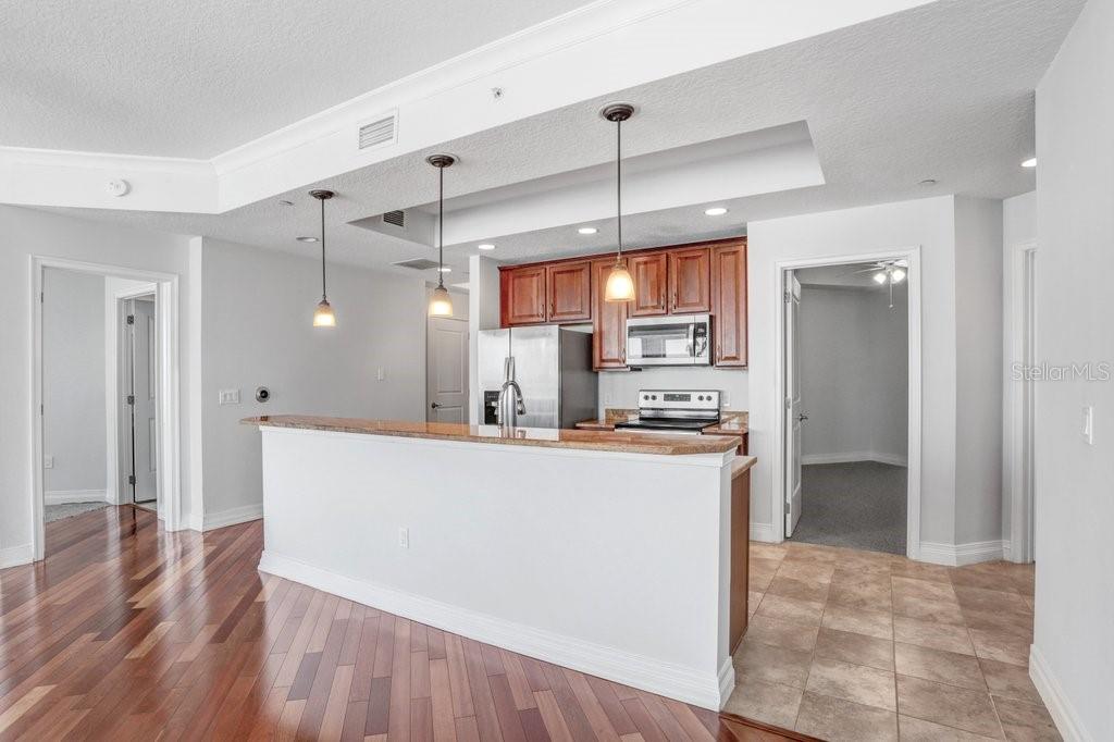 Welcome to luxury living at The Towers of Channelside! This exquisite 1-bedroom, 1.5-bathroom condo with a versatile den/office, which can easily function as a second bedroom, offers both comfort and sophistication in the heart of Tampa. Step inside to discover an open-concept design that seamlessly blends the kitchen, dining, and living areas, perfect for entertaining or relaxing. The gourmet kitchen is a chef's dream, featuring exotic granite countertops, stainless steel appliances, and an oversized island that provides ample prep space and seating. The living and dining rooms are adorned with stunning Brazilian wood floors, adding warmth and elegance to the space. Natural light floods the entire unit through large windows and sliding doors, highlighting the beauty of every detail. Retreat to the master suite, where you'll find a spacious walk-in closet and a luxurious en suite bathroom. The master bath boasts his and her sinks with granite countertops, creating a spa-like atmosphere. The den/office, with its flexibility, can serve as a guest room, home office, or additional bedroom, catering to your specific needs. A large laundry room with plenty of storage adds to the convenience of this well-thought-out home. One of the highlights of this condo is the expansive 325 SqFt balcony, offering breathtaking views of downtown Tampa, the port, and beyond. It's the perfect spot for morning coffee or evening relaxation. Located near Water Street, Amelia Arena, Sparkman Wharf, and Downtown, you'll have easy access to some of the best dining, entertainment, and cultural experiences Tampa has to offer. Don't miss out on this opportunity to live in one of the most sought-after addresses in the city. Schedule your private tour today and experience the luxury and convenience of The Towers of Channelside.