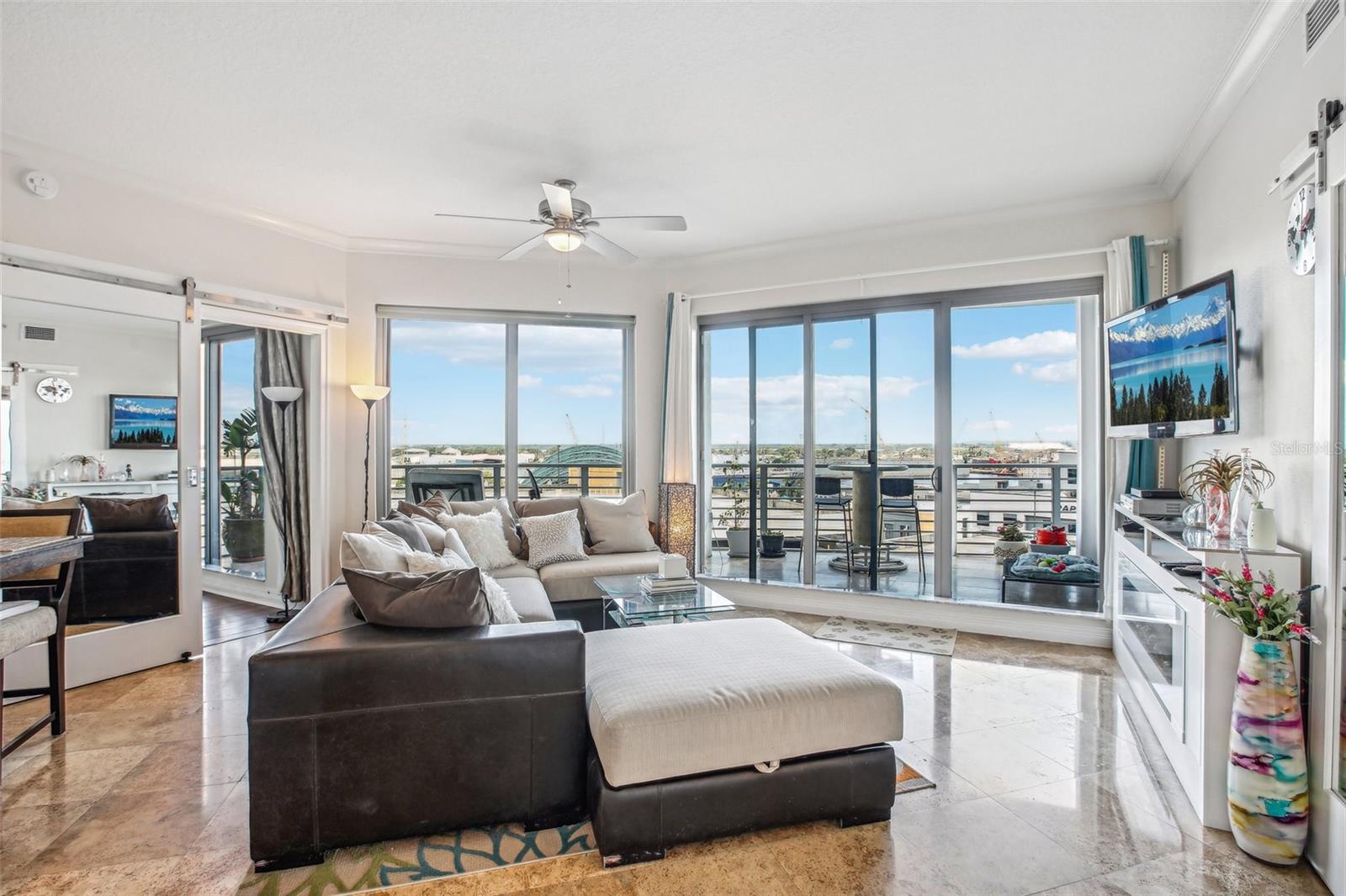 *Price Update* Welcome to a captivating blend of sophistication and comfort in this stunning 2-bedroom, 2.5-bathroom residence at The Towers of Channelside. Nestled in the heart of one of Tampa's premier high-rises, this elegant home offers unparalleled water and cruise ship views, ensuring a front-row seat to breathtaking sunrise views over the channel. Upon entry, you'll be greeted by the timeless beauty of travertine floors and exquisite crown molding that accentuate the spacious open layout. Floor-to-ceiling sliders seamlessly connect indoor and outdoor living, allowing you to fully appreciate the panoramic vistas and vibrant activity of the waterfront from your 36x12 covered wrap-around balcony. The living/dining room combo provides an open space with views from every angle with a tiled backdrop for the ultimate ambiance. Both bedrooms feature luxurious en suite bathrooms, frameless glass shower doors, wood based laminate flooring by aqua guard, and generous walk-in closets, providing a private retreat for ultimate relaxation. Water softener included in the laundry room. The gourmet kitchen is a chef’s dream, boasting stainless steel appliances, sleek quartz countertops, 42-inch cabinets, and a decorative glass backsplash with diamond grout that perfectly complements the glass cabinet knobs and soft-close doors. A convenient bar top seating area invites casual dining and entertaining. Step outside to the oversized wrap-around travertine balcony, where the expansive views of ships and water create an ideal setting for outdoor enjoyment. With two dedicated parking spaces on the 4th floor of the parking garage and a climate-controlled storage unit, convenience is at your fingertips. The Towers of Channelside offer an exceptional array of amenities, including a resort-style pool with spa and waterfall, a well-equipped clubroom, and beautifully designed common areas such as 2 dog parks, grilling stations, and a sun deck. Residents also benefit from 24-hour guard security, concierge service, and on-site management for a truly luxurious lifestyle. Located just minutes from Bayshore Blvd, Sparkman Wharf, Amalie Arena, Water Street, Tampa’s Riverwalk, Tampa's Cruise Terminals, and the Florida Aquarium, you’ll find yourself in the midst of Tampa’s vibrant cultural and entertainment scene. This prime location ensures that every convenience and attraction is within easy reach. Experience the pinnacle of high-rise living—schedule your private tour today and discover your new home at The Towers of Channelside.**No need to worry about assessments as they have been paid in full by the seller. No flood or damage from hurricanes, high and dry!**