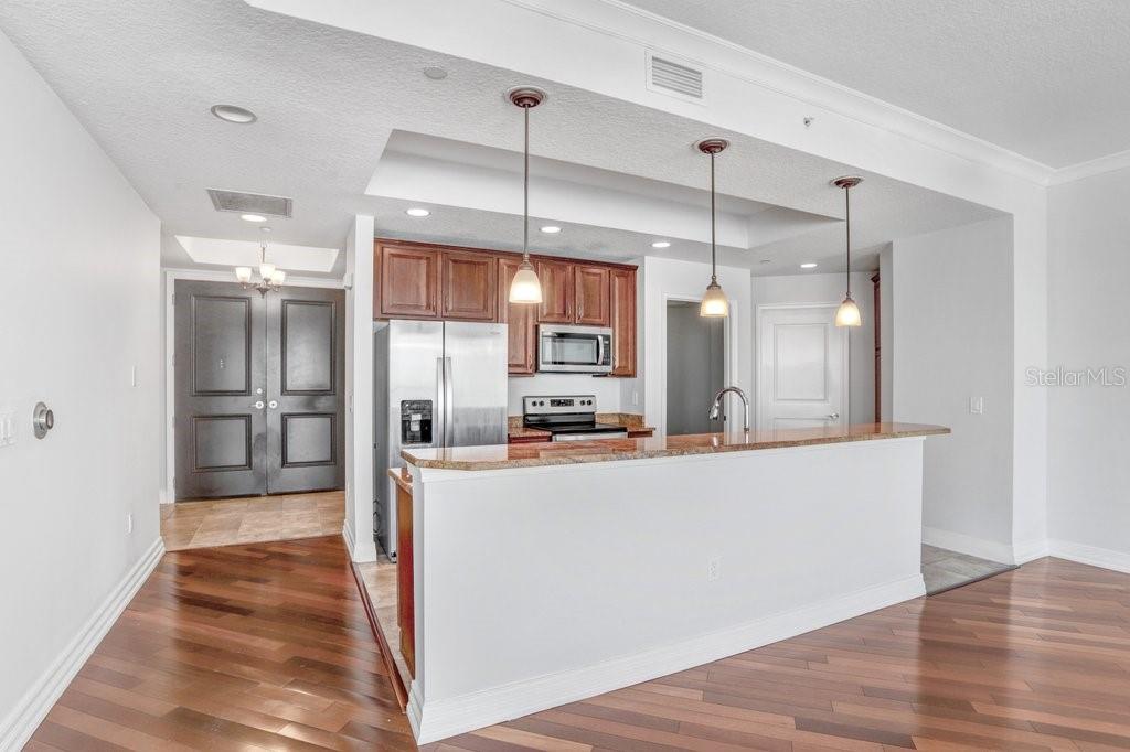 Welcome to luxury living at The Towers of Channelside! This exquisite 1-bedroom, 1.5-bathroom condo with a versatile den/office offers both comfort and sophistication in the heart of Tampa. Step inside to discover an open-concept design that seamlessly blends the kitchen, dining, and living areas, perfect for entertaining. The gourmet kitchen is a chef's dream, featuring exotic granite countertops, stainless steel appliances, and an oversized island that provides ample prep space and seating. The living and dining rooms are adorned with stunning Brazilian wood floors, adding warmth and elegance to the space. Natural light floods the entire unit through large windows and sliding doors, highlighting the beauty of every detail. Retreat to the master suite, where you'll find a spacious walk-in closet and a luxurious en suite bathroom. The master bath boasts his and her sinks with granite countertops, creating a spa-like atmosphere. The den/office, with its flexibility, can serve as a guest room, home office, or media room, catering to your specific needs. A large laundry room with plenty of storage adds to the convenience of this well-thought-out home. One of the highlights of this condo is the expansive 325 SqFt balcony, offering breathtaking views of downtown Tampa, the port, and beyond. It's the perfect spot for morning coffee or evening relaxation. Additionally, this unit comes with a storage unit and two dedicated parking spots, enhancing your living experience with added convenience. Located near Water Street, Amelia Arena, Sparkman Wharf, and Downtown, you'll have easy access to some of the best entertainment and cultural experiences Tampa has to offer. Don't miss out on this opportunity to live in one of the most sought-after addresses in the city. Schedule your private tour today and experience the luxury and convenience of The Towers of Channelside.