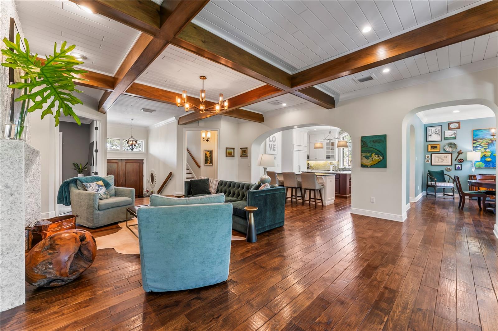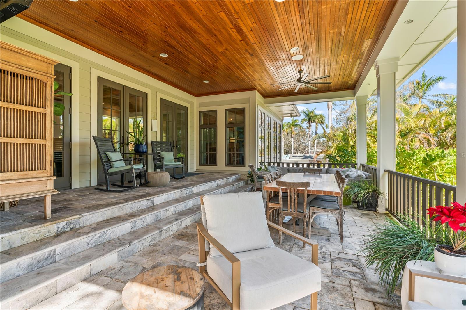 Welcome to this beautiful HIGH AND DRY home in the “Poet Streets” of Sunset Park designed by Architect Jim Ludwig and custom built by Steve Fisher of Classic Builders. The quality and upgrades are evident the moment you walk up the extra wide front steps to the large and inviting front porch with travertine tile pavers and a porch swing making it the perfect spot to enjoy a sunset. Step through the solid wood double door entry to the foyer and then up to the the family room with a wood beamed ceiling and a lovely fireplace with tabby stone that matches the exterior bringing a nice, warm, cohesive style that emanates throughout the entire home. The kitchen overlooks the family room and has a double island, 2 dishwashers, a trash compactor, and a Thermadore double oven and Gas range. Situated off the kitchen and family room is the formal dining room with beautiful views of the backyard which is accessed from the family room through double French Doors leading to the huge back porch with tongue and groove ceiling, travertine paver tiles, and welcoming views of the pool and yard. The backyard is ENORMOUS on this 0.41 acre 220 foot deep lot! The pool area also features a grilling and entertainment cabana perfect for pool parties and a firepit perfect for relaxing with a glass of wine. The main floor features the Primary Bedroom with a walk-in closet plus 2 den/offices of which one could easily be used for additional closet space. Upstairs features 4 more bedrooms and 2 full baths plus a loft area. The ground floor has garage space to easily accommodate 5 cars for the auto enthusiast, tons of storage space, and space for a billiards table and a ping pong table that is easily accessible to the back yard. The features are endless: over 8,000sf under roof, very low maintenance exterior with Tabby and Hardie Board plank walls, +++ . Come and see this lovely home, you won’t be disappointed