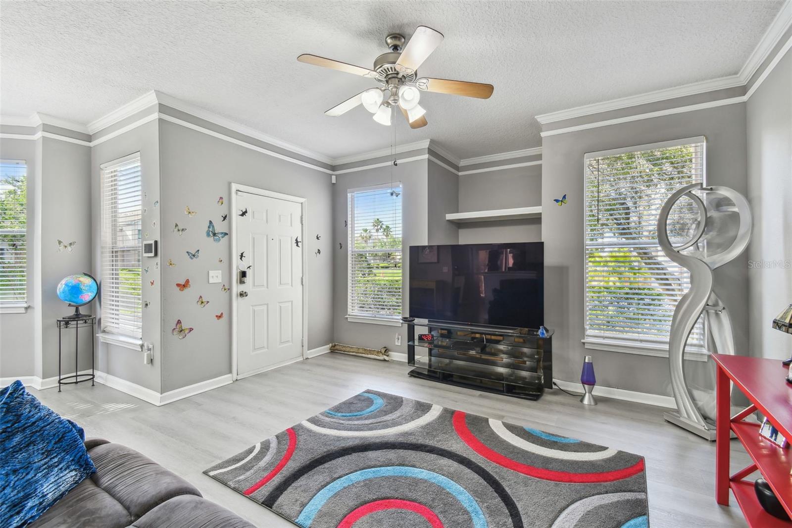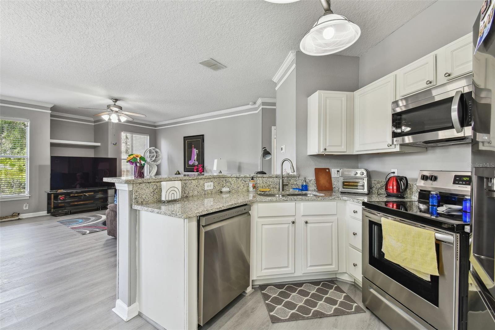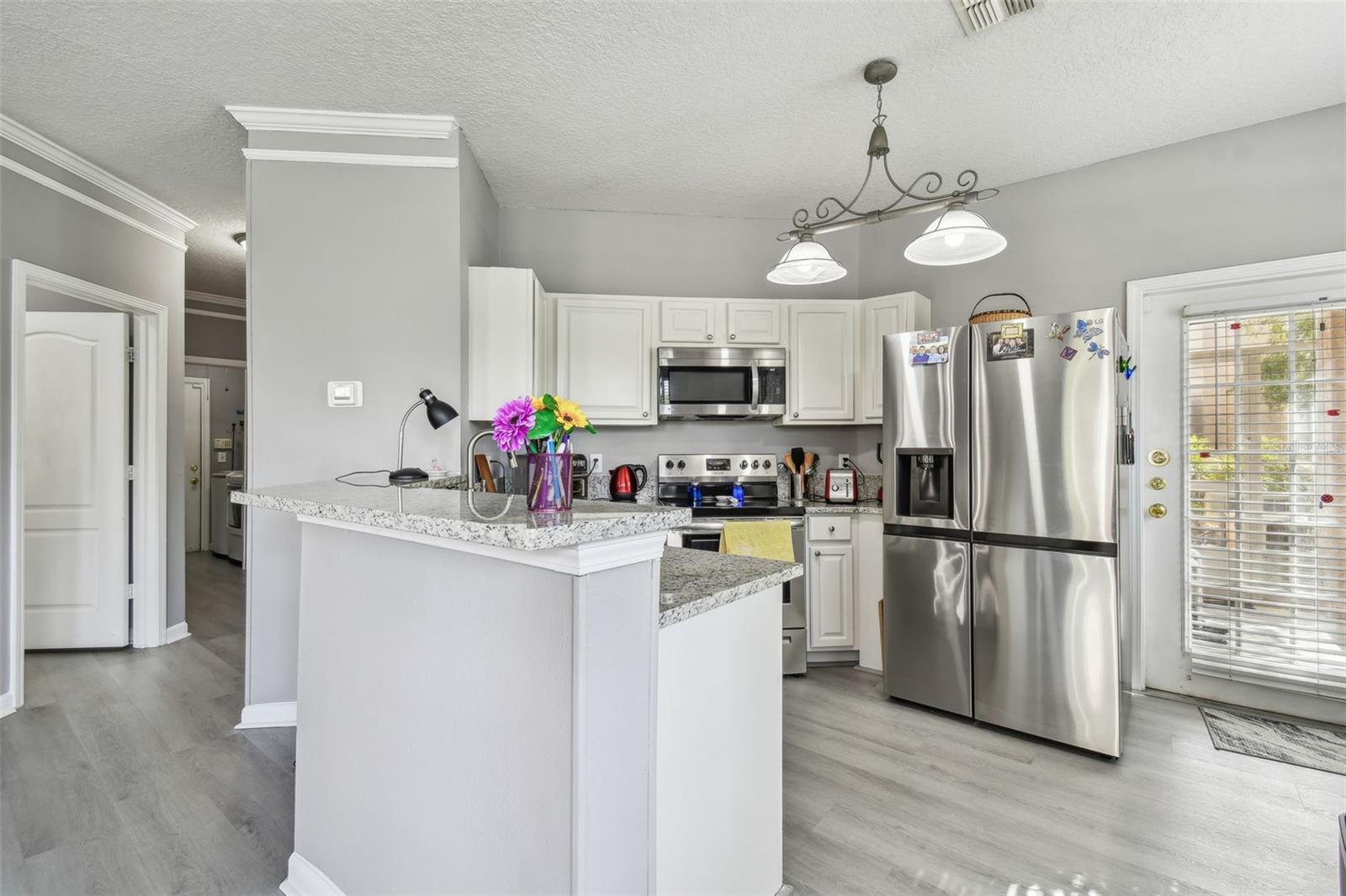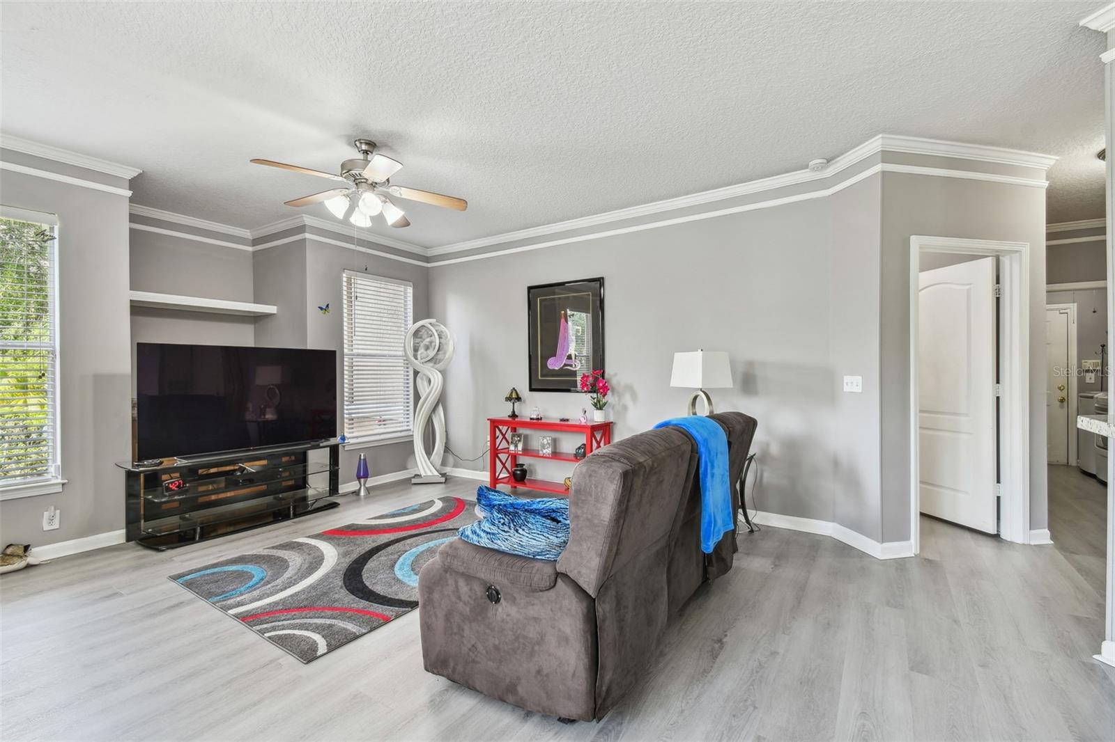Be ready to drive home into your own tandum two car garage and step into style and comfort with this beautifully updated 3 bedroom, 2 bathroom first floor condo located in the highly sought after gated community of The Villas Condo. Featuring new floors, new interior paint with crown molding throughout the open floor plan is perfect for entertaining or relaxing, this home offers modern elegance at every turn. The kitchen is a showstopper with brand new granite countertops, sleek stainless steel appliances, and white cabinets that add a bright, fresh feel. The space is well thoughout with its utilization of a cozy cove transformed into an office space along with the use of the closet for a laundry room. Head outside and sit in your lanai to enjoy the weather plus view of the beautiful pond and fountain. Or walk through the resort style community to enjoy the refreshing pool, club house, renovated fitness room, and playground. This is an excellent location with quick access to I 4 and I -75, nature parks, premium shopping, health and medical facitlties and USF! Don't wait! This unit will not last! Schedule your private showing today and see why The Villas is the place to be!