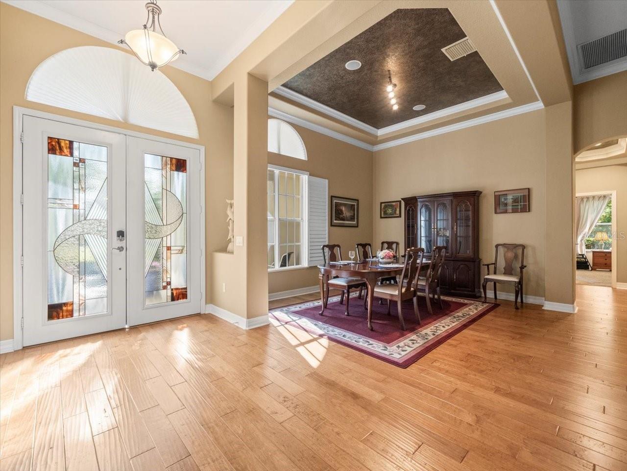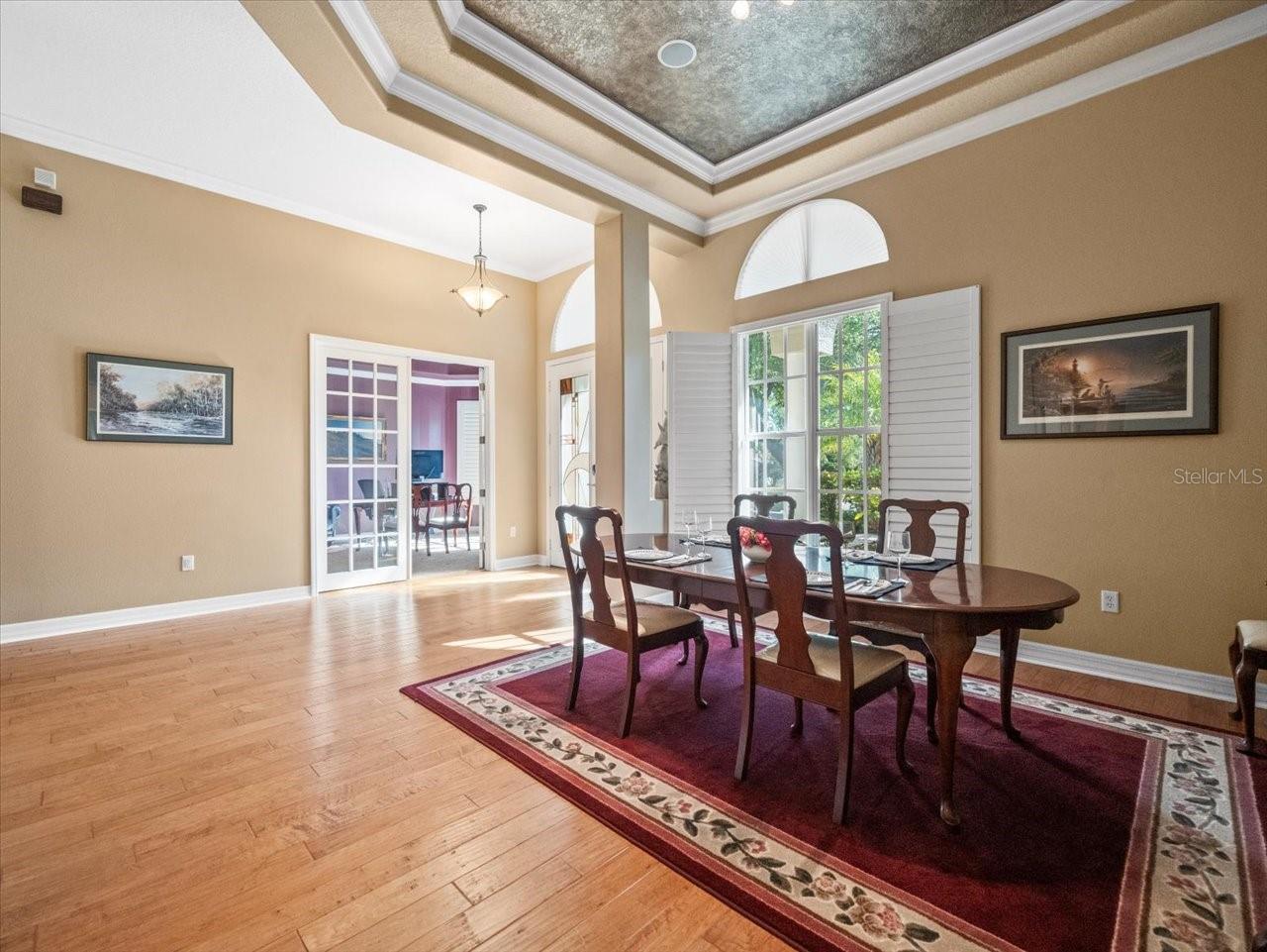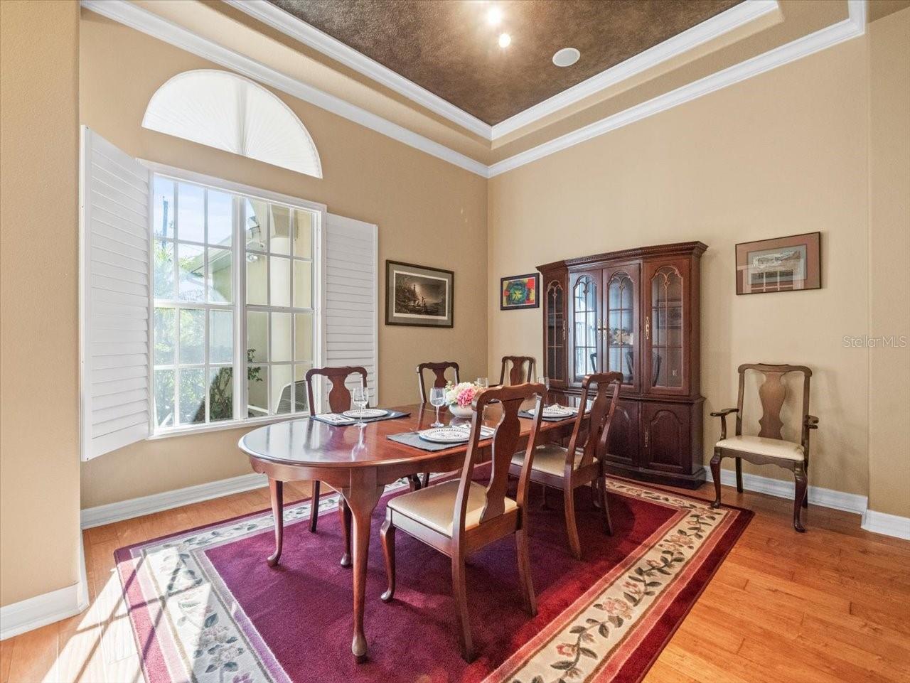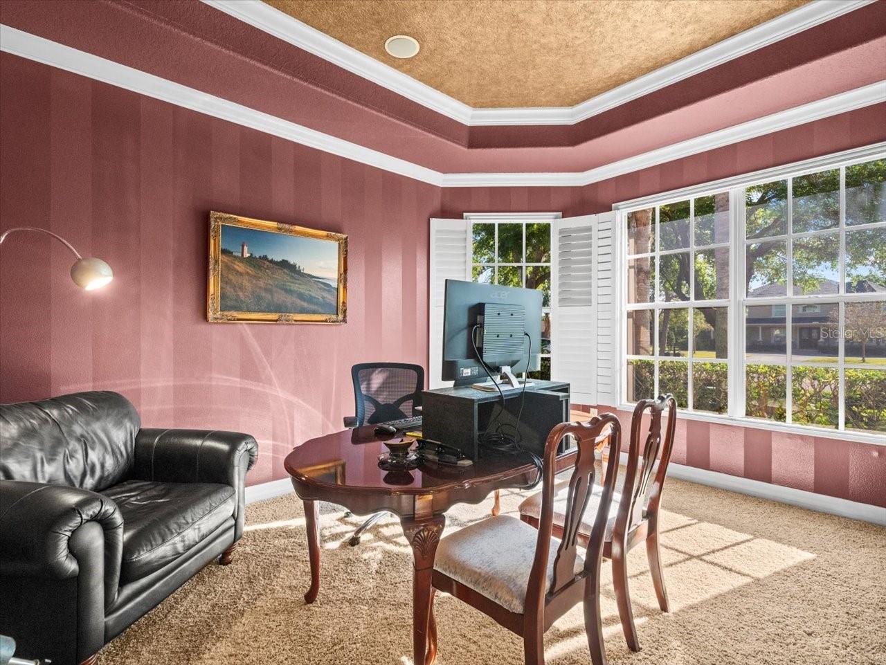 Welcome to your dream home! This exquisite 4-bedroom, 3-bathroom home with an additional office and a spacious 3-car garage is a perfect combination of elegance, functionality, and serene outdoor living. Nestled on a conservation lot, this property offers privacy and breathtaking views. It is also built up so flood insurance not required for this owner. As you approach, you’ll be captivated by the stunning stained-glass entry doors that set the tone for what is inside. Step inside to the welcoming foyer that opens to the formal dining room, complete with elegant tray ceilings and bathed in natural light—perfect for hosting memorable gatherings. Crown molding throughout the home adds a touch of sophistication to every room. The chef-inspired kitchen boasts an abundance of natural wood cabinets, a walk-in pantry, an oversized butler's pantry, a central island, and an adjoining dinette area. The open-concept design flows seamlessly into the family room, where French doors invite you to step outside to your private oasis. The primary suite is a luxurious retreat, showcasing tray ceilings, an attached sitting area, an expansive walk-in closet, and an oversized master bathroom with dual vanities, walk-in shower, and a soaking tub. The split floor plan ensures privacy for all. Two guest bedrooms share a well-appointed bathroom, while the third guest bedroom enjoys exclusive access to the pool bath as its private ensuite. Outdoors, you’ll find a screened-in pool with a tranquil water feature and a covered lanai—all overlooking the peaceful conservation area. Whether entertaining guests or enjoying quiet moments of relaxation, this outdoor space is sure to impress. This home combines modern amenities with timeless charm and thoughtful details throughout. Don’t miss your opportunity to own this exceptional property—schedule your private showing today!