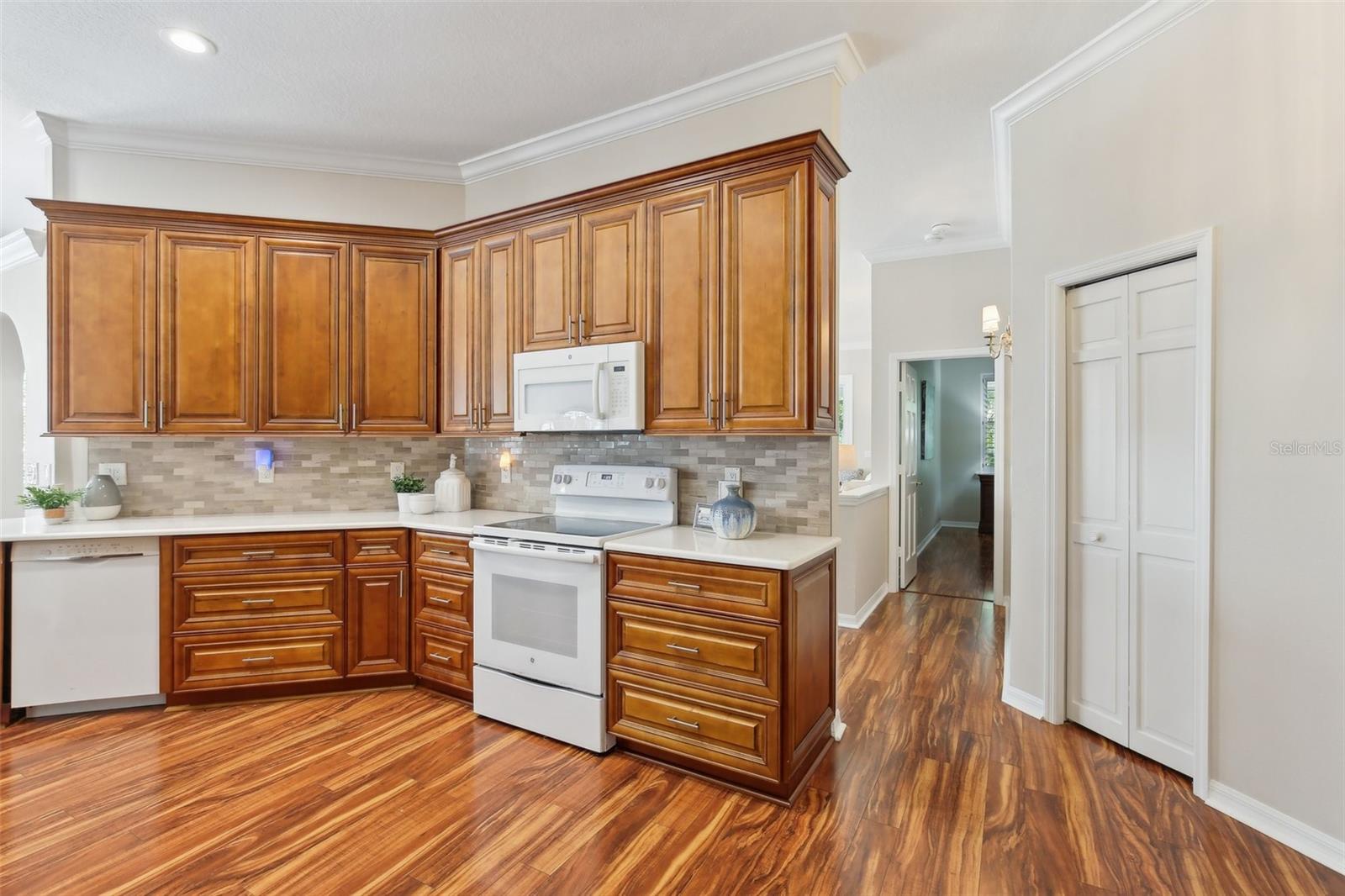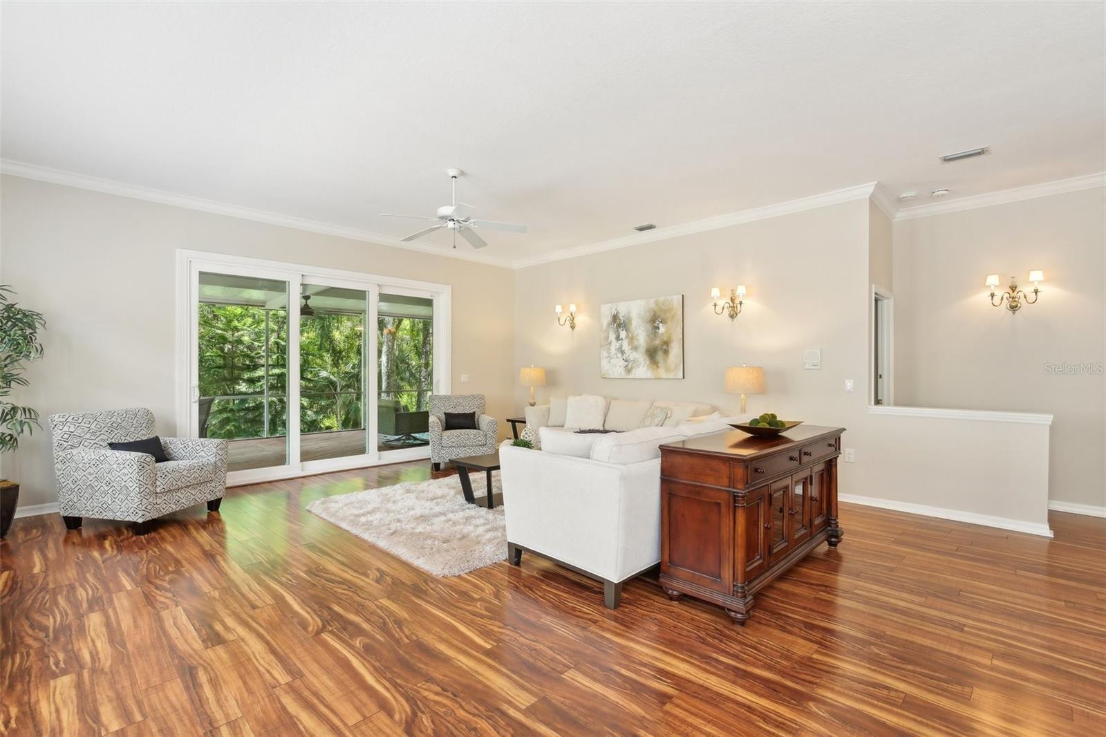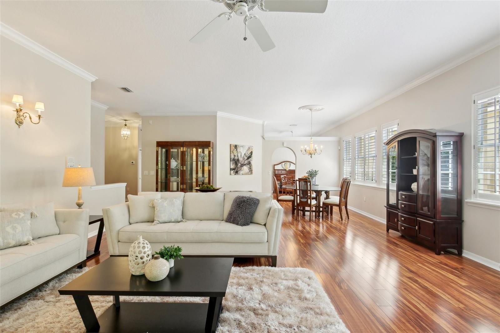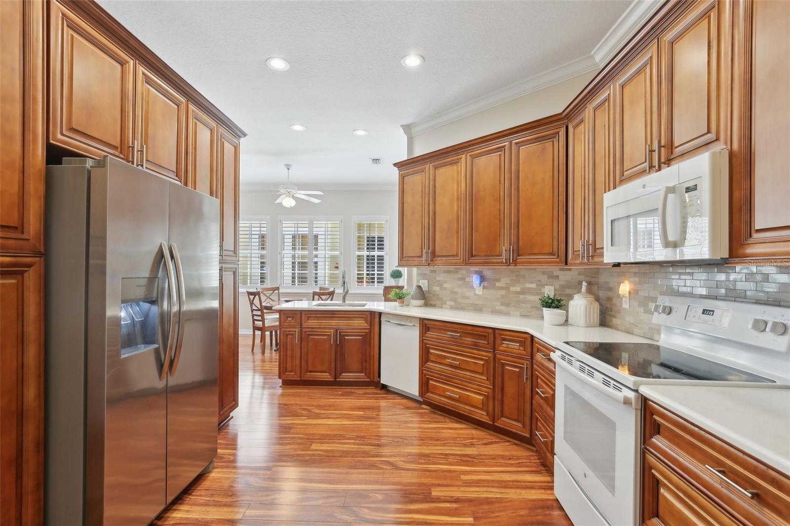 Discover exceptional value and worry-free living in this immaculate 2-bedroom, 2-bathroom home, perfectly situated on a private CONSERVATION LOT in a prime location in highly sought-after Tampa Palms! Move right in and enjoy peace of mind with major updates already completed: NEW ROOF, NEW AC, and NEW HURRICANE PROOF SLIDERS. The home has been FRESHLY PAINTED INSIDE AND OUT. Plus, slash your living expenses with FULLY PAID-OFF SOLAR PANELS offering extremely low electric bills! Step inside to find beautiful, WOOD LAMINATE FLOORING flowing throughout the entire home – NO CARPET! Elegant CROWN MOLDING adds a touch of sophistication, while stylish PLANTATION SHUTTERS provide privacy and charm. The stunningly REMODELED KITCHEN is a chef's delight, boasting tall 42” cabinets with crown molding, a chic TILE BACKSPLASH, and ample counter space. Relax in your private primary suite featuring an en suite bathroom with convenient dual sinks and a soothing GARDEN TUB. Step outside to the OVERSIZE, SCREENED IN LANAI, your perfect spot for morning coffee or evening relaxation, overlooking serene conservation views with NO REAR NEIGHBORS. The curb appeal is enhanced by a handsome pavered driveway. The second bedroom is massive, and easily can accommodate guests, home office, exercise room, or even the option to create a third bedroom, Tampa Palms is an AWARD-WINNING master planned community with five parks, TOP-RATED SCHOOLS and a private championship Arthur Hills designed golf course. Living in Tampa Palms offers access to AMENITIES GALORE, including access to nearby Compton Park, 2 sparkling POOLS, a kiddie SPLASH PAD, TENNIS and BASKETBALL courts, and a PLAYGROUND. Finally, the convenience factor cannot be overstated with easy access to shopping, restaurants, USF, the Moffitt, the VA and other hospitals, and major highways to take you anywhere you might want to go! If you're looking to be near Tampa Palms Golf and Country Club, this home is just minutes away! Don't miss this unique opportunity to own a fresh and clean, light and bright, energy-efficient home packed with premium features in a prime location. Schedule your showing today!