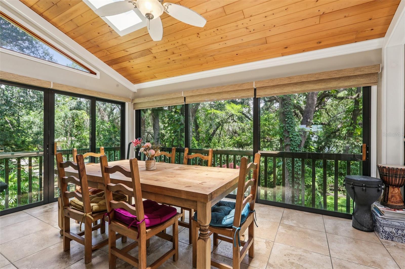 Motivated Seller! Experience the very best of Florida living in this stunning 3-bedroom, 2.5-bath custom-built home, perfectly situated on a lush, oversized lot that feels like your own private tropical oasis. From the moment you arrive, the home impresses with its fantastic curb appeal, 4-car carport, inviting wraparound porch, and beautifully landscaped lawn. Inside, soaring vaulted wood plank ceilings, abundant natural light from skylights and large windows, and an open floor plan create a bright and welcoming atmosphere. The spacious living room centers around a gorgeous stone wood-burning fireplace and your very own sauna (to be negotiated separately), while the formal dining area is framed by floor-to-ceiling windows and additional skylights. A chef’s dream kitchen awaits with custom white wood cabinetry, premium stainless steel appliances, granite countertops, a large center island with cooktop. The dining room has its own treetop view and abundant natural light. Upstairs, the expansive primary suite is a serene retreat with a sitting area, gleaming wood flooring, and a renovated walk-in closet with built-ins. The luxurious primary bath features a decorative pedestal sink and a beautifully tiled Jacuzzi tub. A second bedroom can function as a private second primary suite with its own updated en suite bath and access to a private balcony. Outdoor living is equally impressive, with an oversized fenced backyard shaded by mature trees, perfect for relaxing or entertaining. Additional highlights include two bonus rooms on the lower level, 20x20 ceramic tile flooring, plantation shutters, LED lighting, ceiling fans, paneled doors, a shed, and extra storage under the home. Recent upgrades include a new AC, blinds, exterior stairs, and a fully screened patio. Enjoy daily visits from local birds in your peaceful backyard, all while being just minutes from I-75 and near top-tier golfing, shopping, dining, and recreational options. This exceptional home offers a rare combination of comfort, style, and location—and it won’t last long!