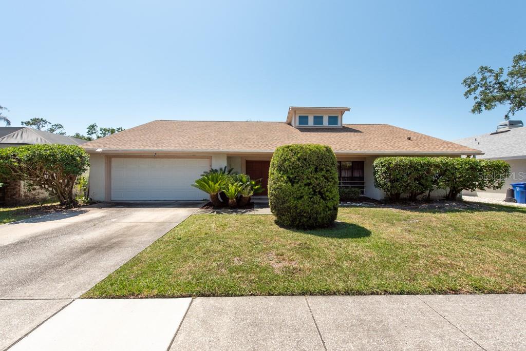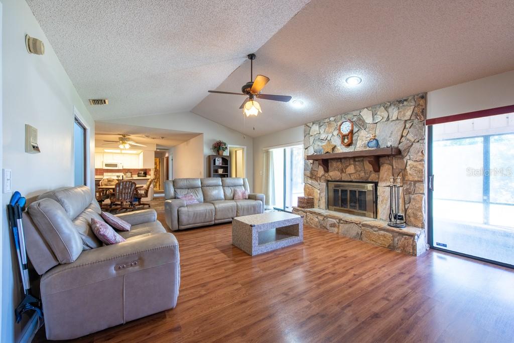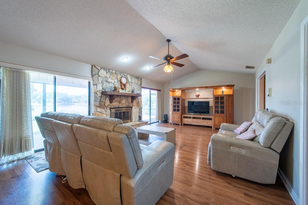 Nestled in the peaceful enclave of Hunter’s Lake—where just 74 homes share the quiet charm of a waterfront community—this 4-bedroom, 3-bathroom residence offers both space and serenity in one of the area’s most sought-after neighborhoods. From its thoughtfully designed split floor plan to its inviting backyard views of the lake, this 2,302-square-foot home strikes a perfect balance between functionality and warmth. Step through the front door and onto elegant marble flooring in the foyer, setting the tone for the home’s blend of classic and contemporary touches. Vaulted ceilings rise overhead in the carpeted living room, creating an airy sense of openness that continues throughout the main living spaces. The separate dining room offers an ideal setting for more formal gatherings, while the kitchen caters to everyday ease with a bar top for casual seating, an eat-in nook, a reverse osmosis system, and a water softener—all finished with matching marble floors. Unwind in the spacious family room, complete with a working fireplace, durable laminate flooring, and glass sliders that open to a covered and screened lanai—perfect for watching the sunset shimmer across the lake. The lanai extends your living space outdoors while offering uninterrupted waterfront views and privacy. The primary bedroom features laminate floors, a walk-in closet, and an ensuite bath with a tub/shower combination and single vanity. A private guest suite includes its own full bathroom with walk-in shower—ideal for visitors or multi-generational living. Two additional bedrooms, also with laminate flooring and ceiling fans, share a third full bath with a shower/tub combo and extended vanity. Additional highlights include a 2-car garage, hurricane-impact windows in the loft area, and a low annual HOA that helps preserve the neighborhood’s pristine character without unnecessary costs. With peaceful lake views, well-maintained interiors, and a location that feels tucked away yet close to everything—you’ll feel right at home in Hunter’s Lake.