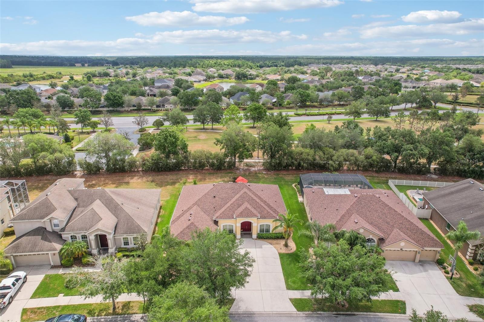 Elevated living can be yours in this stunning CALABRIA MODEL built by MI HOMES. This SINGLE STORY 4-bedroom, 3-bathroom plus OFFICE executive home is situated on a PREMIUM LOT offering serene park views in a desirable New Tampa location in sought after Easton Park! Perfectly positioned on a premium large lot just steps from the community amenities including pool and lush green park! Outstanding Curb Appeal with a side load garage, lush tropical palms, and professional landscaping. Enjoy peace of mind with a BRAND-NEW ROOF installed in 2024! Step inside and immediately notice the impressive ARCHITECTURAL DETAILS, including high ceilings, elegant tray ceilings, and decorative columns that define the formal living and dining areas. Gleaming HARD-SURFACE FLOORING flows throughout the entire home – ABSOLUTELY NO CARPET! One of the true standout features of this home is the OPEN CONCEPT KITCHEN AND FAMILY ROOM LAYOUT, perfect for gatherings. The HIGH-END KITCHEN boasts upgraded cabinetry with crown molding, sleek granite countertops, stainless steel appliances including DOUBLE OVENS, and a convenient BREAKFAST BAR overlooking the spacious family room. Experience true relaxation in the private primary suite, thoughtfully designed within a SPLIT FLOOR PLAN for maximum privacy. This retreat features direct slider access to the lanai and a spa-like en suite bathroom with dual, split vanities (including a dedicated vanity area), a LUXURIOUS GARDEN TUB, and a large walk-in shower. Uniquely, the dedicated office enjoys private access directly from the primary suite area – ideal for a seamless work-from-home setup! Enjoy the Florida lifestyle on the enclosed SCRRENED-IN LANAI, overlooking the peaceful park setting. The SIDE-ENTRANCE GARAGE enhances the home's attractive curb appeal. Modern convenience is integrated with SMART HOME TECHNOLOGY, including keypad entry, thermostat, fire alarm detector, and security system cameras. Plus, enjoy resort-style living just steps away from the community pool! This property delivers the perfect trifecta – desirable location, appealing style, and everyday functionality – thanks to meticulous upkeep and significant updates. Prime New Tampa location convenient to USF, Moffitt, AdventHealth & VA Hospitals, vibrant shopping and dining, houses of worship, and all the amenities of the sought after New Tampa area!