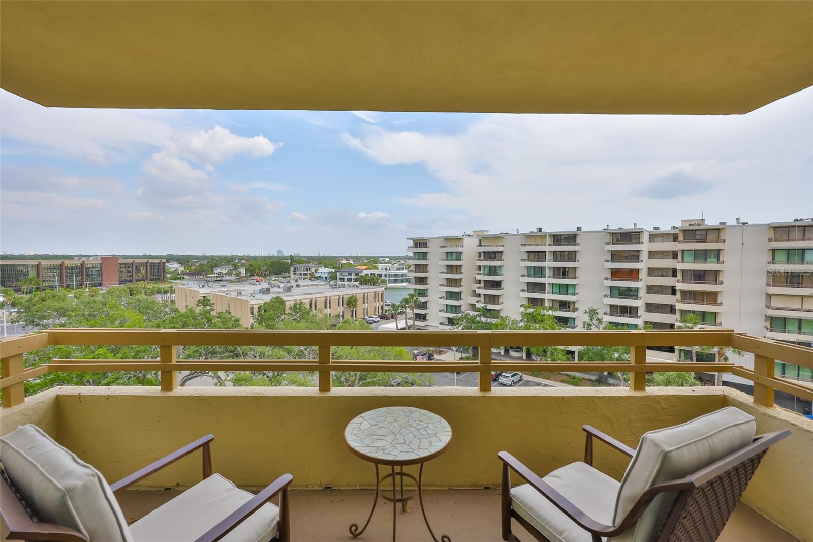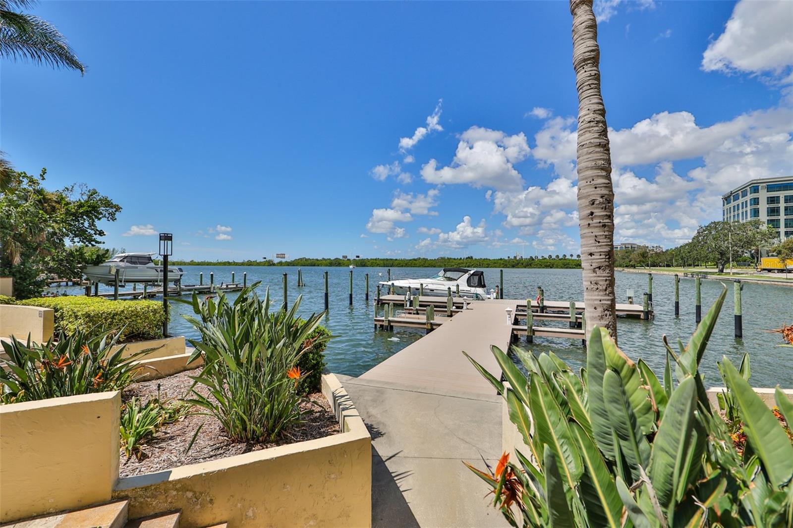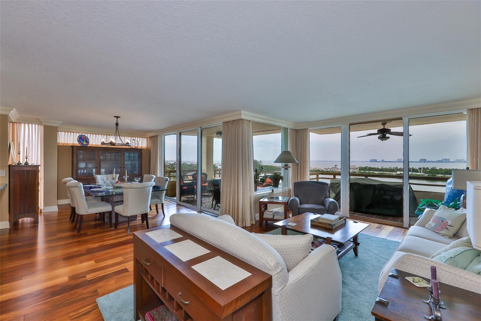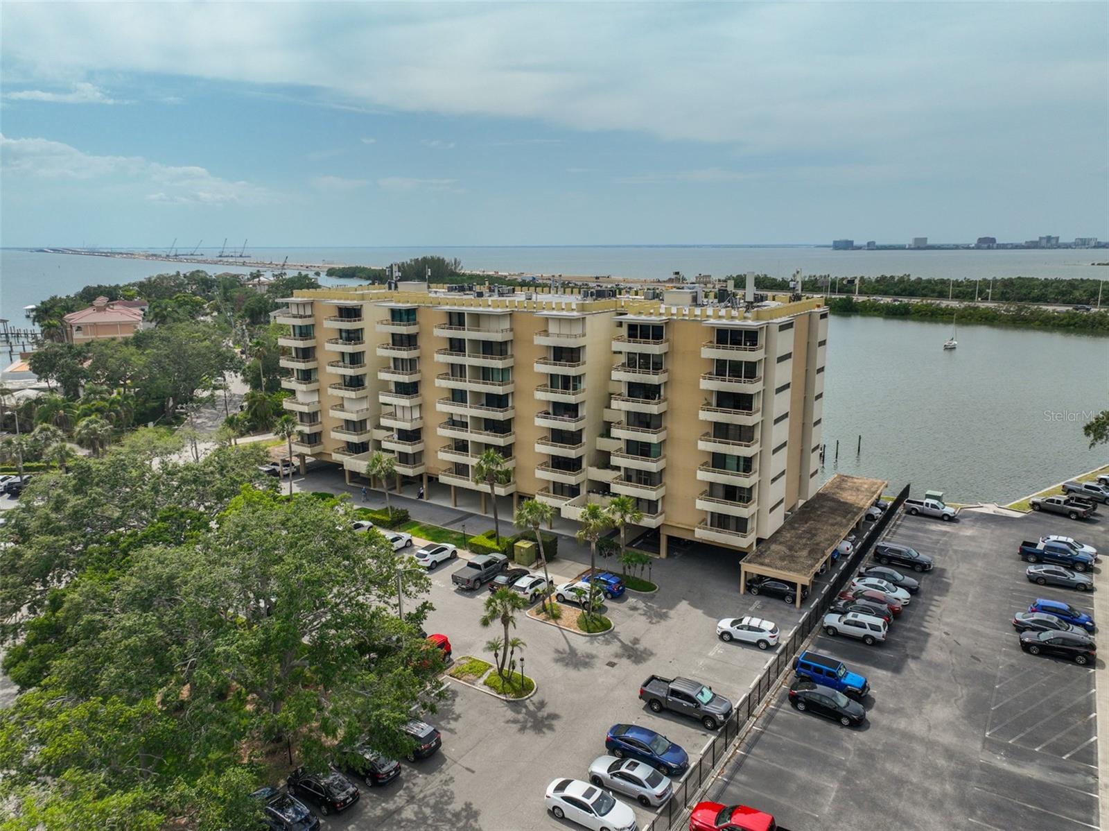 Experience breathtaking, panoramic water views of Tampa Bay from this rare 7th-floor end-unit gem! Enjoy stunning vistas of both the Tampa and St. Petersburg skylines from three private, covered balconies in this spacious 2-bedroom, 2.5-bath condo offering 1,964 square feet of elegant living space. This meticulously maintained residence features an open-concept layout with gleaming hardwood floors, updated wood cabinetry, granite countertops, and stainless-steel appliances. Floor-to-ceiling hurricane-rated sliding doors flood the living and dining areas with natural light and lead to a large west-facing balcony for the stunning water views - perfect for entertaining and taking in spectacular sunsets over the bay. The primary suite is a true retreat with new carpeting, a private balcony, and an updated ensuite bathroom. A second en-suite bedroom also offers its own private balcony and renovated bath, providing comfort and privacy for guests. The furniture is available as many pieces were specifically designed for this home. Resort-style amenities elevate the lifestyle, including a bayfront pool, private docks, game room, storage locker, and reserved parking. Perfectly situated just minutes from both downtown Tampa and St. Petersburg, Tampa International Airport, International Plaza, Raymond James Stadium, Hyde Park, SOHO, I275, and Route 4 - this location offers the ultimate in convenience and coastal living. Don't miss this unique opportunity to own a waterfront haven that delivers both luxury and lifestyle.