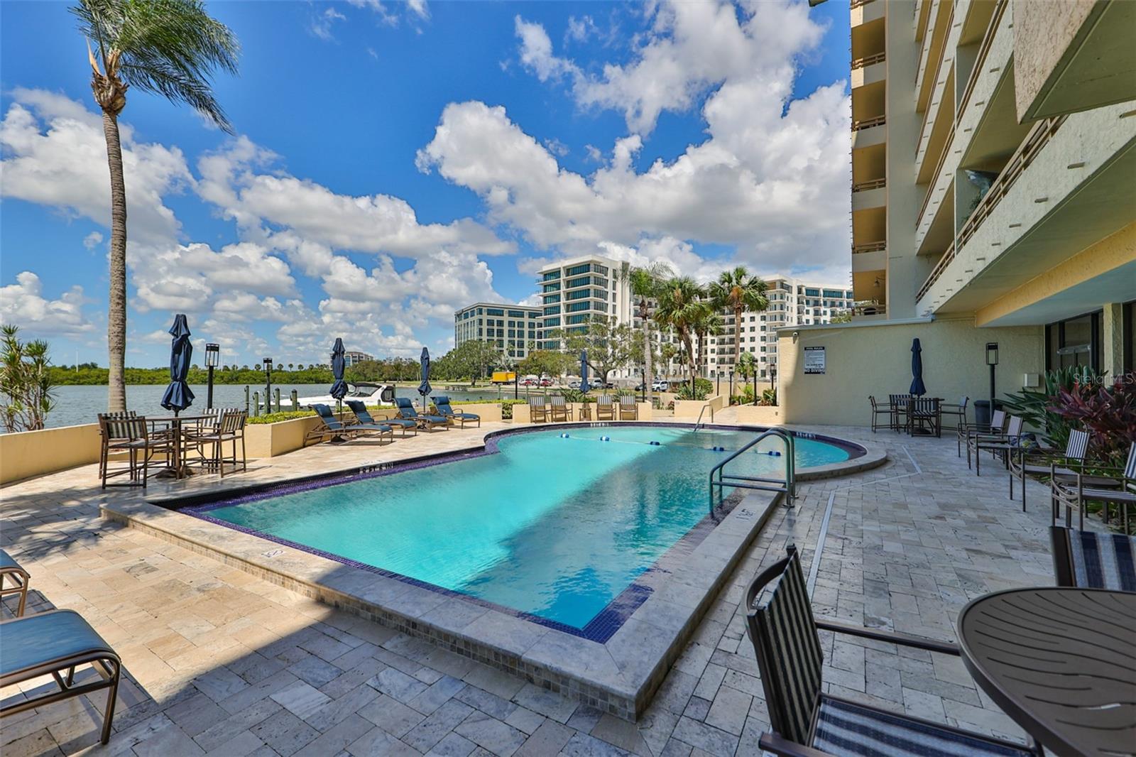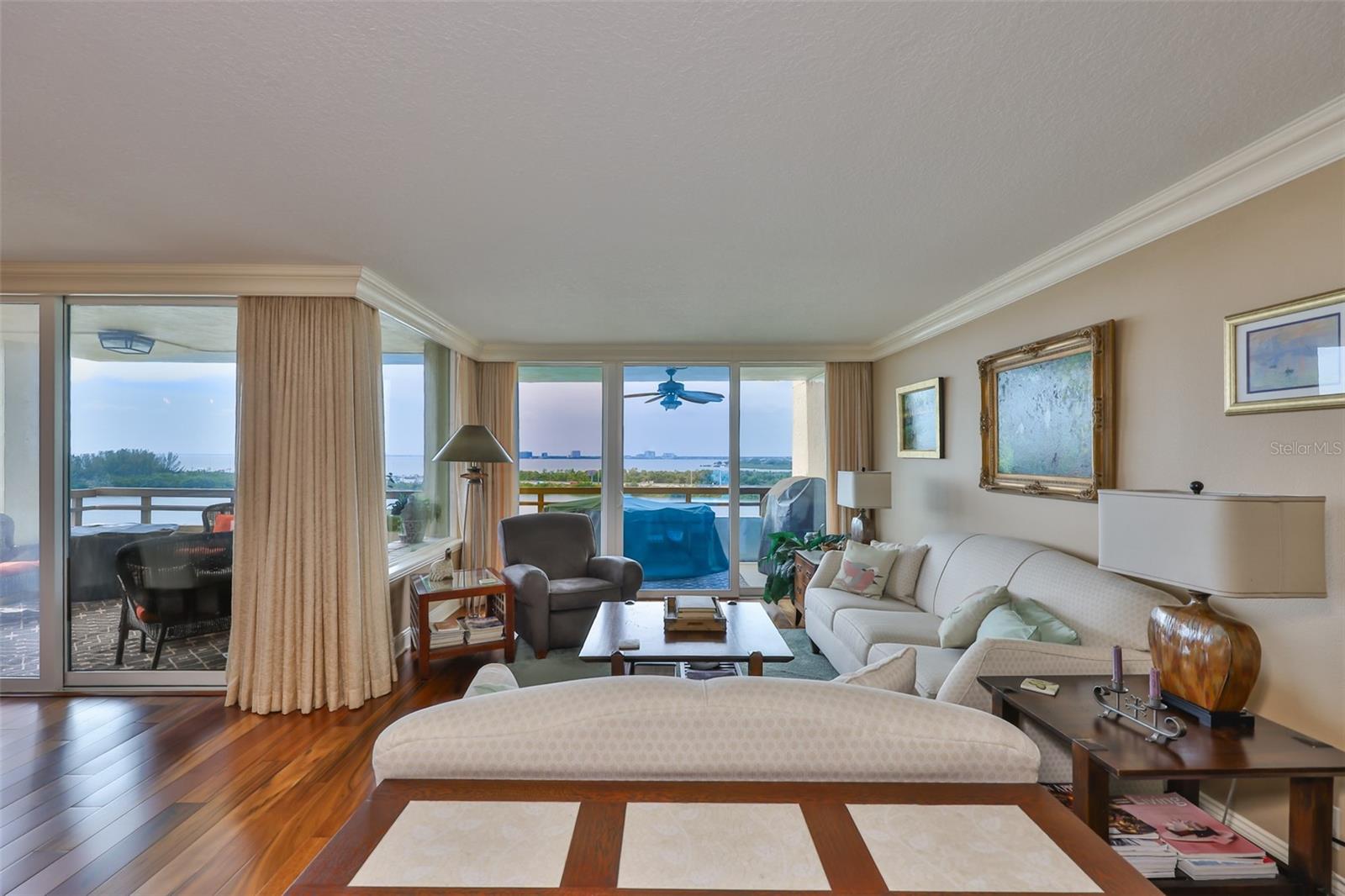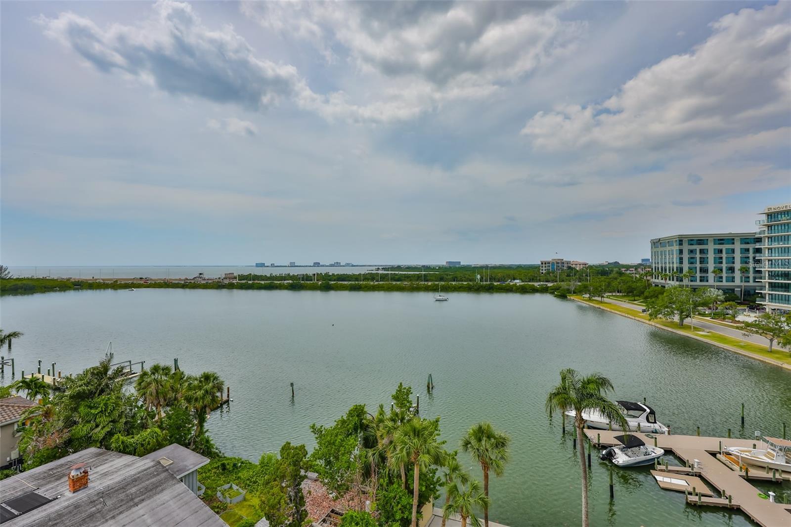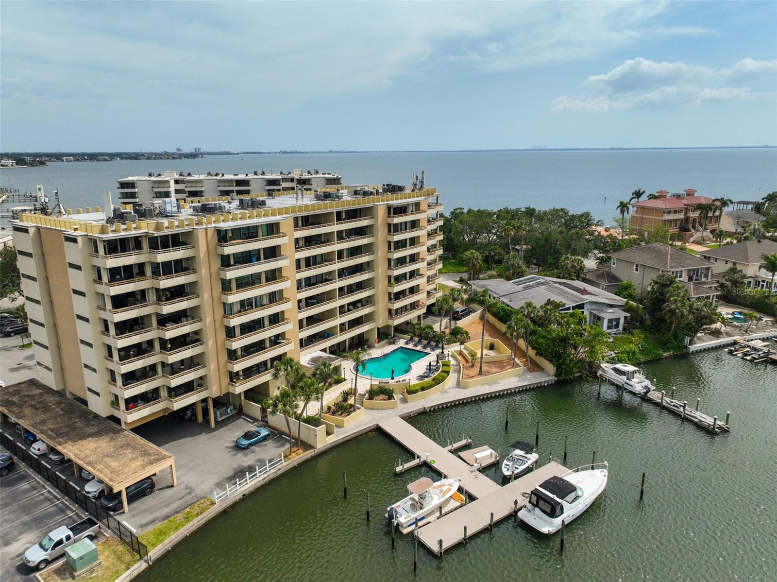 Experience breathtaking, panoramic water views of Tampa Bay from this rare 7th-floor end-unit gem! Enjoy stunning vistas of both the Tampa and St. Petersburg skylines from three private, covered balconies in this spacious 2-bedroom, 2.5-bath condo offering 1,964 square feet of elegant living space. This meticulously maintained residence features an open-concept layout with gleaming hardwood floors, updated wood cabinetry, granite countertops, and stainless-steel appliances. Floor-to-ceiling hurricane-rated sliding doors flood the living and dining areas with natural light and lead to a large west-facing balcony for the stunning water views - perfect for entertaining and taking in spectacular sunsets over the bay. The primary suite is a true retreat with new carpeting, a private balcony, and an updated ensuite bathroom. A second en-suite bedroom also offers its own private balcony and renovated bath, providing comfort and privacy for guests. The furniture is available as many pieces were specifically designed for this home. Resort-style amenities elevate the lifestyle, including a bayfront pool, private docks, game room, storage locker, and reserved parking. Perfectly situated just minutes from both downtown Tampa and St. Petersburg, Tampa International Airport, International Plaza, Raymond James Stadium, Hyde Park, SOHO, I275, and Route 4 - this location offers the ultimate in convenience and coastal living. Don't miss this unique opportunity to own a waterfront haven that delivers both luxury and lifestyle.
