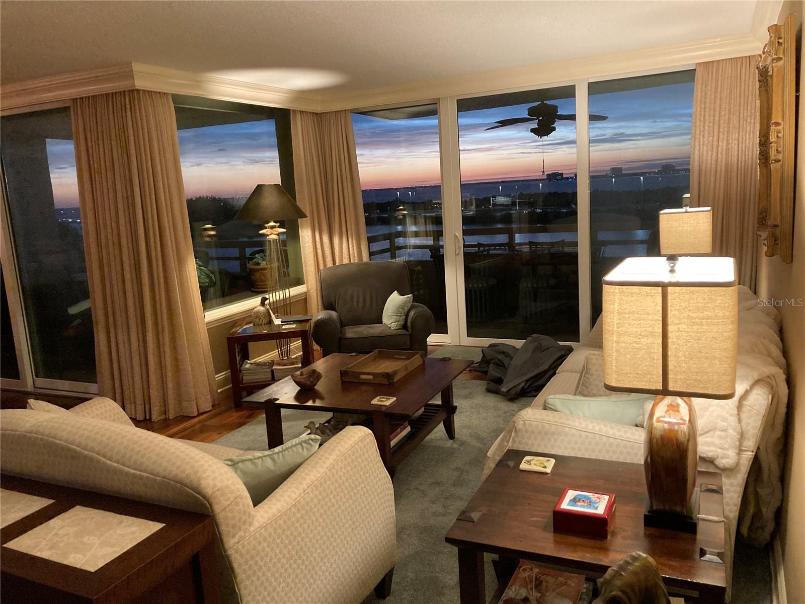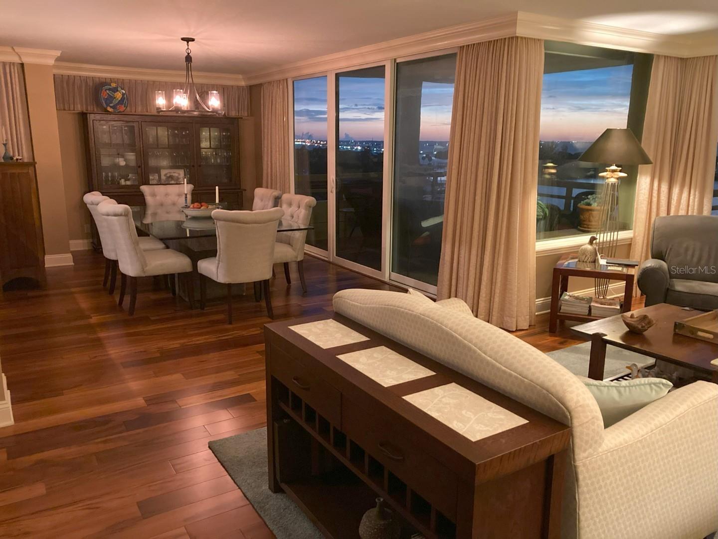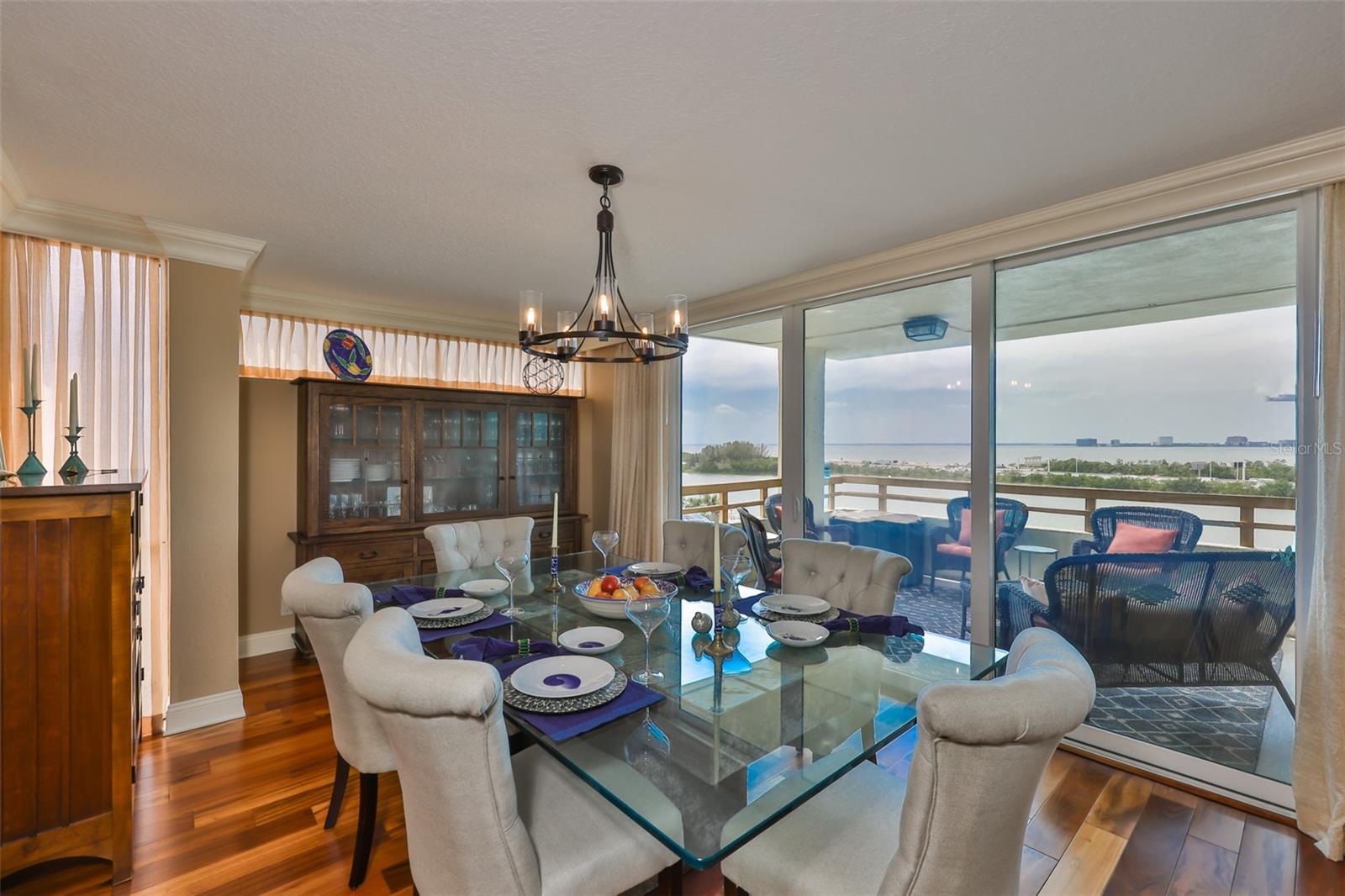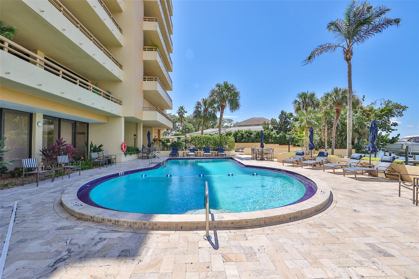 Experience breathtaking, panoramic water views of Tampa Bay from this rare 7th-floor end-unit gem! Enjoy stunning vistas of both the Tampa and St. Petersburg skylines from three private, covered balconies in this spacious 2-bedroom, 2.5-bath condo offering 1,964 square feet of elegant living space. This meticulously maintained residence features an open-concept layout with gleaming hardwood floors, updated wood cabinetry, granite countertops, and stainless-steel appliances. Floor-to-ceiling hurricane-rated sliding doors flood the living and dining areas with natural light and lead to a large west-facing balcony for the stunning water views - perfect for entertaining and taking in spectacular sunsets over the bay. The primary suite is a true retreat with new carpeting, a private balcony, and an updated ensuite bathroom. A second en-suite bedroom also offers its own private balcony and renovated bath, providing comfort and privacy for guests. The furniture is available as many pieces were specifically designed for this home. Resort-style amenities elevate the lifestyle, including a bayfront pool, private docks, game room, storage locker, and reserved parking. Perfectly situated just minutes from both downtown Tampa and St. Petersburg, Tampa International Airport, International Plaza, Raymond James Stadium, Hyde Park, SOHO, I275, and Route 4 - this location offers the ultimate in convenience and coastal living. Don't miss this unique opportunity to own a waterfront haven that delivers both luxury and lifestyle.