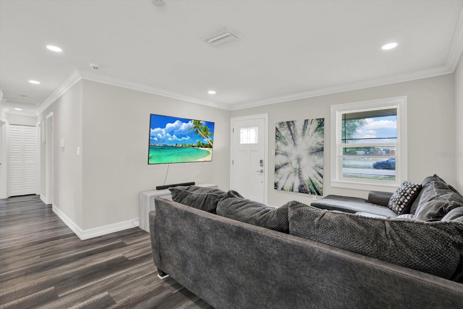 Preferred Lender Incentive! Use towards buying your rate down, closing costs or pre-paids. This beautifully updated 3-bedroom, 2-bath home sits on an oversized corner lot. Inside, enjoy an open floor plan with durable vinyl flooring, a modern chef’s kitchen, and dining area. To the left is a separate living space that offers great natural light, carport access, and an oversized laundry room with ample storage and counter space. On the other side of the home are your two additional bedrooms, a full guest bath, and a private primary suite with en suite bath. Outside, the fully fenced yard features two storage sheds and a mature avocado tree. With a metal roof, recent updates and no flood zone designation, this home provides an easy move in and a peace of mind.