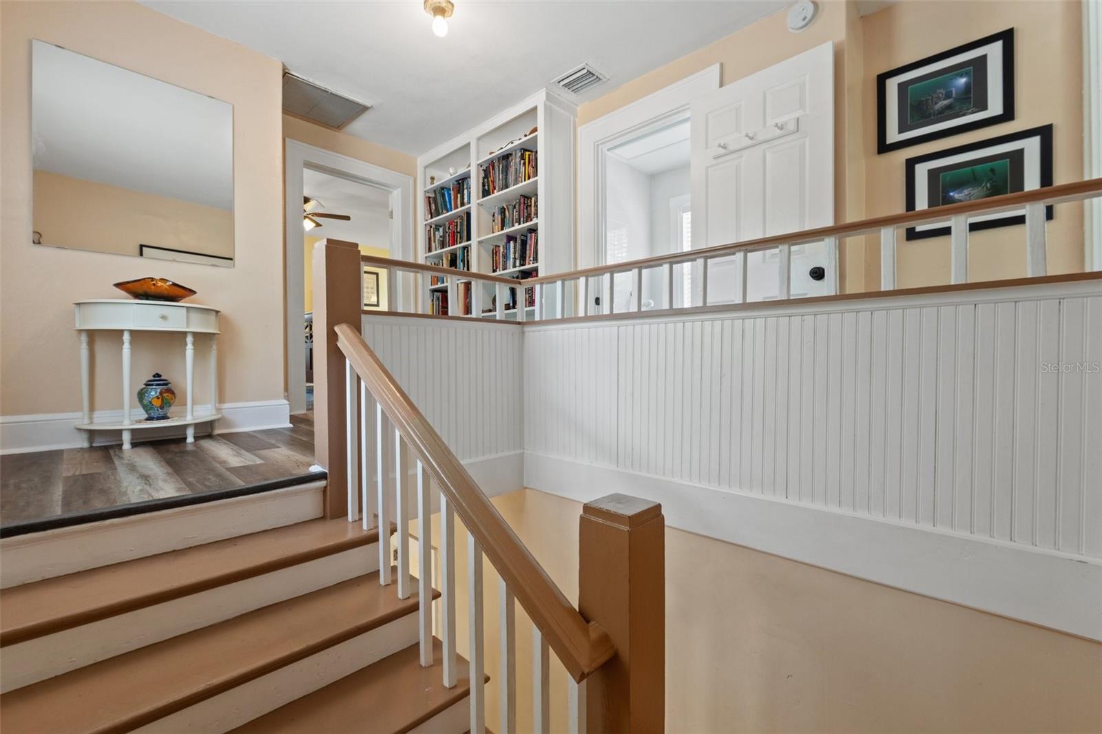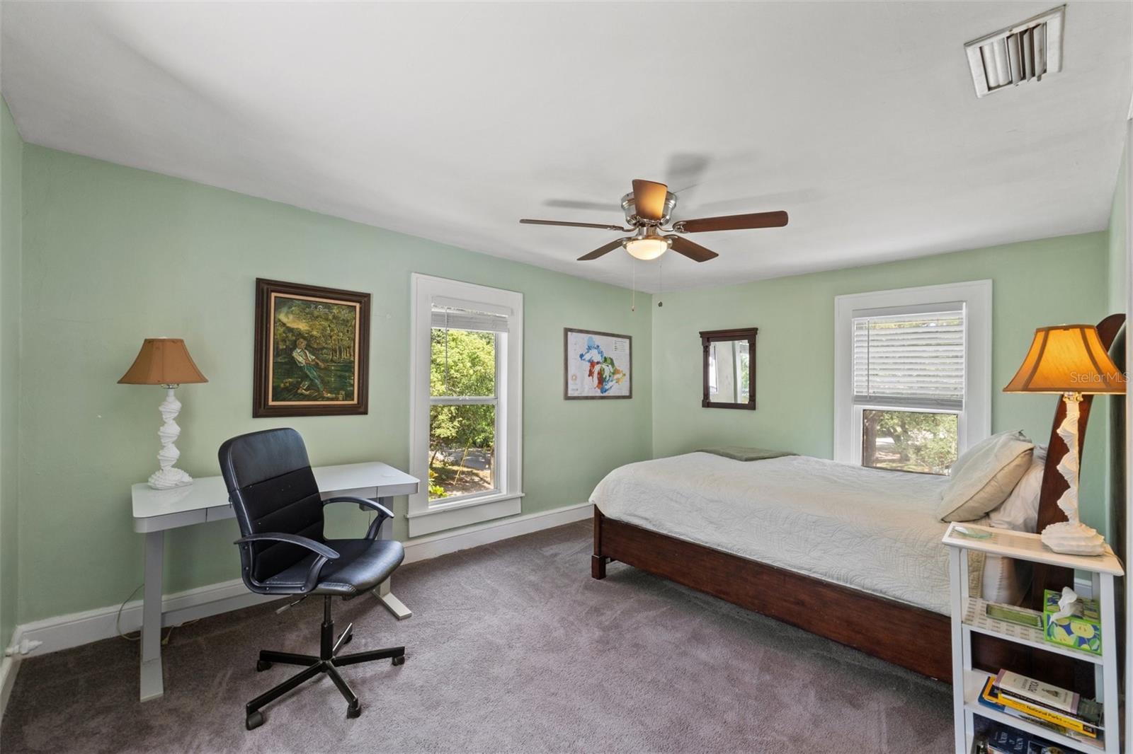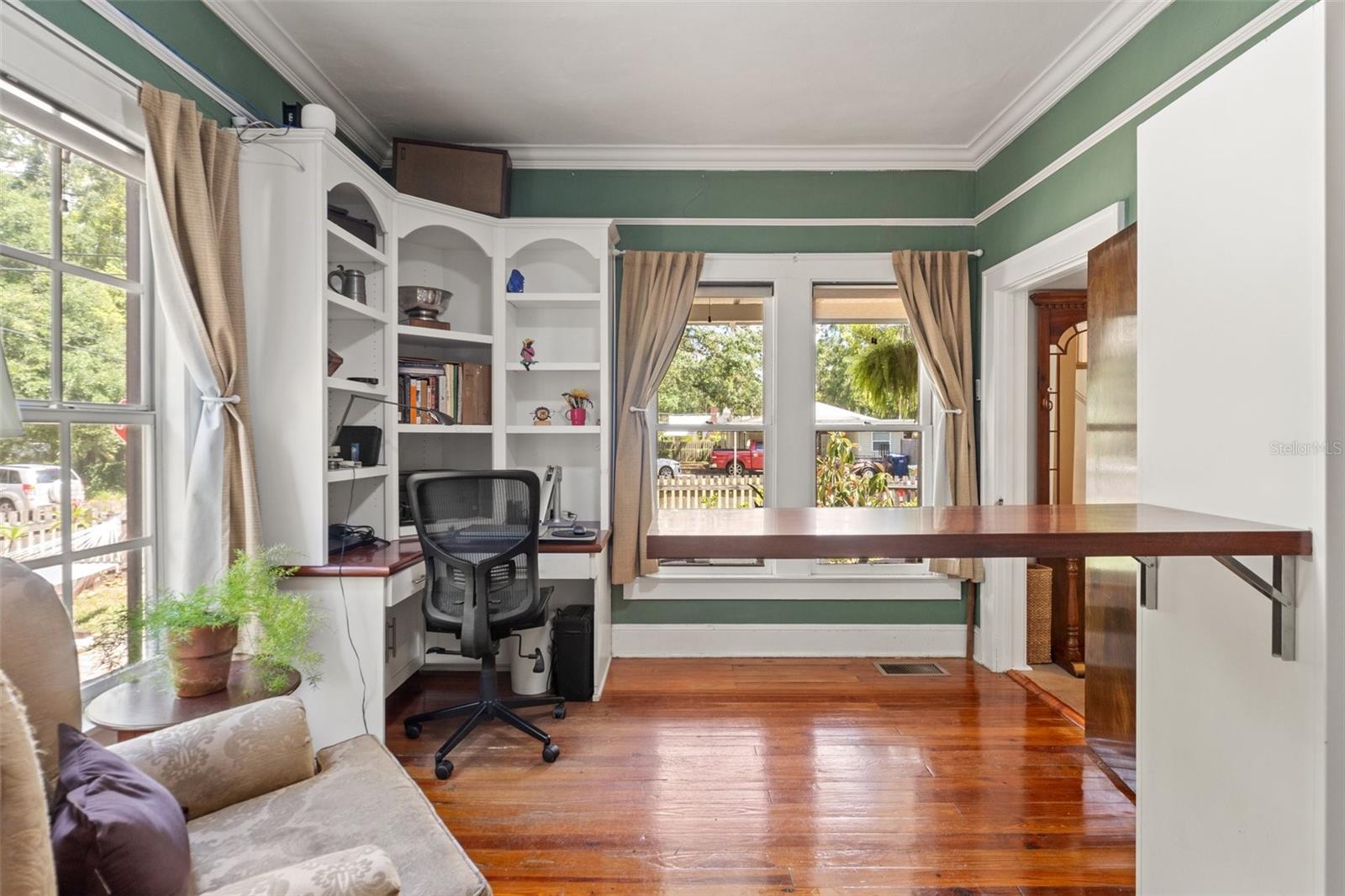 Don’t miss this incredible opportunity to own a charming 1920s bungalow with an income-producing in-law suite! This rare two-story, corner lot home is located in desirable Northeast Seminole Heights—just minutes from downtown Tampa, major highways, and popular dining and coffee spots. The main residence features 3 spacious bedrooms, 2 full bathrooms, beautiful original hardwood floors, and abundant natural light streaming through vintage windows. The kitchen offers custom cabinetry, warm wood accents, and tile countertop that is charming and functional. The attached in-law suite has its own private entrance and boasts vaulted ceilings, skylights, large windows, a kitchenette, and an oversized, handicap accessible shower—perfect for guests, rental income, multi-generational living or a private workspace. This space can also be used as an oversized, private primary bedroom with a private entrance. It also has plenty of room to be used as a studio, work or play space. This would then create a split floor plan, boasting a 4 bedroom/3-bathroom main home. Enjoy outdoor living on the welcoming covered front porch, ideal for morning coffee or evening relaxation. The fully fenced courtyard garden features mature landscaping, paved seating, and a BBQ area. Inside, additional highlights include a sunlit dining room with soaring ceilings and walls of windows, a cozy wood-burning fireplace, and generous storage throughout. Situated 30 feet above sea level—no flood insurance required—this home also offers a durable metal roof (2016) with decades of life ahead. Nestled in a vibrant neighborhood near the Hillsborough River, this lovingly maintained property offers timeless charm, modern versatility, and unbeatable location.