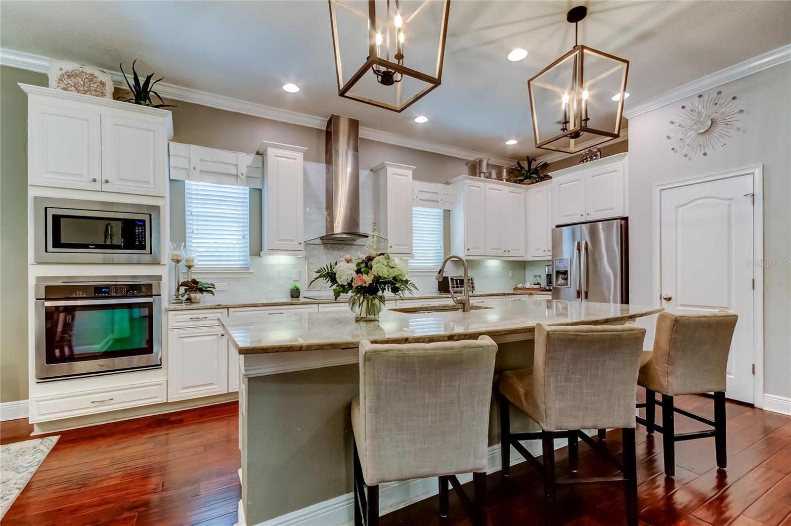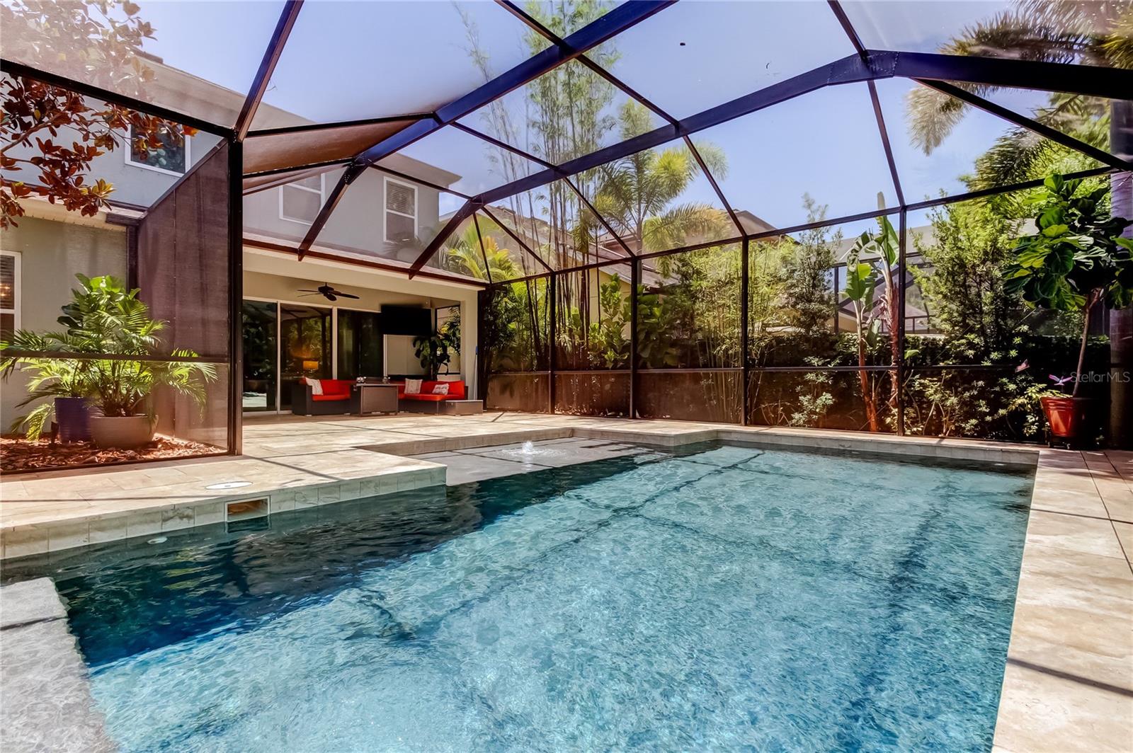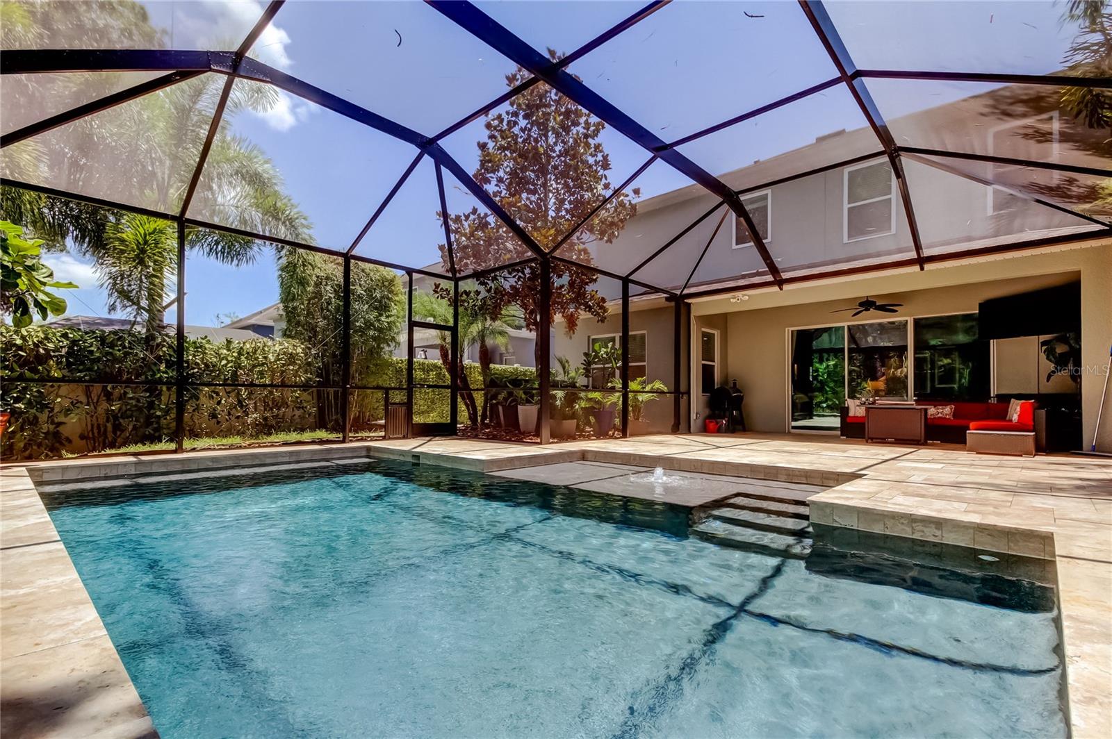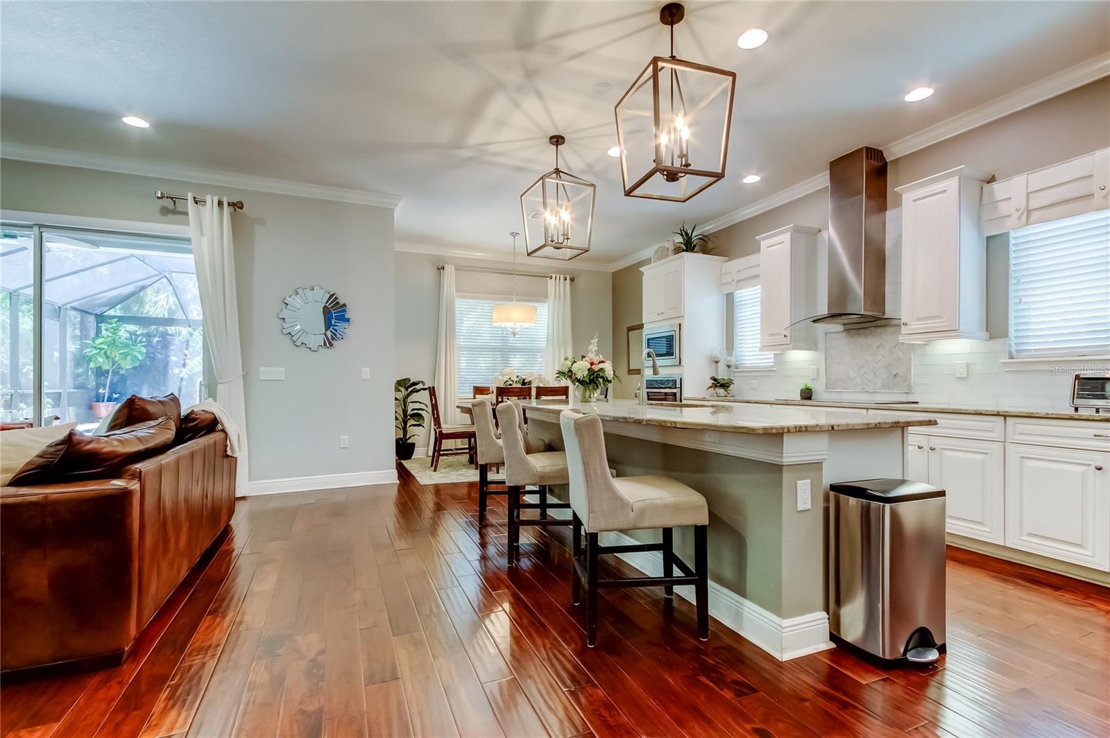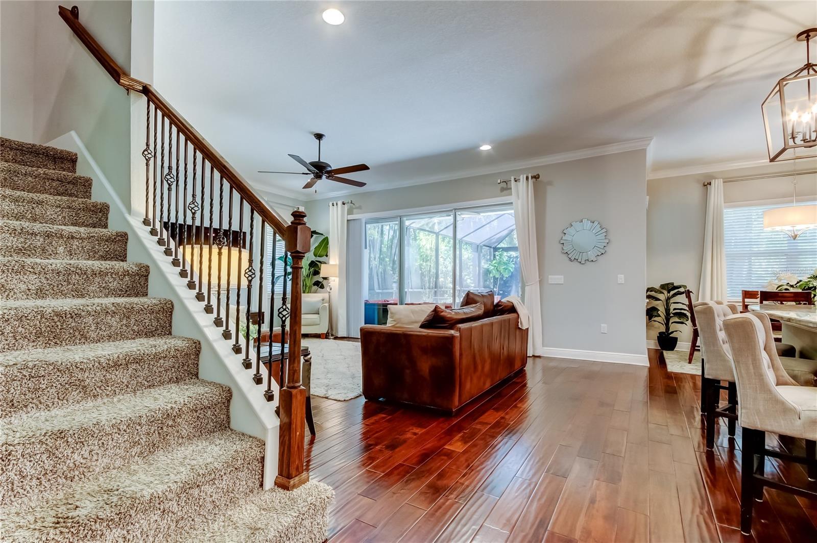 Welcome to this beautifully updated 4-bedroom, 3-bathroom pool home in the highly sought-after Champions Forest neighborhood. Set on a premium conservation lot, this home offers a functional layout, designer upgrades, and a tropical resort style backyard built for year-round Florida living. This home is truly turn-key and loaded with upgrades. Inside, you’ll find rich engineered hardwood floors, elegant crown molding, and upgraded light fixtures throughout the main level. The heart of the home is the gourmet kitchen, featuring a large granite island, 42” white wood cabinets with crown, glass tile backsplash, and a stunning mosaic marble accent under the custom range hood. Built-in stainless steel appliances include a wall oven, microwave, and sleek cooktop with hood. The first-floor bedroom and full bath are perfect for guests or multigenerational living, with a new vanity, upgraded walk-in shower, and wood-look tile finishes. Upstairs, the primary suite features a tray ceiling, crown molding, and a luxurious en-suite bath featuring new quartz vanity with dual sinks, walk-in shower, and a large walk-in closet. Two additional guest bedrooms share a full bath (also with new quartz vanity)—one with direct bathroom access—and a versatile bonus room provides the ideal space for an office, playroom, or second living area. Ceiling fans throughout add comfort and efficiency. Step outside to your tropical resort-style backyard with a heated saltwater pool, sun shelf with bubbler, and travertine decking. The panoramic screen enclosure includes no-see-um screening and a dog door for convenience. The extended lanai, tropical landscaping, outdoor lighting, and French drain system create a relaxing and private outdoor oasis. Located minutes from great rated schools, parks, biking trails, Westchase, shopping, dining, the YMCA, and just 15 minutes to Tampa International Airport and 20 minutes to the Gulf beaches—this home blends luxury, function, and location.