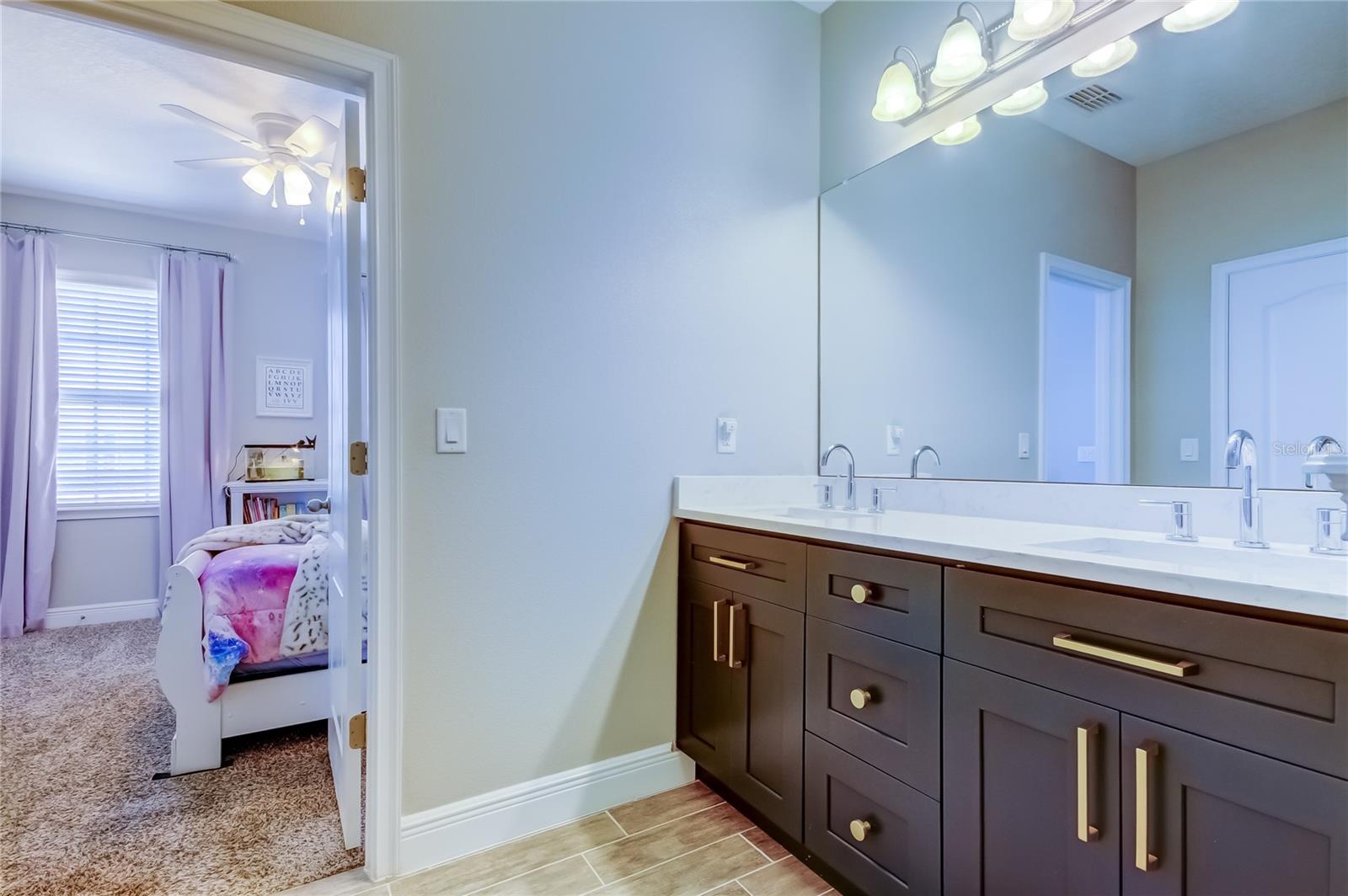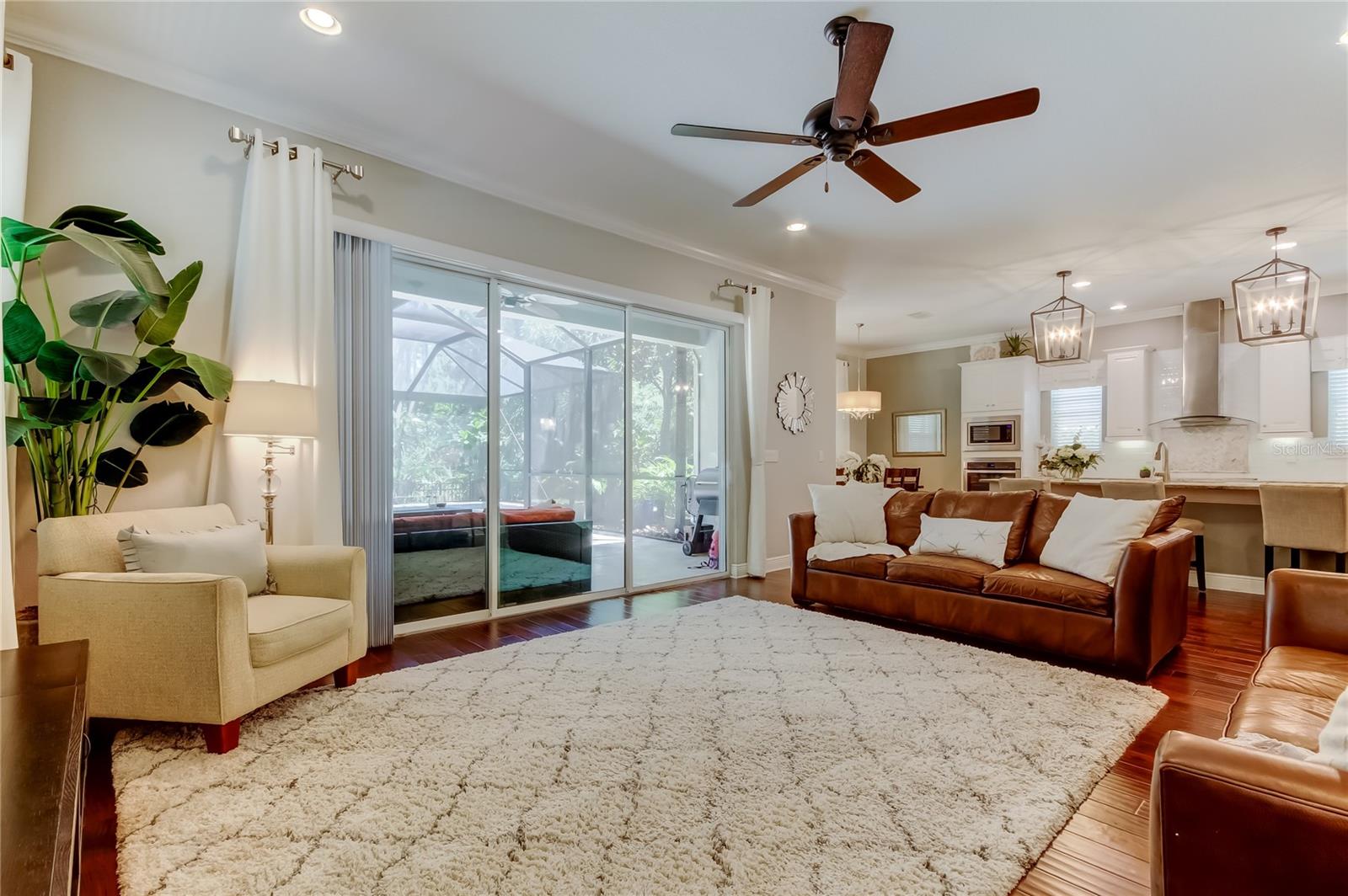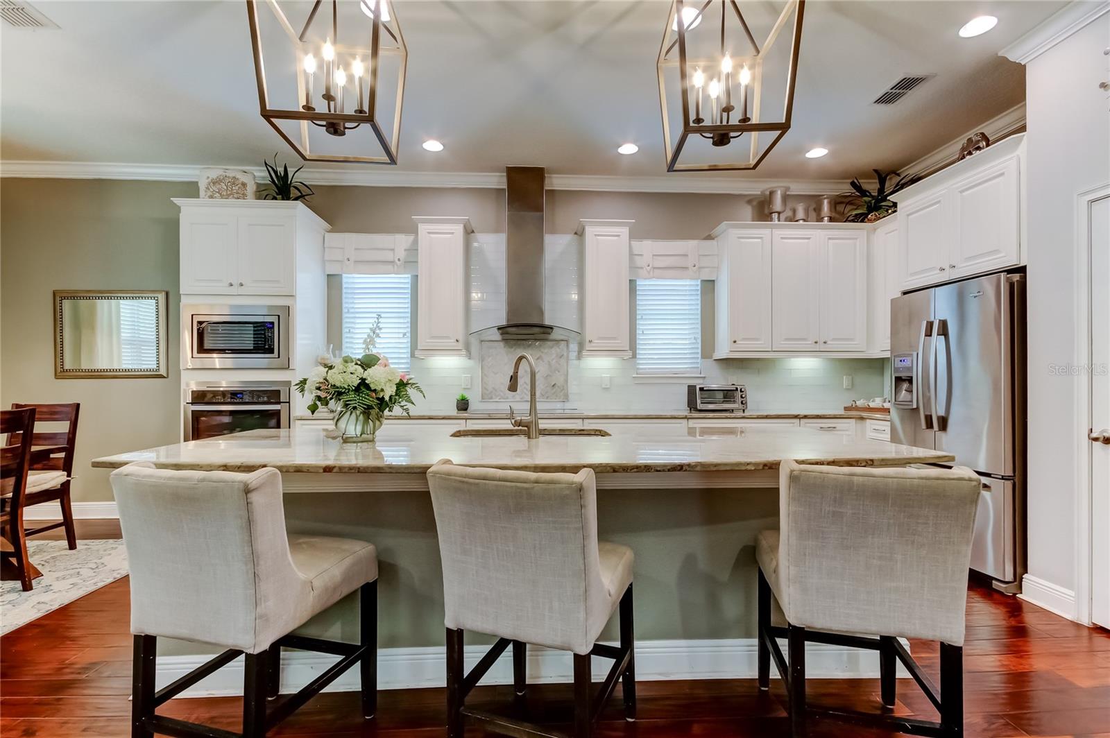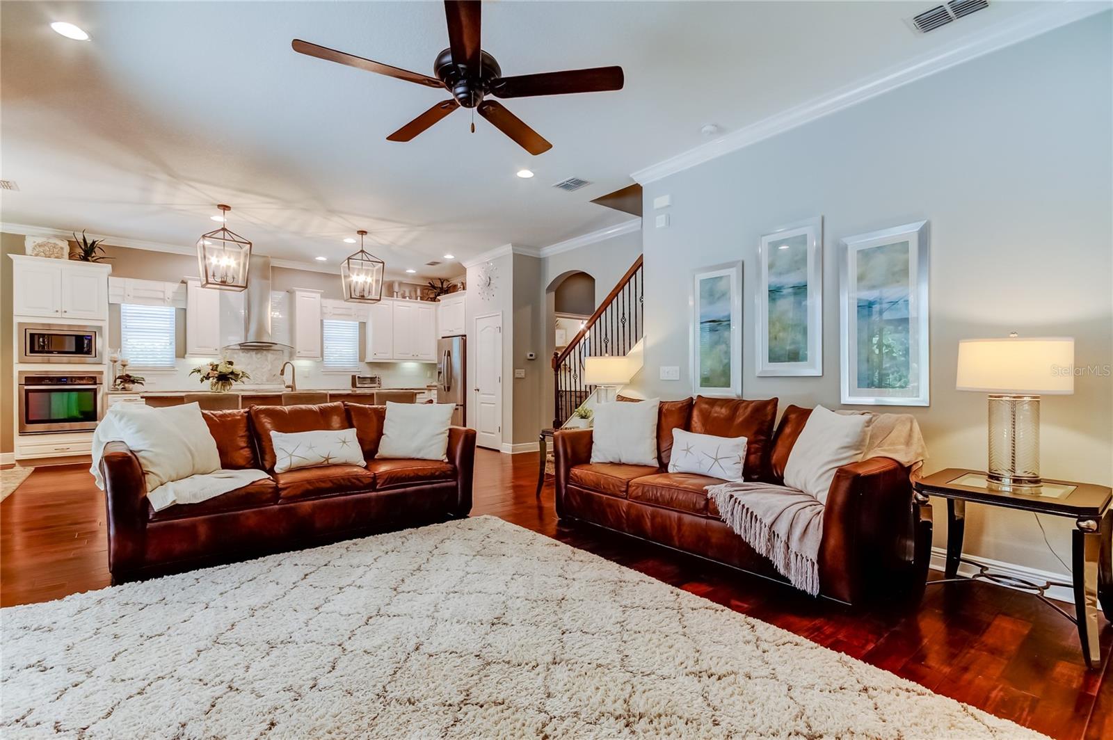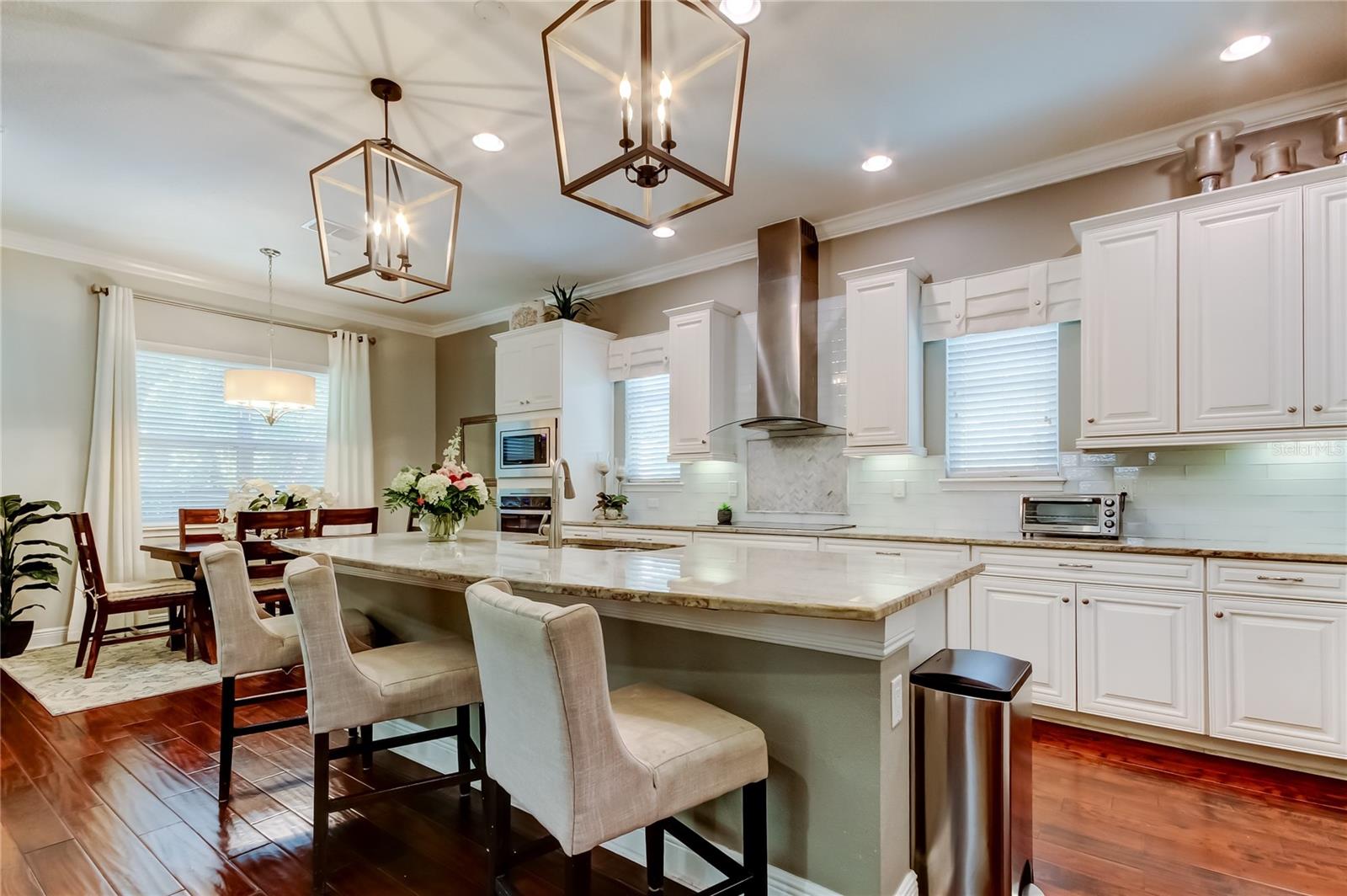 Welcome to this beautifully updated 4-bedroom, 3-bathroom pool home in the highly sought-after Champions Forest neighborhood. Set on a premium conservation lot, this home offers a functional layout, designer upgrades, and a tropical resort style backyard built for year-round Florida living. This home is truly turn-key and loaded with upgrades. Inside, you’ll find rich engineered hardwood floors, elegant crown molding, and upgraded light fixtures throughout the main level. The heart of the home is the gourmet kitchen, featuring a large granite island, 42” white wood cabinets with crown, glass tile backsplash, and a stunning mosaic marble accent under the custom range hood. Built-in stainless steel appliances include a wall oven, microwave, and sleek cooktop with hood. The first-floor bedroom and full bath are perfect for guests or multigenerational living, with a new vanity, upgraded walk-in shower, and wood-look tile finishes. Upstairs, the primary suite features a tray ceiling, crown molding, and a luxurious en-suite bath featuring new quartz vanity with dual sinks, walk-in shower, and a large walk-in closet. Two additional guest bedrooms share a full bath (also with new quartz vanity)—one with direct bathroom access—and a versatile bonus room provides the ideal space for an office, playroom, or second living area. Ceiling fans throughout add comfort and efficiency. Step outside to your tropical resort-style backyard with a heated saltwater pool, sun shelf with bubbler, and travertine decking. The panoramic screen enclosure includes no-see-um screening and a dog door for convenience. The extended lanai, tropical landscaping, outdoor lighting, and French drain system create a relaxing and private outdoor oasis. Located minutes from great rated schools, parks, biking trails, Westchase, shopping, dining, the YMCA, and just 15 minutes to Tampa International Airport and 20 minutes to the Gulf beaches—this home blends luxury, function, and location.