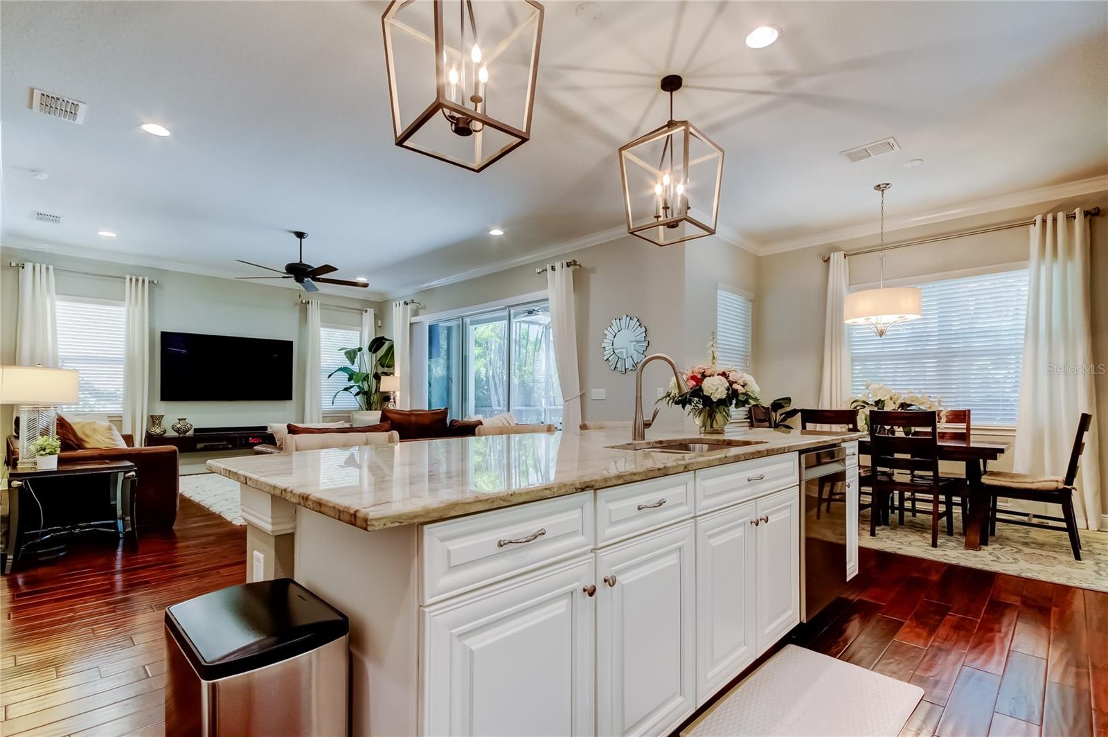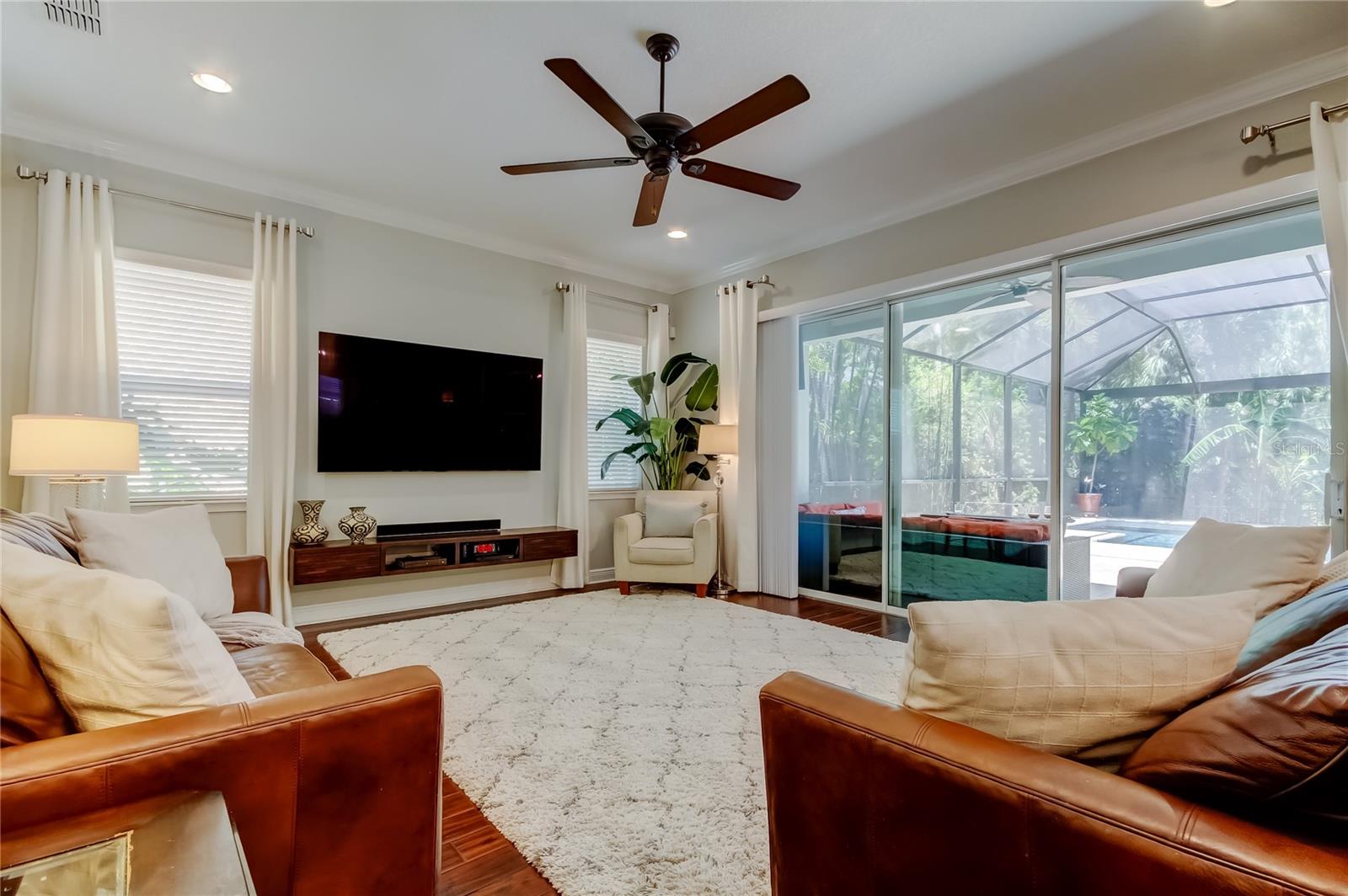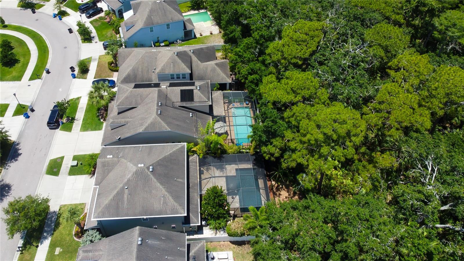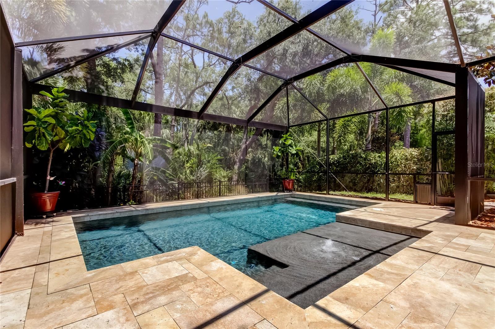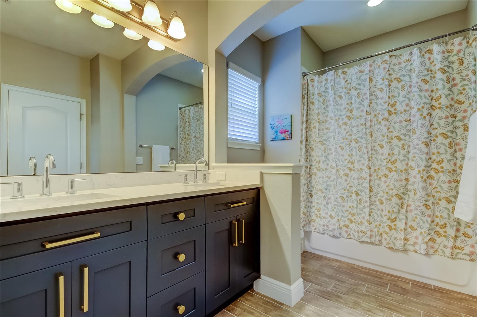 Welcome to this beautifully updated 4-bedroom, 3-bathroom pool home in the highly sought-after Champions Forest neighborhood. Set on a premium conservation lot, this home offers a functional layout, designer upgrades, and a tropical resort style backyard built for year-round Florida living. This home is truly turn-key and loaded with upgrades. Inside, you’ll find rich engineered hardwood floors, elegant crown molding, and upgraded light fixtures throughout the main level. The heart of the home is the gourmet kitchen, featuring a large granite island, 42” white wood cabinets with crown, glass tile backsplash, and a stunning mosaic marble accent under the custom range hood. Built-in stainless steel appliances include a wall oven, microwave, and sleek cooktop with hood. The first-floor bedroom and full bath are perfect for guests or multigenerational living, with a new vanity, upgraded walk-in shower, and wood-look tile finishes. Upstairs, the primary suite features a tray ceiling, crown molding, and a luxurious en-suite bath featuring new quartz vanity with dual sinks, walk-in shower, and a large walk-in closet. Two additional guest bedrooms share a full bath (also with new quartz vanity)—one with direct bathroom access—and a versatile bonus room provides the ideal space for an office, playroom, or second living area. Ceiling fans throughout add comfort and efficiency. Step outside to your tropical resort-style backyard with a heated saltwater pool, sun shelf with bubbler, and travertine decking. The panoramic screen enclosure includes no-see-um screening and a dog door for convenience. The extended lanai, tropical landscaping, outdoor lighting, and French drain system create a relaxing and private outdoor oasis. Located minutes from great rated schools, parks, biking trails, Westchase, shopping, dining, the YMCA, and just 15 minutes to Tampa International Airport and 20 minutes to the Gulf beaches—this home blends luxury, function, and location.